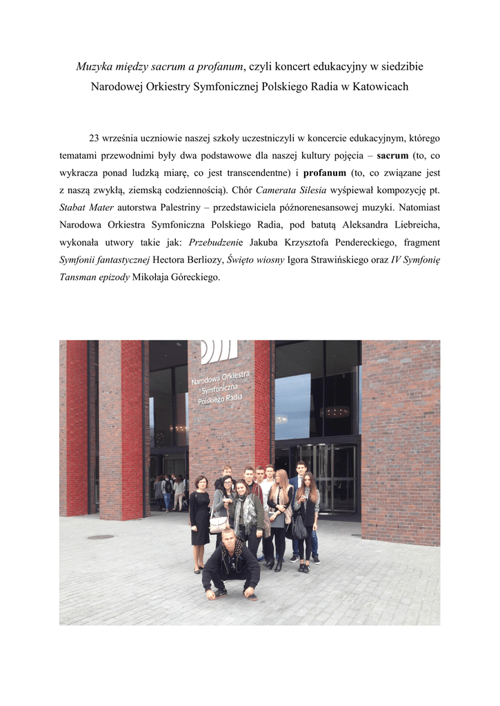 Muzyka między sacrum a profanum, czyli koncert edukacyjny w siedzibie Narodowej Orkiestry Symfonicznej Polskiego Radia w Katowicach 23 września uczniowie naszej szkoły uczestniczyli w koncercie edukacyjnym, którego tematami przewodnimi były dwa podstawowe dla naszej kultury pojęcia – sacrum (to, co wykracza ponad ludzką miarę, co jest transcendentne) i profanum (to, co związane jest z naszą zwykłą, ziemską codziennością). Chór Camerata Silesia wyśpiewał kompozycję pt. Stabat Mater autorstwa Palestriny – przedstawiciela późnorenesansowej muzyki. Natomiast Narodowa Orkiestra Symfoniczna Polskiego Radia, pod batutą Aleksandra Liebreicha, wykonała utwory takie jak: Przebudzenie Jakuba Krzysztofa Pendereckiego, fragment Symfonii fantastycznej Hectora Berliozy, Święto wiosny Igora Strawińskiego oraz IV Symfonię Tansman epizody Mikołaja Góreckiego.