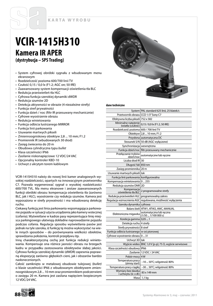 k a r ta w y r o b u VCIR-1415H310 Kamera IR APER (dystrybucja – SPS Trading) • System cyfrowej obróbki sygnału z wbudowanym menu ekranowym • Rozdzielczość pozioma 600/700 linii TV • Czułość 0,15 / 0,0 lx (F1.2; AGC on; 50 IRE) • Zaawansowany system kompensacji oświetlenia tła BLC • Redukcja prześwietleń tła HLC • Cyfrowa funkcja szerokiej dynamiki dWDR • Redukcja szumów 2D • Detekcja aktywności w obrazie (4 niezależne strefy) • Funkcja stref prywatności • Funkcja dzień / noc (filtr IR przesuwany mechanicznie) • Cyfrowe wyostrzenie obrazu • Redukcja winietowania • Funkcja odbicia lustrzanego MIRROR • Funkcja linii parkowania • Usuwanie martwych pikseli • Zmiennoogniskowy obiektyw 2,8 ... 10 mm; F1.2 • Promiennik IR (wbudowanych 30 diod) • Zasięg świecenia do 20 m • Obudowa cylindryczna typu bullet • Klasa szczelności IP66 • Zasilanie niskonapięciowe 12 VDC/24 VAC • Opcjonalny kontroler KBD-10 • Uchwyt z ukrytym torem kablowym VCIR-1415H310 należy do nowej linii kamer analogowych wysokiej rozdzielczości, opartych na innowacyjnym przetworniku C7. Pozwala wygenerować sygnał o wysokiej rozdzielczości 600/700 TVL. Ma menu ekranowe i zestaw zaawansowanych funkcji obróbki obrazu: kompensacja oświetlenia tła (zarówno BLC, jak i HLC), wyostrzenie czy redukcja szumów. Kamera jest wyposażona w strefy prywatności i ma wbudowaną detekcję ruchu. Ciekawą funkcją jest linia parkowania wspomagająca parkowanie pojazdu w sytuacji użycia urządzenia jako kamery wstecznej (cofania). Wyświetlane w kadrze pasy reprezentujące linię miejsca parkingowego ułatwiają dokładne naprowadzenie pojazdu podczas cofania. Regulacja sposobu wyświetlania pasów jest jednak na tyle szeroka, iż funkcję tę można wykorzystać na wiele innych sposobów – do porównywania wielkości obiektów, sprawdzania położenia, kontroli przepływu itp. Inną charakterystyczną cechą jest funkcja redukcji winietowania. Kompensuje ona różnice jasności obrazu na brzegach kadru w przypadku zastosowania obiektywów słabej jakości. Cyfrowa funkcja szerokiej dynamiki (dWDR) zapewnia poprawną ekspozycję zarówno głębokich cieni, jak i obszarów bardzo nasłonecznionych. Całość zamknięto w metalowej obudowie tulejowej (bullet) o klasie szczelności IP66 z wbudowanym obiektywem zmiennoogniskowym 2,8 ... 10 mm oraz promiennikiem podczerwieni o zasięgu 20 m. Kamera jest zasilana napięciem bezpiecznym 12 VDC/24 VAC. 88 dane techniczne System Przetwornik obrazu Efektywna liczba pikseli Minimalne natężenie światła (czułość) Rozdzielczość pozioma Obiektyw Przysłona Stosunek S/N Synchronizacja Funkcja dzień/noc Przełączanie trybów dzień/noc Liczba diod IR Długość fali Zasięg promiennika Usuwanie martwych pikseli Funkcja linii parkowania Kompensacja winietowania Redukcja szumów DNR Kompensacja oświetlenia tła BLC Redukcja prześwietleń HLC Regulacja wzmocnienia AGC Szeroka dynamika Balans bieli Elektroniczna migawka Korekcja gamma Detekcja ruchu Strefy prywatności Funkcja odbicia lustrzanego Cyfrowe wyostrzenie obrazu Uchwyt 3D Wyjście wideo Klasa szczelności obudowy Zasilanie Pobór mocy Temperatura pracy (zimny start) Temperatura pracy ciągłej Wymiary bez daszka i uchwytu (śr. x dł.) Masa PAL standard 625 linii, 25 klatek/s CCD 1/3” Sony C7 752 x 582 0,15 / 0,0 lx (F1.2, 50 IRE) 600 / 700 linii TV 2,8 ... 10 mm, F1.2 automatyczna DC 50 dB (AGC wyłączone) wewnętrzna filtr przesuwany mechanicznie automatyczne lub ręczne 30 850 nm 20 m tak konfigurowalna 0 ... 255 2D 2 programowalne strefy programowalny zakres regulowana, możliwość wyłączenia cyfrowa ATW1, ATW2, AWC, MANUAL automatyczna lub ręczna (1/50 ... 1/100 000 s) 0,05 ... 1 4 strefy 8 stref w osi pionowej 0 ... 31 tak BNC 1,0 V [p-p]; 75 Ω, wyjście serwisowe IP66 12 VDC / 24 VAC 4W –10 ... 50°C; wilgotność 80% –30 ... 50°C; wilgotność 80% 83 x 149 mm 1,1 kg Systemy Alarmowe nr 3, maj – czerwiec 2011