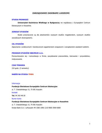 ZARZĄDZANIE ZASOBAMI LUDZKIMI STUDIA PROWADZI Uniwersytet Kazimierza Wielkiego w Bydgoszczy we współpracy z Europejskim Centrum Edukacyjnym w Koszalinie. ADRESAT STUDIÓW Studia przeznaczone są dla absolwentów wyższych studiów magisterskich, wyższych studiów zawodowych (licencjackich). CEL STUDIÓW Zapoznanie z praktycznymi i teoretycznymi zagadnieniami związanymi z zarządzaniem zasobami ludzkimi. PROGRAM STUDIÓW OBEJMUJE m.in. Porozumiewanie się i komunikacja w firmie, pozyskiwanie pracowników, kierowanie i przywództwo, motywowanie. CZAS TRWANIA 210 godz. (2 semestry) NABÓR NA STUDIA-TRWA Informacje: Fundacja Oświatowa Europejskie Centrum Edukacyjne ul. T. Chałubińskiego 15, 75-581 Koszalin Kontakt Tel. 94 342-48-20 Numer konta Fundacja Oświatowa Europejskie Centrum Edukacyjne w Koszalinie ul. T. Chałubińskiego 15, 75-581 Koszalin Kredyt Bank S.A. I o/Koszalin 49 1500 1096 1210 9005 5959 0000 1