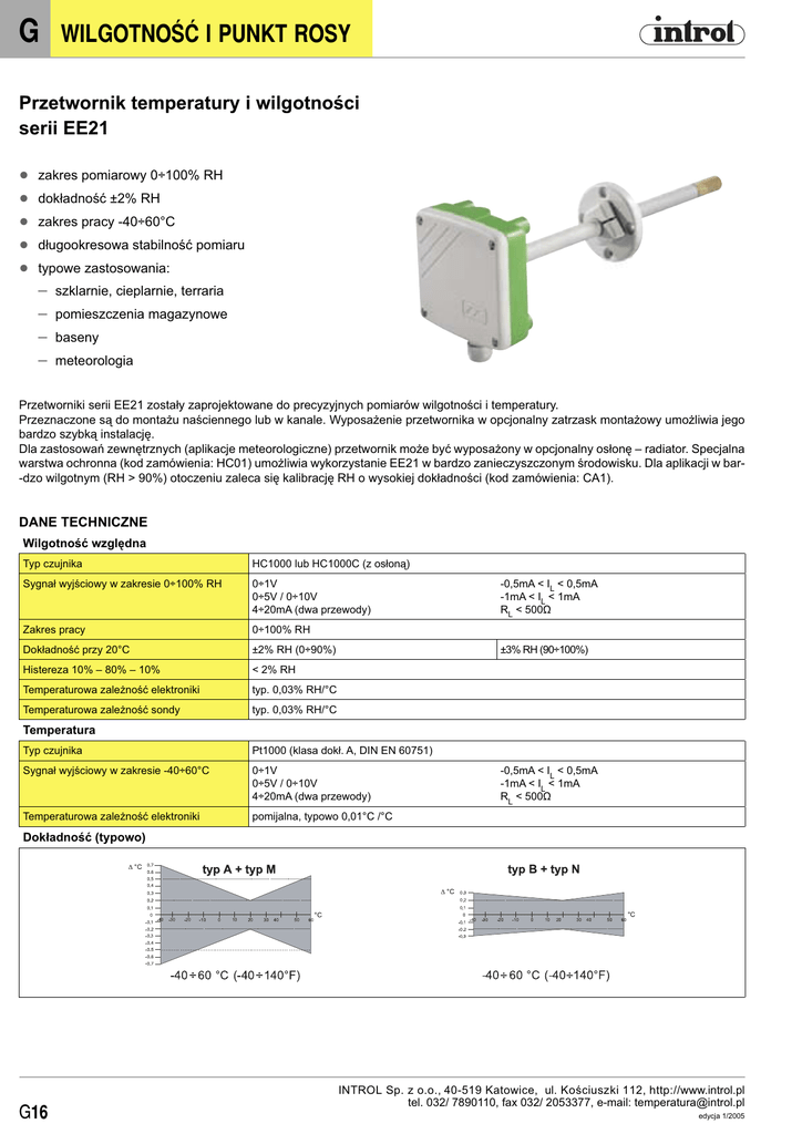 G WILGOTNOŚĆ I PUNKT ROSY Przetwornik temperatury i wilgotności serii EE21 ● ● ● ● ● zakres pomiarowy 0÷100% RH dokładność ±2% RH zakres pracy -40÷60°C długookresowa stabilność pomiaru typowe zastosowania: – – – – szklarnie, cieplarnie, terraria pomieszczenia magazynowe baseny meteorologia Przetworniki serii EE21 zostały zaprojektowane do precyzyjnych pomiarów wilgotności i temperatury. Przeznaczone są do montażu naściennego lub w kanale. Wyposażenie przetwornika w opcjonalny zatrzask montażowy umożliwia jego bardzo szybką instalację. Dla zastosowań zewnętrznych (aplikacje meteorologiczne) przetwornik może być wyposażony w opcjonalny osłonę – radiator. Specjalna warstwa ochronna (kod zamówienia: HC01) umożliwia wykorzystanie EE21 w bardzo zanieczyszczonym środowisku. Dla aplikacji w bar-dzo wilgotnym (RH > 90%) otoczeniu zaleca się kalibrację RH o wysokiej dokładności (kod zamówienia: CA1). DANE TECHNICZNE Wilgotność względna Typ czujnika HC1000 lub HC1000C (z osłoną) Sygnał wyjściowy w zakresie 0÷100% RH 0÷1V 0÷5V / 0÷10V 4÷20mA (dwa przewody) Zakres pracy 0÷100% RH Dokładność przy 20°C ±2% RH (0÷90%) Histereza 10% – 80% – 10% < 2% RH Temperaturowa zależność elektroniki typ. 0,03% RH/°C Temperaturowa zależność sondy typ. 0,03% RH/°C -0,5mA < IL < 0,5mA -1mA < IL < 1mA RL < 500Ω ±3% RH (90÷100%) Temperatura Typ czujnika Pt1000 (klasa dokł. A, DIN EN 60751) Sygnał wyjściowy w zakresie -40÷60°C 0÷1V 0÷5V / 0÷10V 4÷20mA (dwa przewody) Temperaturowa zależność elektroniki pomijalna, typowo 0,01°C /°C -0,5mA < IL < 0,5mA -1mA < IL < 1mA RL < 500Ω Dokładność (typowo) G16 INTROL Sp. z o.o., 40-519 Katowice, ul. Ko ściusz ki 112, http://www.introl.pl tel. 032/ 7890110, fax 032/ 2053377, e-mail: [email protected] edycja 1/2005 WILGOTNOŚĆ I PUNKT ROSY G GŁÓWNE DANE TECHNICZNE Zasilanie (wy: 0÷1V) 10÷35V DC lub 9÷29V AC Zasilanie (wy: 0÷5V) 12÷35V DC lub 15÷29V AC Zasilanie (wy: 0÷10V) 15÷35V DC lub 15÷29V AC Zasilanie (wy: 4÷20mA) 10 + RL×0,02 < UV < 35V DC; RL < 500Ω Pobór prądu zasilanie DC: typ 5mA dla AC: typ 15mA Połączenia elektryczne śrubowe 1,5mm2max. (AWG 16) Obudowa IP 65, Nema 4 Polycarbonat Osłona czujnika filtr membranowy, PTFE ze stali nierdzewnej lub z siatki metalowej Kompatybilność elektromagnetyczna EN 61000-6-2, ÖVE EN 61326-1+A1+A2, EN 61000-6-3, FCC Part15 Klasa B, ICES-003 Klasa B Temperatura pracy sondy - 40÷60°C Temp. pracy elektroniki - 40÷60°C Temp. magazynowania - 25÷60°C Dla EE21-F1/2/3xxx WYMIARY (mm) / MONTAŻ Typ B Dla EE21-FT6xxx Typ A obudowa: Polycarbonat stopień ochrony: IP65, NEMA4 Typ M Dla EE21-F6xxx Typ N zestaw szybkiego montażu Dla EE21-FP3xxx SCHEMAT POŁĄCZEŃ Dla EE21-FT1/2/3xxx Dla EE21-FP6xxx INTROL Sp. z o.o., 40-519 Katowice, ul. Ko ściusz ki 112, http://www.introl.pl tel. 032/ 7890110, fax 032/ 2053377, e-mail: [email protected] edycja 1/2005 G17 G WILGOTNOŚĆ I PUNKT ROSY KOD ZAMÓWIENIA PRZYKŁAD KODU ZAMÓWIENIA KOD ZAMÓWIENIA PRZETWORNIKA EE21 MODEL WYJŚCIE wilgotność + temperatura wilgotność wilgotność+ temp. pasywna 0÷1V 0÷5V 0÷10V 4÷20mA EE21 FT F FP 1 2 3 6 Przetwornik EE21-FT3A26-CA01/T24 Model przetwornik RH/T Wyjście 0÷10V Montaż naścienny Długość sondy 50mm Filtr z siatki metalowej brak Kalibracja wysoka wilgotność CZUJNIK TEMPERATURY (TYLKO PASYWNY) Pt 100 DIN A Pt 100 DIN B Pt 100 DIN C Pt 100 DIN D A B C D Osłona czujnika Jednostka temperatury °C A B M N Zakres temperatury -20÷80°C MONTAŻ naścienny kanałowy naścienny – zatrzask kanałowy – zatrzask DŁUGOŚĆ SONDY (WYMIAR „A”) 50mm 200mm inna 2 5 x FILTR filtr membranowy PTFE z stali nierdzewnej z siatki metalowej 1 3 5 6 OSŁONA CZUJNIKA brak tak KALIBRACJA standardowa wysoka wilgotność JEDNOSTKA TEMPERATURY °C °F -E01 ZAKRES TEMPERATURY -40÷80 -30÷70 -20÷80 -40÷140 0÷176 32÷132 inne T02 T08 T24 T83 T86 T96 tel G18 AKCESORIA ZAMAWIANE ODDZIELNIE ● Osłona radiacyjna ● Pokrywy do filtrów (HA010501) (HA0101xx) -HC01 -(CA01) INTROL Sp. z o.o., 40-519 Katowice, ul. Ko ściusz ki 112, http://www.introl.pl tel. 032/ 7890110, fax 032/ 2053377, e-mail: [email protected] edycja 1/2005
