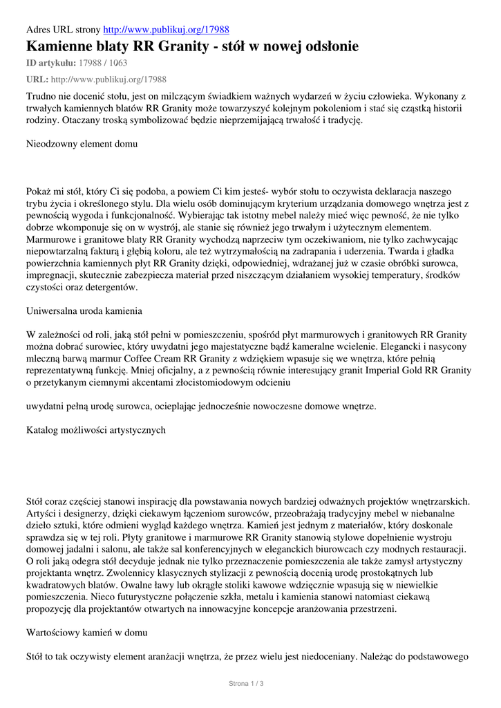 Adres URL strony http://www.publikuj.org/17988 Kamienne blaty RR Granity - stół w nowej odsłonie ID artykułu: 17988 / 1063 URL: http://www.publikuj.org/17988 Trudno nie docenić stołu, jest on milczącym świadkiem ważnych wydarzeń w życiu człowieka. Wykonany z trwałych kamiennych blatów RR Granity może towarzyszyć kolejnym pokoleniom i stać się cząstką historii rodziny. Otaczany troską symbolizować będzie nieprzemijającą trwałość i tradycję. Nieodzowny element domu Pokaż mi stół, który Ci się podoba, a powiem Ci kim jesteś- wybór stołu to oczywista deklaracja naszego trybu życia i określonego stylu. Dla wielu osób dominującym kryterium urządzania domowego wnętrza jest z pewnością wygoda i funkcjonalność. Wybierając tak istotny mebel należy mieć więc pewność, że nie tylko dobrze wkomponuje się on w wystrój, ale stanie się również jego trwałym i użytecznym elementem. Marmurowe i granitowe blaty RR Granity wychodzą naprzeciw tym oczekiwaniom, nie tylko zachwycając niepowtarzalną fakturą i głębią koloru, ale też wytrzymałością na zadrapania i uderzenia. Twarda i gładka powierzchnia kamiennych płyt RR Granity dzięki, odpowiedniej, wdrażanej już w czasie obróbki surowca, impregnacji, skutecznie zabezpiecza materiał przed niszczącym działaniem wysokiej temperatury, środków czystości oraz detergentów. Uniwersalna uroda kamienia W zależności od roli, jaką stół pełni w pomieszczeniu, spośród płyt marmurowych i granitowych RR Granity można dobrać surowiec, który uwydatni jego majestatyczne bądź kameralne wcielenie. Elegancki i nasycony mleczną barwą marmur Coffee Cream RR Granity z wdziękiem wpasuje się we wnętrza, które pełnią reprezentatywną funkcję. Mniej oficjalny, a z pewnością równie interesujący granit Imperial Gold RR Granity o przetykanym ciemnymi akcentami złocistomiodowym odcieniu uwydatni pełną urodę surowca, ocieplając jednocześnie nowoczesne domowe wnętrze. Katalog możliwości artystycznych Stół coraz częściej stanowi inspirację dla powstawania nowych bardziej odważnych projektów wnętrzarskich. Artyści i designerzy, dzięki ciekawym łączeniom surowców, przeobrażają tradycyjny mebel w niebanalne dzieło sztuki, które odmieni wygląd każdego wnętrza. Kamień jest jednym z materiałów, który doskonale sprawdza się w tej roli. Płyty granitowe i marmurowe RR Granity stanowią stylowe dopełnienie wystroju domowej jadalni i salonu, ale także sal konferencyjnych w eleganckich biurowcach czy modnych restauracji. O roli jaką odegra stół decyduje jednak nie tylko przeznaczenie pomieszczenia ale także zamysł artystyczny projektanta wnętrz. Zwolennicy klasycznych stylizacji z pewnością docenią urodę prostokątnych lub kwadratowych blatów. Owalne ławy lub okrągłe stoliki kawowe wdzięcznie wpasują się w niewielkie pomieszczenia. Nieco futurystyczne połączenie szkła, metalu i kamienia stanowi natomiast ciekawą propozycję dla projektantów otwartych na innowacyjne koncepcje aranżowania przestrzeni. Wartościowy kamień w domu Stół to tak oczywisty element aranżacji wnętrza, że przez wielu jest niedoceniany. Należąc do podstawowego Strona 1 / 3 wyposażenia każdego domu, w niemalże wszystkich miejscach świata stopniowo zyskuje wartość nie tylko użytkową ale i estetyczną. Dzięki bogatej palecie barw kamieni RR Granity może przeistoczyć się w wyjątkowy element dekoracyjny, nadając ton i charakter pomieszczeniom. Uroda i siła kamienia sprawia, że marmurowe i kamienne stoły RR Granity potrafią stworzyć nastrój dla wyjątkowych spotkań. Parametry techniczne płyt RR Granity Płyta granitowa Imperial Gold Wymiar : docinany na indywidulane zamówienie Powierzchnia: polerowana / antykowana Dystrybutor: RR Granity Cena detaliczna płyty granitowej Imperial Gold 2 cm : 329 zł netto/m2 Cena detaliczna płyty granitowej Imperial Gold 3cm : 379 zł netto/m2. Płyta marmurowa Coffe Cream Wymiar : docinany na indywidulane zamówienie Powierzchnia: polerowana / antykowana Dystrybutor: RR Granity Cena detaliczna płyty marmurowej Coffee Cream 2 cm : od 219,00zł netto/m2 Cena detaliczna płyty marmurowej Crema Marfil 3cm : od 269,00zł netto/m2. Płytka marmurowa Coffe Cream 60x40x1,5 cm: od 199zł netto/m2 RR Granity Hurtownia kamienia naturalnego ul. Ceglana 15 58-150 Strzegom tel./fax: 48 74 85 55 909 e-mail: [email protected] www.rrgranity.pl Strona 2 / 3 40-153 Katowice ul. Korfantego 191, bud C tel./fax 48 32 204 55 61 kom. 516 005 117, 516 500 310 e-mail: [email protected] www.rrgranity.pl RR GRANITY HURTOWNIA KAMIENIA NATURALNEGO od 1995 zajmuje się produkcją oraz dystrybucją kamienia naturalnego: granitu, marmuru, onyksu, trawertynu. Surowce sprowadzane są m. in. z Hiszpanii, Indii, Norwegii, Szwecji, Finlandii, Brazylii i Włoch. Bezpośrednia współpraca z największymi na świecie koncernami zajmującymi się wydobyciem bloków kamiennych umożliwiła stworzenie bogatej oferty ponad 70 rodzajów płyt, płytek granitowych, marmurowych i trawertynowych. RR Granity posiada dwa innowacyjne zakłady produkcyjne ulokowane w województwie dolnośląskim, w tym jeden z najnowocześniejszych parków maszynowych w Polsce. Pozostałe oddziały firmy znajdują się w Katowicach oaz Sufczynie k/ Brzeska.. Aktywacja: 11/10/11 09:38, odsłony: 869 Strona 3 / 3