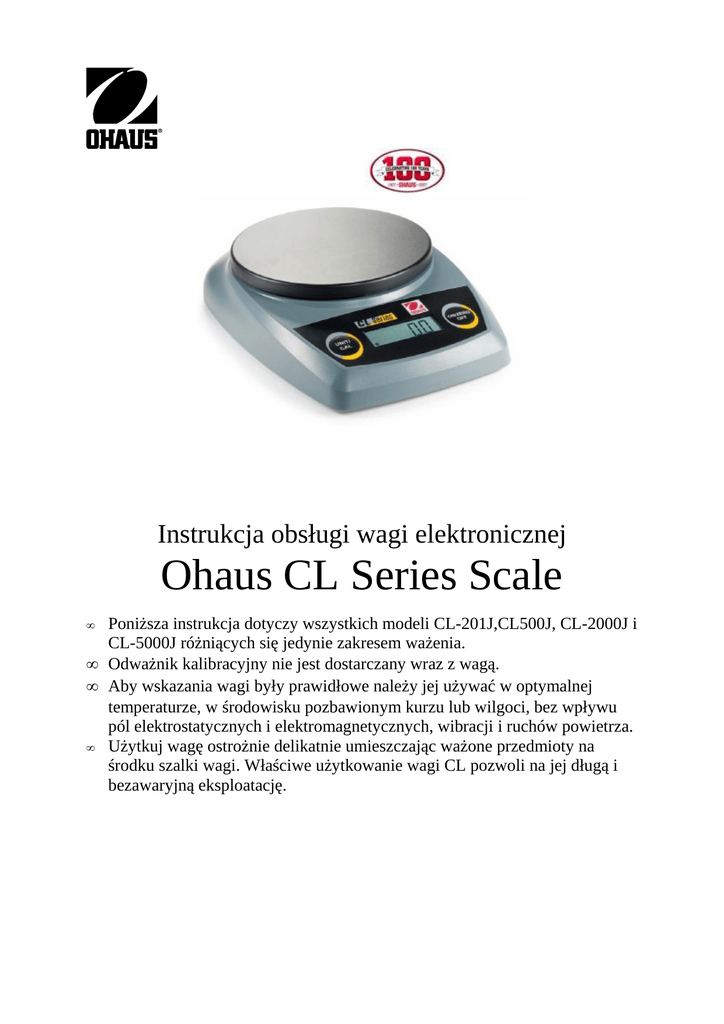 Instrukcja obsługi wagi elektronicznej Ohaus CL Series Scale Poniższa instrukcja dotyczy wszystkich modeli CL-201J,CL500J, CL-2000J i CL-5000J różniących się jedynie zakresem ważenia. • Odważnik kalibracyjny nie jest dostarczany wraz z wagą. • Aby wskazania wagi były prawidłowe należy jej używać w optymalnej temperaturze, w środowisku pozbawionym kurzu lub wilgoci, bez wpływu pól elektrostatycznych i elektromagnetycznych, wibracji i ruchów powietrza. • Użytkuj wagę ostrożnie delikatnie umieszczając ważone przedmioty na środku szalki wagi. Właściwe użytkowanie wagi CL pozwoli na jej długą i bezawaryjną eksploatację. • Instalacja baterii: Otworzyć pokrywę na spodzie wagi, włożyć trzy baterie AA znajdujące się w pudełku do wagi i założyć ponownie pokrywę. Zasilacz Sieciowy (dostępny w akcesoriach) Podłączyć wtyk zasilacza gniazda z tyłu wagi. Włączyć zasilacz do gniazda sieciowego. Obsługa wagi Uwaga!!! Przed uruchomieniem wagi należy odblokować zabezpieczenie transportowe znajdujące się pod wagą !!! .Rysunek poniżej. • Testowanie: Po włączeniu wszystkie segmenty wyświetlacza zapalają się na 2 sekundy zanim waga się wyzeruje. • Symbol stabilnego wskazania: Z lewej strony wyświetlacza ukaże się gwiazdka wskazująca stabilność wagi i gotowość do pracy. Gwiazdka będzie niknąć kiedy pomiar będzie wykonywany i ponownie się pojawiać przy stabilnym stanie. • Przeciążenie: Jeśli maksymalne obciążenie wagi zostanie przekroczone, na wyświetlaczu ukażę się symbol „E”. Należy niezwłocznie usunąć ważony przedmiot z szalki. Waga powróci po chwili ponownie do ważenia. • Wartość negatywna: Jeśli z szalki usunąć ważoną masę wartość tary wyświetlana będzie ze znakiem minus. Aby ponownie wytarować wagę należy wcisnąć przycisk „OnOff/Zero. Zerowanie: Kolejne naważki mogą być stopniowo dodawane do ważonej próbki. Poprzez przyciśnięcie przycisku On-Off/Zero, waga ponownie wyświetli zero i pojawi się wskaźnik stabilnego odczytu. Po dodaniu kolejnej masy wciśnij ponownie On-Off/Zero. • Przyciski ON-OFF/ZERO: Włączyć wagę baz obciążenia używając przycisku On-Off/Zero. Zerować / tarować wagę przy użyciu On-Off/Zero. Wyłączenie wagi wagę wyłącza się za pomocą przycisku On-Off/Zero (przytrzymać) . Cal/Unit: Przyciśnij krótko Cal/Unit aby zmienić jednostki ważenia. (gramy, funty/uncje,itd). Przyciśnij i przytrzymaj przycisk Cal/Unit aby rozpocząć procedurę kalibracji. Kalibracja Dla odpowiednich wyników należy regularnie kalibrować wagę ( w zależności od potrzeb). Jest to szczególnie ważne, jeśli włącza się wagę po długim okresie nie użytkowania jej. 1. Pozwól nagrzać się wadze dwie minuty zanim rozpoczniesz procedurę kalibracji. 2. Wciśnij i przytrzymaj przycisk Cal/Unit, aż pokaże się na wyświetlaczu napis CAL odnoszący się do trybu kalibracji zewnętrznej . 3. Wcisnąć On-Off/Zero, na wyświetlaczu ukaże się „-C-”. Po dwóch sekundach zmieni się na np.: C 2000 g. Umieść wymaganą masę kalibracyjną na środku szalki. 4. Wcisnąć On-Off/Zero, na wyświetlaczu ukaże się ponownie napis „-C-” i po chwili zmieni się na napis PASS waga powróci do funkcji ważenia. Kalibracja jest kompletna jeśli waga poprawnie wyświetli masę odważnika i pomiar jest stabilny. 5. Usuń odważnik kalibracyjny z szalki i wyłącz wagę. Włącz wagę ponownie. Jest ona gotowa do ważenia. UWAGA: Jeśli wyświetli się napis „Cal E” zamiast napisu „PASS” oznacza to, kalibrację należy powtórzyć. Napis „Cal E” wyświetli się kiedy umieścimy na szalce niewłaściwy odważnik kalibracyjny lub błędnie przeprowadzimy procedurę kalibracji. Akcesoria standardowe • Trzy baterie alkaiczne AA Akcesoria Opcjonalne • Zasilacz sieciowy AC ADAPTER,230V 80500223 Parametry Model Nośność (g) Działka odczytowa (g) Jednostki ważenia Kalibracja Czas stabilizacji Maksymalne przeciążenie Wskazanie przeciążenia Czas pracy - baterie Automatyczne wyłączanie Optymalna temperatura pracy Rozmiary szalki (mm) Zasilanie Wymiary zewnętrzne (mm) Waga (bez baterii) kg Serwis: CL201 200 CL500 CL2000 CL5000 500 2000 5000 1 2 g/lb:oz;ozt;dwt Zewnętrzna z klawiatury 2 sekundy 150% nośności [E] 40 godzin 4 minuty bez pracy 18-25°C 12,0 3 baterie AA lub zasilacz sieciowy (opcja) 145 x 45 x 205 0,4 0,1 Wszelkie informacje serwisowe u autoryzowanych dystrybutorów Ohaus.