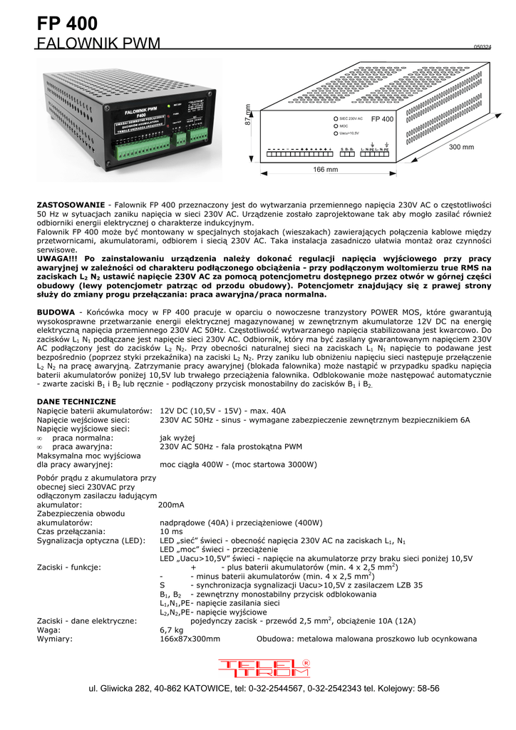 FP 400 FALOWNIK PWM 87 mm 050324 SIEĆ 230V AC FP 400 MOC Uacu>10,5V S B1 B2 L1 N1 PE L2 N2 PE 300 mm 166 mm ZASTOSOWANIE - Falownik FP 400 przeznaczony jest do wytwarzania przemiennego napięcia 230V AC o częstotliwości 50 Hz w sytuacjach zaniku napięcia w sieci 230V AC. Urządzenie zostało zaprojektowane tak aby mogło zasilać również odbiorniki energii elektrycznej o charakterze indukcyjnym. Falownik FP 400 może być montowany w specjalnych stojakach (wieszakach) zawierających połączenia kablowe między przetwornicami, akumulatorami, odbiorem i siecią 230V AC. Taka instalacja zasadniczo ułatwia montaż oraz czynności serwisowe. UWAGA!!! Po zainstalowaniu urządzenia należy dokonać regulacji napięcia wyjściowego przy pracy awaryjnej w zależności od charakteru podłączonego obciążenia - przy podłączonym woltomierzu true RMS na zaciskach L2 N2 ustawić napięcie 230V AC za pomocą potencjometru dostępnego przez otwór w górnej części obudowy (lewy potencjometr patrząc od przodu obudowy). Potencjometr znajdujący się z prawej strony służy do zmiany progu przełączania: praca awaryjna/praca normalna. BUDOWA - Końcówka mocy w FP 400 pracuje w oparciu o nowoczesne tranzystory POWER MOS, które gwarantują wysokosprawne przetwarzanie energii elektrycznej magazynowanej w zewnętrznym akumulatorze 12V DC na energię elektryczną napięcia przemiennego 230V AC 50Hz. Częstotliwość wytwarzanego napięcia stabilizowana jest kwarcowo. Do zacisków L1 N1 podłączane jest napięcie sieci 230V AC. Odbiornik, który ma być zasilany gwarantowanym napięciem 230V AC podłączony jest do zacisków L2 N2. Przy obecności naturalnej sieci na zaciskach L1 N1 napięcie to podawane jest bezpośrednio (poprzez styki przekaźnika) na zaciski L2 N2. Przy zaniku lub obniżeniu napięciu sieci następuje przełączenie L2 N2 na pracę awaryjną. Zatrzymanie pracy awaryjnej (blokada falownika) może nastąpić w przypadku spadku napięcia baterii akumulatorów poniżej 10,5V lub trwałego przeciążenia falownika. Odblokowanie może następować automatycznie - zwarte zaciski B1 i B2 lub ręcznie - podłączony przycisk monostabilny do zacisków B1 i B2. DANE TECHNICZNE Napięcie baterii akumulatorów: Napięcie wejściowe sieci: Napięcie wyjściowe sieci: • praca normalna: • praca awaryjna: Maksymalna moc wyjściowa dla pracy awaryjnej: 12V DC (10,5V - 15V) - max. 40A 230V AC 50Hz - sinus - wymagane zabezpieczenie zewnętrznym bezpiecznikiem 6A jak wyżej 230V AC 50Hz - fala prostokątna PWM moc ciągła 400W - (moc startowa 3000W) Pobór prądu z akumulatora przy obecnej sieci 230VAC przy odłączonym zasilaczu ładującym akumulator: 200mA Zabezpieczenia obwodu akumulatorów: nadprądowe (40A) i przeciążeniowe (400W) Czas przełączania: 10 ms Sygnalizacja optyczna (LED): LED „sieć” świeci - obecność napięcia 230V AC na zaciskach L1, N1 LED „moc” świeci - przeciążenie LED „Uacu>10,5V” świeci - napięcie na akumulatorze przy braku sieci poniżej 10,5V Zaciski - funkcje: + - plus baterii akumulatorów (min. 4 x 2,5 mm2) - minus baterii akumulatorów (min. 4 x 2,5 mm2) S - synchronizacja sygnalizacji Uacu>10,5V z zasilaczem LZB 35 B1, B2 - zewnętrzny monostabilny przycisk odblokowania L1,N1,PE - napięcie zasilania sieci L2,N2,PE - napięcie wyjściowe Zaciski - dane elektryczne: pojedynczy zacisk - przewód 2,5 mm2, obciążenie 10A (12A) Waga: 6,7 kg Wymiary: 166x87x300mm Obudowa: metalowa malowana proszkowo lub ocynkowana ul. Gliwicka 282, 40-862 KATOWICE, tel: 0-32-2544567, 0-32-2542343 tel. Kolejowy: 58-56