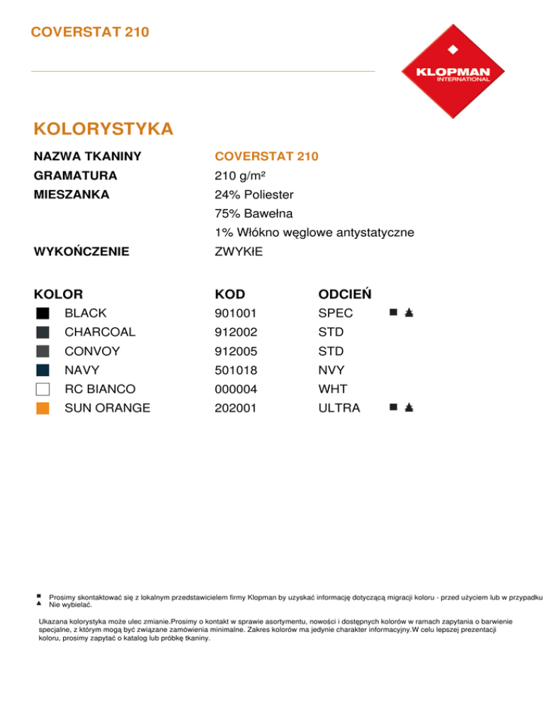 COVERSTAT 210 KOLORYSTYKA NAZWA TKANINY COVERSTAT 210 GRAMATURA 210 g/m² MIESZANKA 24% Poliester 75% Bawełna 1% Włókno węglowe antystatyczne WYKOŃCZENIE ZWYKłE KOLOR KOD ODCIEŃ BLACK 901001 SPEC CHARCOAL 912002 STD CONVOY 912005 STD NAVY 501018 NVY RC BIANCO 000004 WHT SUN ORANGE 202001 ULTRA Prosimy skontaktować się z lokalnym przedstawicielem firmy Klopman by uzyskać informację dotyczącą migracji koloru - przed użyciem lub w przypadku Nie wybielać. Ukazana kolorystyka może ulec zmianie.Prosimy o kontakt w sprawie asortymentu, nowości i dostępnych kolorów w ramach zapytania o barwienie specjalne, z którym mogą być związane zamówienia minimalne. Zakres kolorów ma jedynie charakter informacyjny.W celu lepszej prezentacji koloru, prosimy zapytać o katalog lub próbkę tkaniny. Powered by TCPDF (www.tcpdf.org)
