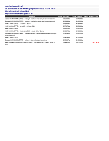 monitoringlasu24.pl ul. Słoneczna 39 55-090 Długołęka (Wrocław) 71 315 16 75 [email protected] http://www.monitoringlasu24.pl/ Produkty Cena (brutto) Cena (netto) Zestaw KAM 1 MMS/GPRS z własnym zasilaniem solarnym i akumulatorami 2.509,20 zł 2.040,00 zł Zestaw KAM 3 MMS/GPRS z własnym zasilaniem solarnym i akumulatorami 2.988,90 zł 2.430,00 zł KAM 1 MMS/GPRS + karta SD + 8 aku 2.189,40 zł 1.780,00 zł KAM 3 MMS/GPRS + karta SD + 12 aku (PL) 2.570,70 zł 2.090,00 zł KAM 5 MMS/GPRS 2.472,30 zł 2.010,00 zł KAM 3 MMS/GPRS + sterowanie SMS + karta SD + 12 aku 2.693,70 zł 2.190,00 zł Zestaw KAM 3 MMS/GPRS + sterowanie SMS z własnym zasilaniem solarnym i akumulatorami 3.111,90 zł 2.530,00 zł KAM 1 MMS/GPRS 2.115,60 zł 1.720,00 zł Zestaw KAM 3 MMS/GPRS + solar+12 aku+mikrofon kierunkowy 2.999,97 zł 2.439,00 zł KAM 3 z lokalizatorem GPS/ MMS/GPRS + sterowanie SMS + karta SD + 12 aku 3.444,00 zł 2.800,00 zł Cena promocyjna 3.321,00 zł