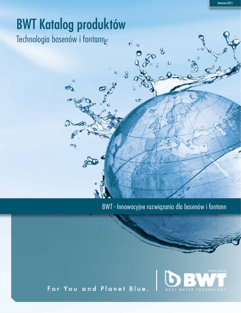 Kwiecień 2015 BWT Katalog produktów Technologia basenów i fontann BWT - Innowacyjne rozwiązania dla basenów i fontann BWT Polska Chapter title BWT Polska - innowacyjne rozwiązania z zakresu uzdatniania wody, technologii basenowej i fontannowej BWT Polska - sprawdzony i godny zaufania partner dla inwestycji basenowych i fontannowych. Nasze doświadczenie i innowacyjne technologie to gwarancja bezpieczeństwa, zdrowia i higieny. O firmie BWT Polska Firma BWT Polska istnieje na polskim rynku od 1992 roku. Wieloletnie doświadczenie w branży uzdatniania wody oraz ciągłe doskonalenie naszych produktów i usług to gwarancja niezawodności i innowacyjności proponowanych przez nas rozwiązań. BWT dzięki własnym działom R&D (badania i rozwój), które na bieżąco prowadzą badania i optymalizują stosowane procesy i materiały, może zaoferować nie tylko nowoczesne, ale także ekologiczne i ekonomiczne produkty i technologie. Firma BWT Polska to działy: Inżynierii Projektowej, Technologii Basenowej i Fotannowej, Dział Wodny, Dział Serwisu oraz Dział produktów HoReCa. Dzięki temu dostarczamy kompleksowe i nowoczesne rozwiązania oraz zapewniamy wsparcie serwisowe dostosowane do indywidualnych potrzeb klientów. BWT Polska to część Grupy BWT europejskiego lidera technologii uzdatniania wody. Nasze hasło przewodnie: BWT For You and Planet Blue wyraża dążenie do zaoferowania klientom najlepszych produktów, urządzeń i usług w dziedzinie uzdatniania wody, przy jednoczesnym zapewnieniu ochrony światowych zasobów wody znajdujących się na naszej niebieskiej planecie. 2 Dział Technologii Basenowej i Fontannowej Chapter title Dział Technologii Basenowej i Fontannowej BWT Polska Dział basenów i fontann gwarantuje kompleksowe rozwiązania, od projektu, aż po realizację instalacji basenowych i fontannowych. Dział Technologii Basenowej i Fontannowej BWT Polska BWT Polska to sprawdzeni specjaliści w dziedzinie technologii basenowej oraz fontannowej. Nasz profesjonalizm i doświadczenie doceniło już wielu inwestorów. Zrealizowaliśmy kilkaset basenów: publicznych, hotelowych i spa, basenów rehabilitacyjnych, pływalni sportowych, basenów dla nurków oraz projektów prywatnych. Wykonaliśmy również kompleks basenów dla hipopotamów oraz akwaria dla ryb morskich i słodkowodnych w ZOO. Dział fontannowy może pochwalić się wykonaniem ponad 100 fontann, w Polsce i Europie. Szeroki wybór rodzajów fontann takich jak: dry plaza, klasyczne, interaktywne, muzyczne oraz kaskad i wodospadów pozwala na wybór rozwiązania dostosowanego do indywidualnych potrzeb i wymagań. Realizujemy zarówno inwestycje zewnętrzne np.: w parkach, na rynkach, placach miejskich, prywatnych posesjach, przed budynkami użyteczności publicznej, jak i wewnątrz budynków: w centrach handlowych, biurowcach, budynkach mieszkalnych. Nieustannie doskonalimy i rozwijamy stosowane technologie, dzięki czemu oferujemy innowacyjne rozwiązania najwyższej jakości, zapewniające najwyższy stopień higieny i bezpieczeństwa. Przekazujemy w Państwa ręce katalog naszych produktów. To tylko część oferowanych przez nas urządzeń i technologii basenowych i fontannowych. Zapewniamy także serwis gwarancyjny i pogwarancyjny oraz sprzedaż części zamiennych (Dział Serwisu Basenowego). BWT to także szeroka gama produktów i rozwiązań uzdatniania wody dla domu (Dział Wodny), przemysłu (Dział Inżynierii Projektowej) oraz usługi serwisowe urządzeń do uzdatniania wody (Dział Serwisu Wodnego). Zachęcamy do zapoznania się z całą naszą ofertą. Nasi specjaliści chętnie doradzą i pomogą wybrać rozwiązanie dostosowane do indywidualnych potrzeb. Zapraszamy do kontaktu z naszym biurem lub odwiedzenia strony internetowej. Dział Technologii Basenowej i Fontannowej BWT Polska Sp. z o.o. ul. Połczyńska 116 01-304 Warszawa tel.: +48 /22/533 57 00 e-mail: [email protected] strona internetowa: www.bwt.pl 3 Dział Serwisu basenów i fontann Dział Serwisu basenów i fontann BWT Polska Dział Serwisu - pewność niezakłóconej pracy instalacji przez długie lata, bezpieczeństwo użytkowników. Dział Serwisu basenów i fontann BWT Polska Firma BWT Polska to także dział serwisu basenów i fontann oferujący usługi serwisowe, przeglądy, uruchomienia, szkolenia oraz konserwację z zakresu obsługi urządzeń technologii basenowej i fontannowej. Zajmujemy się również sprzedażą komponentów, części zamiennych, chemikaliów i armatury PVC. Oferujemy doradztwo techniczne z zakresu prawidłowej eksploatacji obiektów basenowych i fontannowych. Zachęcamy do nawiązania współpracy serwisowej z firmą BWT Polska. Oferujemy stałą obsługę serwisową na bazie indywidualnych umów przygotowanych zgodnie z potrzebami Klientów. Posiadamy duże doświadczenie w wymianie złóż filtracyjnych w obiektach publicznych, hotelowych i apartamentowych. Oferujemy pełen serwis od wymiany po zagospodarowanie zużytych złóż filtracyjnych. Jedynie stała umowa serwisowa gwarantuje utrzymanie instalacji basenowych w odpowiednim stanie przez cały rok oraz szybką rekację serwisu na wezwania obsługi. Działania konserwacyjne wykonywne przez zespół doświadczonych technologów gwarantuje niezakłóconą pracę instalacji przez długie lata, wiąże się to z bezpieczeństwem oraz zadowoleniem. Oferujemy: 1. Przeglądy instalacji basenowych. 2. Naprawy oraz serwis urządzeń basenowych. 3. Kompleksową wymianę złóż filtracyjnych. 4. Sprzedaż części zamiennych. 5. Chemikalia basenowe, testery, odkurzacze i elementy wyposażenia niecek basenowych. 6. Kształtki, rury, zawory PVC. Dział Serwisu basenów i fontann Jacek Pilarski e-mail: [email protected] tel.: +48 22 533 57 90 tel. kom.: +48 602 193 500 4 Spis treści 1. Filtracja . ............................................................................................................................................................