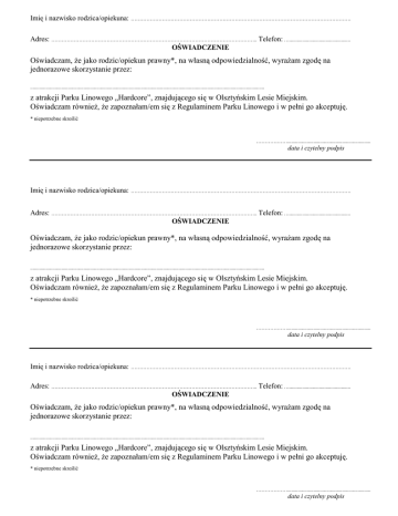 Imię i nazwisko rodzica/opiekuna: ………………………………………………………………………………………………………………. Adres: ……………………………………………………………………………………………………….. Telefon: …............................................... OŚWIADCZENIE Oświadczam, że jako rodzic/opiekun prawny*, na własną odpowiedzialność, wyrażam zgodę na jednorazowe skorzystanie przez: .................................................................................................................................................................................... z atrakcji Parku Linowego „Hardcore”, znajdującego się w Olsztyńskim Lesie Miejskim. Oświadczam również, że zapoznałam/em się z Regulaminem Parku Linowego i w pełni go akceptuję. * niepotrzebne skreślić ………………................................................................ data i czytelny podpis Imię i nazwisko rodzica/opiekuna: ………………………………………………………………………………………………………………. Adres: ……………………………………………………………………………………………………….. Telefon: …............................................... OŚWIADCZENIE Oświadczam, że jako rodzic/opiekun prawny*, na własną odpowiedzialność, wyrażam zgodę na jednorazowe skorzystanie przez: .................................................................................................................................................................................... z atrakcji Parku Linowego „Hardcore”, znajdującego się w Olsztyńskim Lesie Miejskim. Oświadczam również, że zapoznałam/em się z Regulaminem Parku Linowego i w pełni go akceptuję. * niepotrzebne skreślić ………………................................................................ data i czytelny podpis Imię i nazwisko rodzica/opiekuna: ………………………………………………………………………………………………………………. Adres: ……………………………………………………………………………………………………….. Telefon: …............................................... OŚWIADCZENIE Oświadczam, że jako rodzic/opiekun prawny*, na własną odpowiedzialność, wyrażam zgodę na jednorazowe skorzystanie przez: .................................................................................................................................................................................... z atrakcji Parku Linowego „Hardcore”, znajdującego się w Olsztyńskim Lesie Miejskim. Oświadczam również, że zapoznałam/em się z Regulaminem Parku Linowego i w pełni go akceptuję. * niepotrzebne skreślić ………………................................................................ data i czytelny podpis