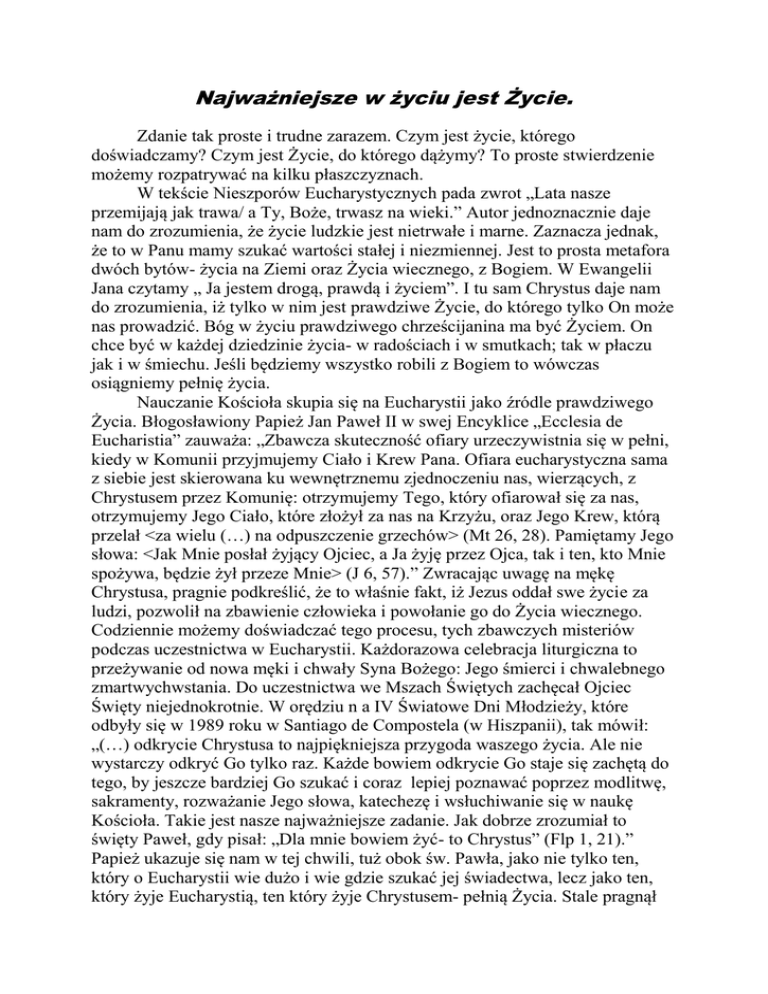 Najważniejsze w życiu jest Życie. Zdanie tak proste i trudne zarazem. Czym jest życie, którego doświadczamy? Czym jest Życie, do którego dążymy? To proste stwierdzenie możemy rozpatrywać na kilku płaszczyznach. W tekście Nieszporów Eucharystycznych pada zwrot „Lata nasze przemijają jak trawa/ a Ty, Boże, trwasz na wieki.” Autor jednoznacznie daje nam do zrozumienia, że życie ludzkie jest nietrwałe i marne. Zaznacza jednak, że to w Panu mamy szukać wartości stałej i niezmiennej. Jest to prosta metafora dwóch bytów- życia na Ziemi oraz Życia wiecznego, z Bogiem. W Ewangelii Jana czytamy „ Ja jestem drogą, prawdą i życiem”. I tu sam Chrystus daje nam do zrozumienia, iż tylko w nim jest prawdziwe Życie, do którego tylko On może nas prowadzić. Bóg w życiu prawdziwego chrześcijanina ma być Życiem. On chce być w każdej dziedzinie życia- w radościach i w smutkach; tak w płaczu jak i w śmiechu. Jeśli będziemy wszystko robili z Bogiem to wówczas osiągniemy pełnię życia. Nauczanie Kościoła skupia się na Eucharystii jako źródle prawdziwego Życia. Błogosławiony Papież Jan Paweł II w swej Encyklice „Ecclesia de Eucharistia” zauważa: „Zbawcza skuteczność ofiary urzeczywistnia się w pełni, kiedy w Komunii przyjmujemy Ciało i Krew Pana. Ofiara eucharystyczna sama z siebie jest skierowana ku wewnętrznemu zjednoczeniu nas, wierzących, z Chrystusem przez Komunię: otrzymujemy Tego, który ofiarował się za nas, otrzymujemy Jego Ciało, które złożył za nas na Krzyżu, oraz Jego Krew, którą przelał <za wielu (…) na odpuszczenie grzechów> (Mt 26, 28). Pamiętamy Jego słowa: <Jak Mnie posłał żyjący Ojciec, a Ja żyję przez Ojca, tak i ten, kto Mnie spożywa, będzie żył przeze Mnie> (J 6, 57).” Zwracając uwagę na mękę Chrystusa, pragnie podkreślić, że to właśnie fakt, iż Jezus oddał swe życie za ludzi, pozwolił na zbawienie człowieka i powołanie go do Życia wiecznego. Codziennie możemy doświadczać tego procesu, tych zbawczych misteriów podczas uczestnictwa w Eucharystii. Każdorazowa celebracja liturgiczna to przeżywanie od nowa męki i chwały Syna Bożego: Jego śmierci i chwalebnego zmartwychwstania. Do uczestnictwa we Mszach Świętych zachęcał Ojciec Święty niejednokrotnie. W orędziu n a IV Światowe Dni Młodzieży, które odbyły się w 1989 roku w Santiago de Compostela (w Hiszpanii), tak mówił: „(…) odkrycie Chrystusa to najpiękniejsza przygoda waszego życia. Ale nie wystarczy odkryć Go tylko raz. Każde bowiem odkrycie Go staje się zachętą do tego, by jeszcze bardziej Go szukać i coraz lepiej poznawać poprzez modlitwę, sakramenty, rozważanie Jego słowa, katechezę i wsłuchiwanie się w naukę Kościoła. Takie jest nasze najważniejsze zadanie. Jak dobrze zrozumiał to święty Paweł, gdy pisał: „Dla mnie bowiem żyć- to Chrystus” (Flp 1, 21).” Papież ukazuje się nam w tej chwili, tuż obok św. Pawła, jako nie tylko ten, który o Eucharystii wie dużo i wie gdzie szukać jej świadectwa, lecz jako ten, który żyje Eucharystią, ten który żyje Chrystusem- pełnią Życia. Stale pragnął być w Komunii z Bogiem. Trwać w zjednoczeniu z Najwyższym. Nakłaniał do poszukiwania tej bliskości w drugim człowieku (jako tym, który stworzony został na obraz i podobieństwo Boga) w Liście Apostolskim „Mulieris Dignitatem”. Szczególnym wyrazem miłości i życia z Bogiem, a także życia Bogiem miała być wg Jana Pawła II miłość małżeńska: „Bóg, który pozwala się poznać ludziom przez Chrystusa, jest jednością Trójcy: jednością w komunii. W ten sposób zostaje rzucone nowe światło również na to podobieństwo i obraz Boga w człowieku, o jakim mowa w Księdze Rodzaju. To, że człowiek stworzony jako mężczyzna i kobieta jest obrazem Boga, znaczy nie tylko, iż każdy z nich z osobna jest podobny do Boga, będąc istotą rozumną i wolną. Znaczy to również, że mężczyzna i kobieta stanowi jako „jedność dwojga” we wspólnym człowieczeństwie są wezwani do życia we wspólnocie miłości i do odzwierciedlania w ten sposób w świecie tej komunii miłości, jaka jest w Bogu (…)”. Ta pełnia Życia, którą spostrzegł Papież- Polak została także dostrzeżona przez jego następcę- Benedykta XVI. On również zauważa zależność między trwaniem w Komunii z Bogiem i drugim człowiekiem- tym wzajemnym dawaniem i braniem- a z osiągnięciem szczęśliwego życia na Ziemi i Życia wiecznego, gdzie stale będziemy przebywać z Bogiem w pełnej szczęśliwości. Obecny papież cała encyklikę „Sacramentum caritatis” poświęcił cudowi Eucharystii. „Sakrament miłości”- tak nazwał swą adhortację i jakże wielka jest wymowa i znaczenie tych dwóch słów. „70. Pan Jezus, stawszy się dla nas chlebem prawdy i miłości, mówiąc o darze swego życia zapewnia nas: <kto spożywa ten chleb, będzie żył na wieki> (J6,51).To zaś <życie wieczne> rozpoczyna się w nas już teraz poprzez zmianę, jaką dar eucharystyczny w nas rodzi <ten, kto Mnie spożywa, będzie żył przeze Mnie> (J6,57).Te słowa Jezusa sprawiają, iż możemy pojąć, jak tajemnica, <w którą wierzymy> i < którą celebrujemy> staję się przez wewnętrzną dynamikę, zasadą nowego życia w nas oraz formą chrześcijańskiej egzystencji..” Benedykt XVI odnosi się tu do tego, by mieć świadomość, że dla każdego chrześcijanina najważniejszym punktem w szarym znoju życia codziennego-ziemskiego jest moment, kiedy będzie mógł uczestniczyć w „Jasności Eucharystycznej”. Włączeni w Chrystusa jako żywe komórki Jego ciała mamy świadomość tego, że wszyscy jesteśmy Kościołem Eucharystycznym, który żyje Chrystusem- Panem Życia w zjednoczeniu Eucharystią. Pan jest dawcą życia. W Księdze Rodzaju zawarty jest opis stworzenia człowieka. Prośba Abrahama także zostaje wysłuchana-Jahwe daje mu syn