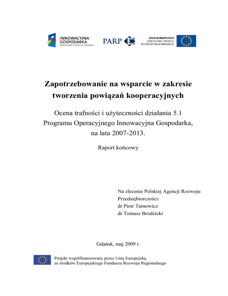 Zapotrzebowanie na wsparcie w zakresie tworzenia powiązań kooperacyjnych Ocena trafności i użyteczności działania 5.1 Programu Operacyjnego Innowacyjna Gospodarka, na lata 2007-2013. Raport końcowy Na zlecenie Polskiej Agencji Rozwoju Przedsiębiorczości: dr Piotr Tamowicz dr Tomasz Brodzicki Gdańsk, maj 2009 r. Projekt współfinansowany przez Unię Europejską ze środków Europejskiego Funduszu Rozwoju Regionalnego Zapotrzebowanie na wsparcie w zakresie tworzenia powiązań kooperacyjnych Ocena trafności i użyteczności działania 5.1 PO IG Raport końcowy Spis treści Streszczenie ............................................................................................................................ 3 Abstract ................................................................................................................................... 4 1. Metodologia ........................................................................................................................ 6 1.1 Cele ewaluacji............................................................................................................... 6 1.2 Techniki zbierania informacji i źródła.......................................................................... 7 2. Ogólna charakterystyka działania 5.1 ................................................................................. 8 2.1. Cele, istota wsparcia i uzasadnienie ............................................................................ 8 2.2. Warunki wsparcia ........................................................................................................ 9 3. Wcześniejsze instrumenty wsparcia ................................................................................. 12 4. Działanie 5.1 a inne programy operacyjne ....................................................................... 15 5. Charakterystyka grupy docelowej .................................................................................... 27 6. Użyteczność wsparcia ....................................................................................................... 41 7. Dotychczasowi beneficjenci wsparcia .............................................................................. 44 8. Perspektywy zapotrzebowania na wsparcie ..................................................................... 45 9. Zwrot niewykorzystanego wsparcia ................................................................................. 47 10. Promocja i komunikacja ................................................................................................. 48 11. Doświadczenia zagraniczne we wspieraniu klastrów ..................................................... 49 12. Wnioski i rekomendacje ................................................................................................. 59 13. Tabela zaleceń ................................................................................................................ 59 14. Bibliografia ..................................................................................................................... 60 15. Spis tabel i rysunków ...................................................................................................... 64 16. Załączniki ....................................................................................................................... 65 Dyspozycje do wywiadów ................................................................................................ 65 Lista przeprowadzonych wywiadów ................................................................................ 65 2 Zapotrzebowanie na wsparcie w zakresie tworzenia powiązań kooperacyjnych Ocena trafności i użyteczności działania 5.1 PO IG Raport końcowy Streszczenie Działanie 5.1 PO IG zostało zaprojektowane w celu obniżenia kosztów dostępu do kapitałochłonnej infrastruktury (budynki, budowle, wyposażenie) użytkowanej wspólnie przez przedsiębiorców powiązanych w ramach łańcucha wartości lub klastra. Oczekuje się, że wsparcie publiczne umożliwi obniżenie ryzyka inwestycyjnego związanego z realizacją innowacyjnych projektów (np. wdrożenie nowych produktów) lub też zwiększenie innowacyjności produktów już wytwarzanych. W przeciwieństwie do wcześniejszych instrumentów wsparcia, działanie 5.1 PO IG zostało zaadresowane do tzw. powiązań kooperacyjnych oraz ich koordynatorów spełniających określony zbiór warunków brzegowych (skład i struktura powiązania kooperacyjnego). Szczególną nowością jest pojawienie się wymogu zwrotu przez koordynatora tej części otrzymanego wsparcia, która nie zostanie skonsumowana przez przedsiębiorców (w formie nabywanych usług). Wcześniejsze działania wspierające rozwój klastrów (np. 2.6 ZPORR, 2.3 SPO RZL) zorientowane były głównie na tzw. działania miękkie służące promocji koncepcji klastrów, inicjowaniu współpracy pomiędzy przedsiębiorcami, formułowanie strategii rozwoju porozumień integracyjnych. Działania te przyczyniły się do znacznego spopularyzowania klastrów i intensyfikacji działań samo-organizacyjnych przedsiębiorców (np. zawiązywanie stowarzyszeń mających pełnić role animatorów/koordynatorów klastrów). Skutkiem ubocznym szerokiej akcji informacyjno-popularyzatorskiej było także powstanie wielu inicjatyw o wątłych podstawach gospodarczych i słabych możliwościach rozwoju. Problem ten istotnie rzutuje na perspektywy wykorzystania działania 5.1 PO IG gdyż populacja koordynatorów (potencjalnych wnioskodawców) składa się obecnie z dwóch rodzajów podmiotów: organizacji tworzonych oddolnie (przez przedsiębiorców) głównie w celu animacji/koordynacji klastrów, na ogół stosunkowo słabych organizacyjnie i finansowo oraz podmiotów wielozadaniowych (agencje rozwoju, firmy szkoleniowe, doradcze), prowadzących niejednokrotnie bardzo rozległą działalności, dysponujących du