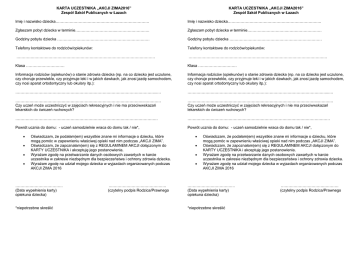 KARTA UCZESTNIKA „AKCJI ZIMA2016” Zespół Szkół Publicznych w Łazach KARTA UCZESTNIKA „AKCJI ZIMA2016” Zespół Szkół Publicznych w Łazach Imię i nazwisko dziecka………………………………………………………………. Imię i nazwisko dziecka………………………………………………………………. Zgłaszam pobyt dziecka w terminie………………………….……………………… Zgłaszam pobyt dziecka w terminie………………………….……………………… Godziny pobytu dziecka ……………………………………………………………… Godziny pobytu dziecka ……………………………………………………………… Telefony kontaktowe do rodziców/opiekunów: Telefony kontaktowe do rodziców/opiekunów: ……………………………………………………………………………………………… ……………………………………………………………………………………………… Klasa ………………………… Klasa ………………………… Informacja rodziców (opiekunów) o stanie zdrowia dziecka (np. na co dziecko jest uczulone, czy choruje przewlekle, czy przyjmuje leki i w jakich dawkach, jak znosi jazdę samochodem, czy nosi aparat ortodontyczny lub okulary itp.): Informacja rodziców (opiekunów) o stanie zdrowia dziecka (np. na co dziecko jest uczulone, czy choruje przewlekle, czy przyjmuje leki i w jakich dawkach, jak znosi jazdę samochodem, czy nosi aparat ortodontyczny lub okulary itp.): ………………………………………………………………………………………………...… ………………………………………………………………………………………………...… ………………………………………………………………………………………...………… Czy uczeń może uczestniczyć w zajęciach rekreacyjnych i nie ma przeciwwskazań lekarskich do ćwiczeń ruchowych? ………………………………………………………………………………………...………… Czy uczeń może uczestniczyć w zajęciach rekreacyjnych i nie ma przeciwwskazań lekarskich do ćwiczeń ruchowych? ………………………………………………………………………………………………… ………………………………………………………………………………………………… Powrót ucznia do domu: - uczeń samodzielnie wraca do domu tak / nie*, Powrót ucznia do domu: - uczeń samodzielnie wraca do domu tak / nie*, Oświadczam, że podałam(em) wszystkie znane mi informacje o dziecku, które mogą pomóc w zapewnieniu właściwej opieki nad nim podczas „AKCJI ZIMA”. Oświadczam, że zapoznałam(em) się z REGULAMINEM AKCJI dołączonym do KARTY UCZESTNIKA i akceptuję jego postanowienia. Wyrażam zgodę na przetwarzanie danych osobowych zawartych w karcie uczestnika w zakresie niezbędnym dla bezpieczeństwa i ochrony zdrowia dziecka. Wyrażam zgodę na udział mojego dziecka w wyjazdach organizowanych podczas AKCJI ZIMA 2016 ………………………………. (Data wypełnienia karty) opiekuna dziecka) *niepotrzebne skreślić ……………………………………… (czytelny podpis Rodzica/Prawnego Oświadczam, że podałam(em) wszystkie znane mi informacje o dziecku, które mogą pomóc w zapewnieniu właściwej opieki nad nim podczas „AKCJI ZIMA”. Oświadczam, że zapoznałam(em) się z REGULAMINEM AKCJI dołączonym do KARTY UCZESTNIKA i akceptuję jego postanowienia. Wyrażam zgodę na przetwarzanie danych osobowych zawartych w karcie uczestnika w zakresie niezbędnym dla bezpieczeństwa i ochrony zdrowia dziecka. Wyrażam zgodę na udział mojego dziecka w wyjazdach organizowanych podczas AKCJI ZIMA 2016 ………………………………. (Data wypełnienia karty) opiekuna dziecka) *niepotrzebne skreślić ……………………………………… (czytelny podpis Rodzica/Prawnego REGULAMIN „AKCJI ZIMA 2016” w Szkole Podstawowej w Łazach 1. Uczestnikiem akcji może być każde dziecko będące uczniem Szkoły Podstawowej w Łazach. W wyjątkowych przypadkach zasady udziału ucznia w akcji reguluje indywidualny kontrakt podpisany przez Rodziców/Prawnych opiekunów. 2. Dzieci przebywają pod opieką wychowawców w wyznaczonych godzinach. 3. Udział w zajęciach jest odpłatny, a jego wysokość ustalana jest w odniesieniu do danej akcji. 5. Rodzice są odpowiedzialni za bezpieczną drogę dziecka na zajęcia i z powrotem. 6. Dzieci są odbierane z placówki wyłącznie przez osoby wskazane w wypełnionym Oświadczeniu Rodziców / Opiekunów*. 7. W przypadku samodzielnego powrotu dziecka do domu rodzice są zobowiązani pozostawić wychowawcom taką informację w formie pisemnej.* 8. Uczestnicy mają obowiązek: a) brać udział w realizacji programu akcji; b) bezwzględnie podporządkować się poleceniom wychowawców c) zachować higienę osobistą i czystość, d) szanować mienie, pomoce dydaktyczne. e) przestrzegać regulaminów obiektów oraz zasad bezpieczeństwa podczas zabawy, zajęć dydaktyczno-wychowawczych; f) Przestrzegać zasad poruszania się po drogach i chodnikach podczas spacerów i wyjść plenerowych oraz organizowanych wycieczek autokarowych. 9. W przypadku rażącego naruszania zasad bezpieczeństwa przez dziecko (samowolne oddalenie się od opiekunów, niezdyscyplinowanie, niewykonywanie poleceń wychowawców, nieprzestrzeganie regulaminu, agresję w stosunku do innych osób) oraz może ono zostać pozbawione możliwości dalszego udziału w zajęciach. 10. Za szkody wyrządzone przez dziecko, materialnie odpowiedzialni są rodzice lub opiekunowie. 11. Organizator nie odpowiada za zagubienie, zniszczenie, bądź kradzież wartościowych przedmiotów uczestników akcji. Każdy przynosi rzeczy wartościowe na własną odpowiedzialność. 12. Rodzic zobo