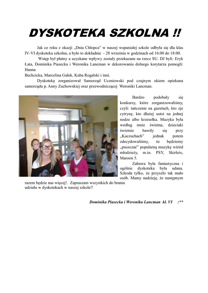 DYSKOTEKA SZKOLNA !! Jak co roku z okazji „Dnia Chłopca” w naszej wspaniałej szkole odbyła się dla klas IV-VI dyskoteka szkolna, a było to dokładnie - 28 września w godzinach od 16:00 do 18:00. Wstęp był płatny a uzyskane wpływy zostały przekazane na rzecz SU. DJ byli: Eryk Łata, Dominika Piasecka i Weronika Lancman w dekorowaniu dolnego korytarza pomogli: Hanna Bechcicka, Marcelina Gałek, Kuba Rogalski i inni. Dyskotekę zorganizował Samorząd Uczniowski pod czujnym okiem opiekuna samorządu p. Anny Zuchowskiej oraz przewodniczącej Weroniki Lancman. Bardzo podobały się konkursy, które zorganizowaliśmy, czyli: tańczenie na gazetach, kto zje cytrynę, kto dłużej ustoi na jednej nodze albo krzesełka. Muzyka była według mnie świetna, dzieciaki świetnie bawiły się przy „Kaczuchach” jednak potem zdecydowaliśmy, że będziemy „puszczać” popularną muzykę wśród młodzieży, m.in. PSY, Skirleix, Maroon 5. Zabawa była fantastyczna i ogólnie dyskoteka była udana. Szkoda tylko, że przyszło tak mało osób. Mamy nadzieję, że następnym razem będzie nas więcej!. Zapraszam wszystkich do brania udziału w dyskotekach w naszej szkole!! Dominika Piasecka i Weronika Lancman kl. VI :**