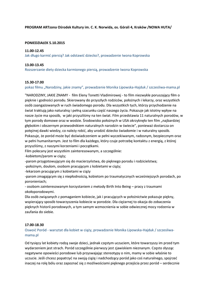 PROGRAM ARTzona Ośrodek Kultury im. C. K. Norwida, os. Górali 4, Kraków /NOWA HUTA/ PONIEDZIAŁEK 5.10.2015 11.00-12.45 Jak długo karmić piersią? Jak odstawić dziecko?, prowadzenie Iwona Koprowska 13.00-13.45 Rozszerzanie diety dziecka karmionego piersią, prowadzenie Iwona Koprowska 15.30-17.00 pokaz filmu „Narodziny, jakie znamy”, prowadzenie Monika Lipowska-Hajduk / szczesliwa-mama.pl "NARODZINY, JAKIE ZNAMY - film Eleny Tonetti Vladimirowej - to film niezwykle poruszający film o pięknie i godności porodu. Skierowany do przyszłych rodziców, położnych i lekarzy, oraz wszystkich osób zaangażowanych w ruch świadomego porodu. Dla wszystkich tych, którzy przychodzenie na świat traktują jako naturalną i pełną szacunku część naszego życia. Pokazuje jak istotny wpływ na nasze życie ma sposób, w jaki przyszliśmy na ten świat. Film przedstawia 11 naturalnych porodów, w tym porody domowe oraz w wodzie. Środowisko położnych w USA okrzyknęło ten film „najbardziej głębokim i obszernym przewodnikiem naturalnych narodzin w świecie", ponieważ dostarcza on potężnej dawki wiedzy, co należy robić, aby urodzić dziecko świadomie i w naturalny sposób. Pokazuje, że poród może być doświadczeniem w pełni wyczekiwanym, radosnym, bezpiecznym oraz w pełni humanitarnym. Jest to film dla każdego, który czuje potrzebę kontaktu z energią, z której przyszliśmy, z naszymi korzeniami i początkami. Film polecany jest wszystkim zainteresowanym, a szczególnie: -kobietom/parom w ciąży; -parom przygotowującym się do macierzyństwa, do pięknego porodu i rodzicielstwa; -położnym, doulom, osobom pracującym z kobietami w ciąży; -lekarzom pracującym z kobietami w ciąży -parom zmagającym się z niepłodnością, kobietom po traumatycznych wcześniejszych porodach, po poronieniach; - osobom zainteresowanym korzystaniem z metody Birth Into Being – pracy z traumami okołoporodowymi. Dla osób związanych z pomaganiem kobiecie, jak i pracujących w położnictwie pokazuje piękny, wspierający sposób towarzyszenia kobiecie w porodzie. Dla ciężarnej to okazja do zobaczenia pięknych historii porodowych, a tym samym wzmocnienia w sobie odwiecznej mocy rodzenia w zaufania do siebie. 17.00-18.30 Oswoić Poród - warsztat dla kobiet w ciąży, prowadzenie Monika Lipowska-Hajduk / szczesliwamama.pl Od tysięcy lat kobiety rodzą swoje dzieci, jednak częstym uczuciem, które towarzyszy im przed tym wydarzeniem jest strach. Poród szczególnie pierwszy jest zjawiskiem nieznanym. Często słysząc negatywne opowieści porodowe lub przyswajając stereotypy o nim, mamy w sobie właśnie to uczucie. Jeśli chcesz popatrzyć na swoją ciążę i nadchodzący poród jako coś naturalnego, spojrzeć inaczej na rolę bólu oraz zapoznać się z możliwościami pięknego przejścia przez poród – serdecznie zapraszam. Warsztat z wykorzystaniem technik Birth Into Being Eleny Tonetti-Vladimirowej. Warsztat adresowany jest do kobiet w ciąży. Wymagania: wygodny strój. Monika Lipowska-Hajduk – psycholożka, trenerka rozwoju osobistego, certyfikowaną w metodzie "Birth Into Being". Uczennica Eleny Tonetti – Vladimirowej. Prowadzi praktykę "Szczęśliwa Mama" ( www.szczesliwa-mama.pl, www.facebook.com/Szczesliwa.Mama, www.birthintobeing.com.pl) - gdzie udziela wsparcia psychologicznego dla kobiet planujących macierzyństwo, w ciąży, przygotowuje do porodu oraz wspiera we wszelkich aspektach i wyzwaniach macierzyństwa/rodzicielstwa. Metody Eleny TonettiVladimirovej (przedstawicielka ruchu na rzecz naturalnych narodzin), przygotowują do porodu poprzez uzdrawianie własnych doświadczeń porodowych. Wspiera we wprowadzaniu zmian w swoim życiu. W swojej pracy reprezentuje podejście holistyczne. Pracuje na wielu poziomach: psychicznym, emocjonalnym, duchowym, pracy z ciałem. Wierzy, że łączenie wszystkich aspektów funkcjonowania człowieka, daje możliwość odkrycia kim jesteśmy i życia w harmonii. Prowadzi także sesje Birth Into Being (kobiety/mężczyźni/pary) Sesje/warsztaty Birth Into Being (www.birthintobeing.com.pl) przeznaczone są dla wszystkich, którzy chcą zmienić swoje nieaktualne wzorce zachowania i funkcjonować w świecie w zgodzie ze sobą, naturą, w miłości i prawdzie. Pozwalają one uleczyć własną traumę narodzin, traumy i zranienia dzieciństwa, by otworzyć się na życie w pełni. Integrują wewnętrzne aspekty ludzkiego umysłu, tak by wspierały nas codziennym życiu. Monika Lipowska-Hajduk tel. 0509096046 [email protected] www.szczesliwa-mama.pl www.facebook.com/Szczesliwa.Mama www.birthintobeing.com.pl 17.00-18.00 Olejki eteryczne - naturalna profilaktyka i wzmacnianie odporności, wykład Anna Róża Hortmanowicz (niewskazany dla kobiet w ciąży) Anna Róża Hortmanowicz zajmuje się aromaterapią – są to m.in. olejki eteryczne terapeutycznej jakości, masaż Raindrop Technique. Zapraszamy na wykład "Olejki eteryczne - naturalna profilaktyka i wzmacnianie odporności" czyli jak przygotować dzieci, i nie tylko, pod względem kondycji organizmu, do okresu jesienno-zimowego i szkoły. Podczas wykładu dowiecie się czym są olejki eteryczne terapeutycznej jakości oraz o ich zastosowaniu w zapobieganiu chorobom (przeziębienie, grypa, rożne zapalenia), jak również co można zrobić jeśli choroba już nas "dopadnie". Pod czas wykładu będzie można powąchać olejki i wedle chęci wypróbować je na własnej skórze :) WTOREK 6.10.2015 10.00-12.00 Dobre (przy)wiązanie - warsztaty wiązania chust z przodu, prowadzenie Wanda Hałuniewicz / rodzinek.pl Kilkumetrowy barwny pas materiału służy nie tylko do przytwierdzenia dziecka do opiekuna w taki sposób, żeby uwolnić ręce. Chusta dba o wygodę, zdrowy kręgosłup i dobre samopoczucie noszonego i noszącego. Chusta pomaga w tworzeniu dobrej więzi. Zapraszamy do wspólnej nauki wiązania – nauczymy się, jak zrobić to sprawnie i dobrze! Warsztat dla 