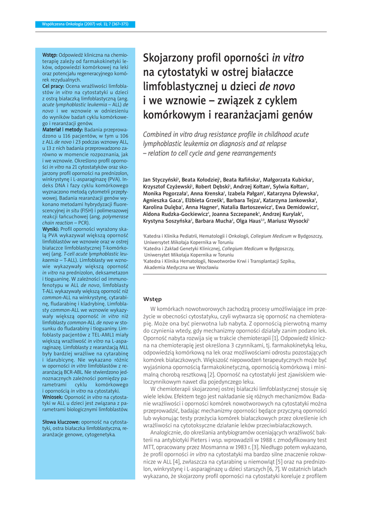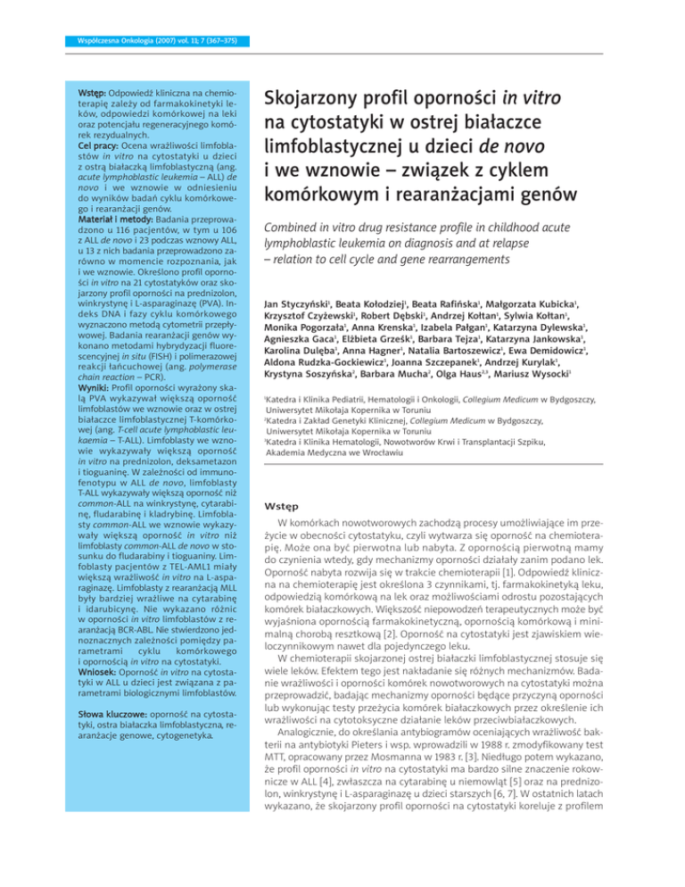 Współczesna Onkologia (2007) vol. 11; 7 (367–375) Wstęp: Odpowiedź kliniczna na chemioterapię zależy od farmakokinetyki leków, odpowiedzi komórkowej na leki oraz potencjału regeneracyjnego komórek rezydualnych. Cel pracy: Ocena wrażliwości limfoblastów in vitro na cytostatyki u dzieci z ostrą białaczką limfoblastyczną (ang. acute lymphoblastic leukemia – ALL) de novo i we wznowie w odniesieniu do wyników badań cyklu komórkowego i rearanżacji genów. Materiał i metody: Badania przeprowadzono u 116 pacjentów, w tym u 106 z ALL de novo i 23 podczas wznowy ALL, u 13 z nich badania przeprowadzono zarówno w momencie rozpoznania, jak i we wznowie. Określono profil oporności in vitro na 21 cytostatyków oraz skojarzony profil oporności na prednizolon, winkrystynę i L-asparaginazę (PVA). Indeks DNA i fazy cyklu komórkowego wyznaczono metodą cytometrii przepływowej. Badania rearanżacji genów wykonano metodami hybrydyzacji fluorescencyjnej in situ (FISH) i polimerazowej reakcji łańcuchowej (ang. polymerase chain reaction – PCR). Wyniki: Profil oporności wyrażony skalą PVA wykazywał większą oporność limfoblastów we wznowie oraz w ostrej białaczce limfoblastycznej T-komórkowej (ang. T-cell acute lymphoblastic leukaemia – T-ALL). Limfoblasty we wznowie wykazywały większą oporność in vitro na prednizolon, deksametazon i tioguaninę. W zależności od immunofenotypu w ALL de novo, limfoblasty T-ALL wykazywały większą oporność niż common-ALL na winkrystynę, cytarabinę, fludarabinę i kladrybinę. Limfoblasty common-ALL we wznowie wykazywały większą oporność in vitro niż limfoblasty common-ALL de novo w stosunku do fludarabiny i tioguaniny. Limfoblasty pacjentów z TEL-AML1 miały większą wrażliwość in vitro na L-asparaginazę. Limfoblasty z rearanżacją MLL były bardziej wrażliwe na cytarabinę i idarubicynę. Nie wykazano różnic w oporności in vitro limfoblastów z rearanżacją BCR-ABL. Nie stwierdzono jednoznacznych zależności pomiędzy parametrami cyklu komórkowego i opornością in vitro na cytostatyki. Wniosek: Oporność in vitro na cytostatyki w ALL u dzieci jest związana z parametrami biologicznymi limfoblastów. Słowa kluczowe: oporność na cytostatyki, ostra białaczka limfoblastyczna, rearanżacje genowe, cytogenetyka. Skojarzony profil oporności in vitro na cytostatyki w ostrej białaczce limfoblastycznej u dzieci de novo i we wznowie – związek z cyklem komórkowym i rearanżacjami genów Combined in vitro drug resistance profile in childhood acute lymphoblastic leukemia on diagnosis and at relapse – relation to cell cycle and gene rearrangements Jan Styczyński1, Beata Kołodziej1, Beata Rafińska1, Małgorzata Kubicka1, Krzysztof Czyżewski1, Robert Dębski1, Andrzej Kołtan1, Sylwia Kołtan1, Monika Pogorzała1, Anna Krenska1, Izabela Pałgan1, Katarzyna Dylewska1, Agnieszka Gaca1, Elżbieta Grześk1, Barbara Tejza1, Katarzyna Jankowska1, Karolina Dulęba1, Anna Hagner1, Natalia Bartoszewicz1, Ewa Demidowicz1, Aldona Rudzka-Gockiewicz1, Joanna Szczepanek1, Andrzej Kurylak1, Krystyna Soszyńska2, Barbara Mucha2, Olga Haus2,3, Mariusz Wysocki1 Katedra i Klinika Pediatrii, Hematologii i Onkologii, Collegium Medicum w Bydgoszczy, Uniwersytet Mikołaja Kopernika w Toruniu 2 Katedra i Zakład Genetyki Klinicznej, Collegium Medicum w Bydgoszczy, Uniwersytet Mikołaja Kopernika w Toruniu 3 Katedra i Klinika Hematologii, Nowotworów Krwi i Transplantacji Szpiku, Akademia Medyczna we Wrocławiu 1 Wstęp W komórkach nowotworowych zachodzą procesy umożliwiające im przeżycie w obecności cytostatyku, czyli wytwarza się oporność na chemioterapię. Może ona być pierwotna lub nabyta. Z opornością pierwotną mamy do czynienia wtedy, gdy mechanizmy oporności działały zanim podano lek. Oporność nabyta rozwija się w trakcie chemioterapii [1]. Odpowiedź kliniczna na chemioterapię jest określona 3 czynnikami, tj. farmakokinetyką leku, odpowiedzią komórkową na lek oraz możliwościami odrostu pozostających komórek białaczkowych. Większość niepowodzeń terapeutycznych może być wyjaśniona opornością farmakokinetyczną, opornością komórkową i minimalną chorobą resztkową [2]. Oporność na cytostatyki jest zjawiskiem wieloczynnikowym nawet dla pojedynczego leku. W chemioterapii skojarzonej ostrej białaczki limfoblastycznej stosuje się wiele leków. Efektem tego jest nakładanie się różnych mechanizmów. Badanie wrażliwości i oporności komórek nowotworowych na cytostatyki można przeprowadzić, badając mechanizmy oporności będące przyczyną oporności lub wykonując testy przeżycia komórek białaczkowych przez określenie ich wrażliwości na cytotoksyczne działanie leków przeciwbiałaczkowych. Analogicznie, do określania antybiogramów oceniających wrażliwość bakterii na antybiotyki Pieters i wsp. wprowadzili w 1988 r. zmodyfikowany test MTT, opracowany przez Mosmanna w 1983 r. [3]. Niedługo potem wykazano, że profil oporności in vitro na cytostatyki ma bardzo silne znaczenie rokownicze w ALL [4], zwłaszcza na cytarabinę u niemowląt [5] oraz na prednizolon, winkrystynę i L-asparaginazę u dzieci starszych [6, 7]. W ostatnich latach wykazano, że skojarzony profil oporności na cytostatyki koreluje z profilem Współczesna Onkologia (2007) vol. 11; 7 (367–375) Background: The clinical effect of chemotherapy is dependent on drug pharmacokinetics, cellular response and regenerative potential of residual cells. Objective: Analysis of in vitro drug resistance in childhood acute lymphoblastic leukaemia (ALL) on diagnosis and at relapse, with respect to cell cycle study and gene rearrangements. Material and methods: A total of 116 patients entered the study, including 106 de novo and 23 relapsed children; in 13 patients paired analysis was performed. In vitro drug resistance profile for 21 compounds was done by the MTT assay, including combined drug resi