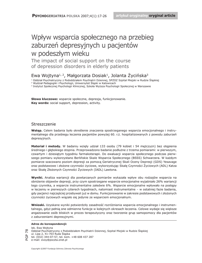 PSYCHOGERIATRIA POLSKA 2007;4(1):17-26 artykuł oryginalny oryginal article Wpływ wsparcia społecznego na przebieg zaburzeń depresyjnych u pacjentów w podeszłym wieku The impact of social support on the course of depression disorders in elderly patients Ewa Wojtyna1, 2, Małgorzata Dosiak1, Jolanta Życińska3 1 2 3 Oddział Psychiatryczny z Pododdziałem Psychiatrii Dziennej, SPZOZ Szpital Miejski w Rudzie Śląskiej Wydział Pedagogiki i Psychologii, Uniwersytet Śląski w Katowicach Instytut Społecznej Psychologii Klinicznej, Szkoła Wyższa Psychologii Społecznej w Warszawie Słowa kluczowe: wsparcie społeczne, depresja, funkcjonowanie. Key words: social support, depression, activity. Streszczenie Wstęp. Celem badania było określenie znaczenia spostrzeganego wsparcia emocjonalnego i instrumentalnego dla przebiegu leczenia pacjentów powyżej 60. r.ż. hospitalizowanych z powodu zaburzeń depresyjnych. Materiał i metody. W badaniu wzięły udział 133 osoby (79 kobiet i 54 mężczyzn) bez otępienia średniego i głębokiego stopnia. Przeprowadzono badanie podłużne z trzema pomiarami: w pierwszym, czwartym i dziesiątym tygodniu farmakoterapii. Do ewaluacji wsparcia społecznego podczas pierwszego pomiaru wykorzystano Berlińskie Skale Wsparcia Społecznego (BSSS) Schwarzera. W każdym pomiarze szacowano poziom depresji za pomocą Geriatrycznej Skali Oceny Depresji (GDS) Yesavage oraz podstawowe i złożone czynności życiowe, wykorzystując Skalę Czynności Życiowych (ADL) Katza oraz Skalę Złożonych Czynności Życiowych (IADL) Lawtona. Wyniki. Analiza wariancji dla powtarzanych pomiarów wykazała wpływ obu rodzajów wsparcia na obniżenie objawów depresji, przy czym spostrzegane wsparcie emocjonalne wyjaśniało 26% wariancji tego czynnika, a wsparcie instrumentalne zaledwie 6%. Wsparcie emocjonalne wpływało na postępy w leczeniu w pierwszych czterech tygodniach, natomiast instrumentalne – w ostatniej fazie badania, gdy pacjenci najczęściej przebywali już w domu. Funkcjonowanie w zakresie podstawowych i złożonych czynności życiowych wiązało się jedynie ze wsparciem emocjonalnym. Wnioski. Uzyskane wyniki potwierdziły zasadność rozróżniania wsparcia emocjonalnego i instrumentalnego, gdyż pełnią one odmienne funkcje w kolejnych okresach leczenia. Celowe wydaje się większe angażowanie osób bliskich w proces terapeutyczny oraz tworzenie grup samopomocy dla pacjentów z zaburzeniami depresyjnymi. PGP 78 Adres do korespondencji: lek. Ewa Wojtyna Oddział Psychiatryczny z Pododdziałem Psychiatrii Dziennej, Szpital Miejski w Rudzie Śląskiej ul. Lipa 2, 41-703 Ruda Śląska tel. (032) 344-07-57, tel. kom. +48 608 437 287 e-mail: [email protected] Copyright ©2007 Fundacja Ochrony Zdrowia Psychicznego 18 Ewa Wojtyna i wsp. Wsparcie społeczne w przebiegu zaburzeń depresyjnych Summary Objective. The goal of the research was creating the definition of the meaning of the perceiving emotional and instrumental support for the course of treatment of the inmates over 60 years old, hospitalised because of depression disorders. Method. The examination covered the 133 patients (79 females and 54 males). The inmates with dementia of medium and profound degree were excluded from the research. The studies were of linear character, including three measurements: in the first, fourth and tenth week of pharmacotherapy. In evaluating social support one used Berlin Social Support Scales (BSSS). In every measurement one scored the level of depression using Geriatric Depression Scale (GDS), elementary and complex life activities with Katz Index of Independence in Activities of Daily Living (ADL) and Patient Assessment Tool-Lawton’s Instrumental Activities of Daily Living (IADL) Scale Results. The analysis of variance with repeated measures revealed influence of both support types on decrease depression symptoms. Perceiving emotional explicated 26% of variance of that variable, and instrumental support only 6%. Emotional support influenced on the treatment progress in first four weeks, however instrumental – in further treatment phase. The performance of independence and instrumental everyday activities was related only with emotional support. Conclusions. Gained scores confirmed the essentiality of distinguishing emotional and instrumental support, because they fulfil different functions in succeeding stages of treatment. It seems purposeful involving close relatives in process of treatment and creating self-helping groups for elder people with depression disorders. Wstęp Zaburzenia depresyjne stanowią znaczny i wzrastający problem w populacji osób starszych. Depresja – obok otępienia – jest najczęstszym zaburzeniem psychicznym w tej grupie i dotyka ok. 15-30% osób w podeszłym wieku [1-3]. Innym rozpowszechnionym zjawiskiem, wynikającym ze zwiększającej się stale średniej długości życia, jest pogarszanie się fizycznego funkcjonowania ludzi starszych, co prowadzi do częstszego korzystania przez nich z opieki zdrowotnej i społecznej. W 1995 r. ponad 37% osób po 65. r.ż. zgłaszało trudności w wykonywaniu codziennych czynności życiowych z powodu chorób przewlekłych [4]. Osłabienie funkcjonowania w zakresie złożonych i podstawowych czynności życiowych wiąże się z wystąpieniem wyższego nasilenia depresji [4, 5]. Wykazano także związek odwrotny, gdzie zaburzenia depresyjne powodowały pogorszenie codziennego funkcjonowania pacjentów [6]. Wśród przyczyn tak szeroko spotykanych zaburzeń funkcjonowania ludzi starych należy prócz czynników biologicznych uwzględnić także czynniki psychospołeczne. Starość sprzyja pojawianiu się wielu stresorów, takich jak np. choroba, niepełnosprawność, żałoba, w obliczu których coraz trudniej radzić sobie jednostce. Związane z procesem starzenia się osłabienie funkcji poznawczych również może przyczynić się do mniej skutecznego redukowania poziomu stresu. Jednocz