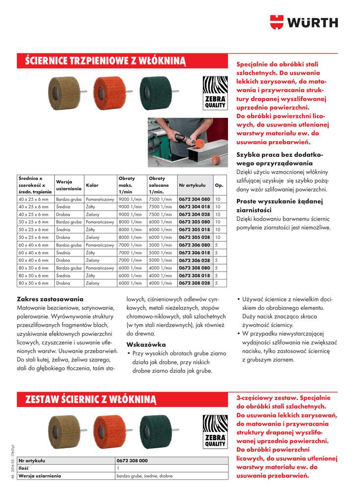 ŚCIERNICE TRZPIENIOWE Z WŁÓKNINĄ Średnica x Wersja szerokość x Kolor uziarnienia średn. trzpienia Obroty maks. 1/min Obroty zalecane 1/min. Op. 40 x 25 x 6 mm Bardzo gruba Pomarańczowy 9000 1/min 7500 1/min 0672 304 080 10 40 x 25 x 6 mm Średnia Żółty 9000 1/min 7500 1/min 0672 304 018 10 40 x 25 x 6 mm Drobna Zielony 9000 1/min 7500 1/min 0672 304 028 10 50 x 25 x 6 mm Bardzo gruba Pomarańczowy 8000 1/min 6000 1/min 0672 305 080 10 50 x 25 x 6 mm Średnia Żółty 8000 1/min 6000 1/min 0672 305 018 10 50 x 25 x 6 mm Drobna Zielony 8000 1/min 6000 1/min 0672 305 028 10 60 x 40 x 6 mm Bardzo gruba Pomarańczowy 7000 1/min 5000 1/min 0672 306 080 5 60 x 40 x 6 mm Średnia Żółty 7000 1/min 5000 1/min 0672 306 018 5 60 x 40 x 6 mm Drobna Zielony 7000 1/min 5000 1/min 0672 306 028 5 80 x 50 x 6 mm Bardzo gruba Pomarańczowy 6000 1/min 4000 1/min 0672 308 080 5 80 x 50 x 6 mm Średnia Żółty 6000 1/min 4000 1/min 0672 308 018 5 80 x 50 x 6 mm Drobna Zielony 6000 1/min 4000 1/min 0672 308 028 5 Zakres zastosowania Matowanie bezcieniowe, satynowanie, polerowanie. Wyrównywanie struktury przeszlifowanych fragmentów blach, uzyskiwanie efektownych powierzchni licowych, czyszczenie i usuwanie utlenionych warstw. Usuwanie przebarwień. Do stali kutej, żeliwa, żeliwa szarego, stali do głębokiego tłoczenia, taśm sta- lowych, ciśnieniowych odlewów cynkowych, metali nieżelaznych, stopów chromowo-niklowych, stali szlachetnych (w tym stali nierdzewnych), jak również do drewna. Wskazówka • Przy wysokich obrotach grube ziarno działa jak drobne, przy niskich drobne ziarno działa jak grube. ZESTAW ŚCIERNIC Z WŁÓKNINĄ AK - 2016-05 - 17601pl Nr artykułu Specjalnie do obróbki stali szlachetnych. Do usuwania lekkich zarysowań, do matowania i przywracania struktury drapanej wyszlifowanej uprzednio powierzchni. Do obróbki powierzchni licowych, do usuwania utlenionej warstwy materiału ew. do usuwania przebarwień. Nr artykułu 0672 308 000 Ilość 1 Wersja uziarnienia bardzo grube, średnie, drobne Szybka praca bez dodatkowego oprzyrządowania Dzięki użyciu wzmocnionej włókniny szlifującej uzyskuje się szybko pożądany wzór szlifowaniej powierzchni. Proste wyszukanie żądanej ziarnistości Dzięki kodowaniu barwnemu ściernic pomylenie ziarnstości jest niemożliwe. • Używać ściernice z niewielkim dociskiem do obrabianego elementu. Duży nacisk znacząco skraca żywotność ściernicy. • W przypadku niewystarczającej wydajności szlifowania nie zwiększać nacisku, tylko zastosować ściernicę z grubszym ziarnem. 3-częściowy zestaw. Specjalnie do obróbki stali szlachetnych. Do usuwania lekkich zarysowań, do matowania i przywracania struktury drapanej wyszlifowanej uprzednio powierzchni. Do obróbki powierzchni licowych, do usuwania utlenionej warstwy materiału ew. do usuwania przebarwień.