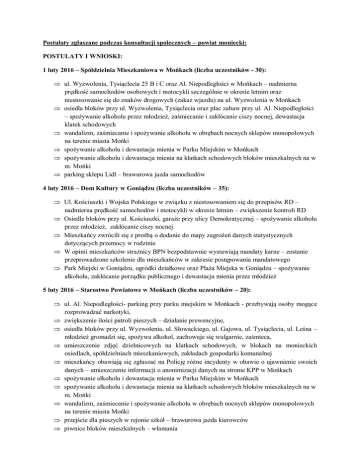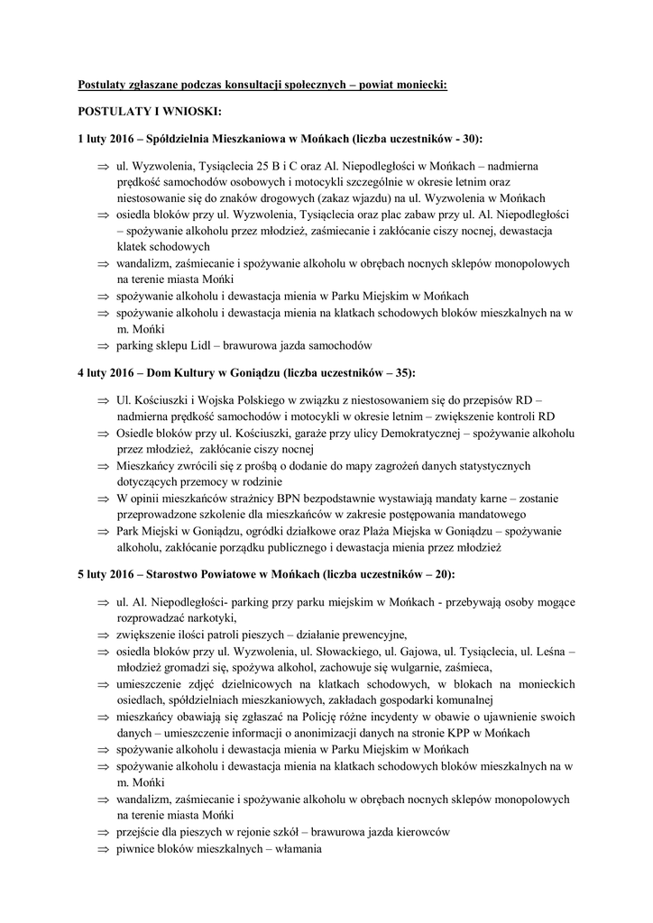 Postulaty zgłaszane podczas konsultacji społecznych – powiat moniecki: POSTULATY I WNIOSKI: 1 luty 2016 – Spółdzielnia Mieszkaniowa w Mońkach (liczba uczestników - 30): ul. Wyzwolenia, Tysiąclecia 25 B i C oraz Al. Niepodległości w Mońkach – nadmierna prędkość samochodów osobowych i motocykli szczególnie w okresie letnim oraz niestosowanie się do znaków drogowych (zakaz wjazdu) na ul. Wyzwolenia w Mońkach osiedla bloków przy ul. Wyzwolenia, Tysiąclecia oraz plac zabaw przy ul. Al. Niepodległości – spożywanie alkoholu przez młodzież, zaśmiecanie i zakłócanie ciszy nocnej, dewastacja klatek schodowych wandalizm, zaśmiecanie i spożywanie alkoholu w obrębach nocnych sklepów monopolowych na terenie miasta Mońki spożywanie alkoholu i dewastacja mienia w Parku Miejskim w Mońkach spożywanie alkoholu i dewastacja mienia na klatkach schodowych bloków mieszkalnych na w m. Mońki parking sklepu Lidl – brawurowa jazda samochodów 4 luty 2016 – Dom Kultury w Goniądzu (liczba uczestników – 35): Ul. Kościuszki i Wojska Polskiego w związku z niestosowaniem się do przepisów RD – nadmierna prędkość samochodów i motocykli w okresie letnim – zwiększenie kontroli RD Osiedle bloków przy ul. Kościuszki, garaże przy ulicy Demokratycznej – spożywanie alkoholu przez młodzież, zakłócanie ciszy nocnej Mieszkańcy zwrócili się z prośbą o dodanie do mapy zagrożeń danych statystycznych dotyczących przemocy w rodzinie W opinii mieszkańców strażnicy BPN bezpodstawnie wystawiają mandaty karne – zostanie przeprowadzone szkolenie dla mieszkańców w zakresie postępowania mandatowego Park Miejski w Goniądzu, ogródki działkowe oraz Plaża Miejska w Goniądzu – spożywanie alkoholu, zakłócanie porządku publicznego i dewastacja mienia przez młodzież 5 luty 2016 – Starostwo Powiatowe w Mońkach (liczba uczestników – 20): ul. Al. Niepodległości- parking przy parku miejskim w Mońkach - przebywają osoby mogące rozprowadzać narkotyki, zwiększenie ilości patroli pieszych – działanie prewencyjne, osiedla bloków przy ul. Wyzwolenia, ul. Słowackiego, ul. Gajowa, ul. Tysiąclecia, ul. Leśna – młodzież gromadzi się, spożywa alkohol, zachowuje się wulgarnie, zaśmieca, umieszczenie zdjęć dzielnicowych na klatkach schodowych, w blokach na monieckich osiedlach, spółdzielniach mieszkaniowych, zakładach gospodarki komunalnej mieszkańcy obawiają się zgłaszać na Policję różne incydenty w obawie o ujawnienie swoich danych – umieszczenie informacji o anonimizacji danych na stronie KPP w Mońkach spożywanie alkoholu i dewastacja mienia w Parku Miejskim w Mońkach spożywanie alkoholu i dewastacja mienia na klatkach schodowych bloków mieszkalnych na w m. Mońki wandalizm, zaśmiecanie i spożywanie alkoholu w obrębach nocnych sklepów monopolowych na terenie miasta Mońki przejście dla pieszych w rejonie szkół – brawurowa jazda kierowców piwnice bloków mieszkalnych – włamania 9 luty 2016 – Urząd Gminy w Knyszynie (liczba uczestników – 20): Zorganizowanie spotkania z seniorami dot. oszustw na wnuczka i innych zagrożeń kontrola kierowców pojazdów ciężarowych w m. Grądy – niestosowanie się do znaku ograniczającego tonaż umieszczenie znaku drogowego A – 18a (zwierzęta gospodarskie) na wybranych drogach w gminie Knyszyn wspólne patrole Policji i Straży Leśnej – kontrolowanie i karanie osób wywożących śmieci na teren prywatnych działek przy drodze krajowej nr 65 ul. Rynek w Knyszynie – nietrzeźwe osoby zaczepiające przechodniów parking sklepu Biedronka – niewłaściwe parkowanie kierowców boisko szkolne i rejon stadionu miejskiego w Knyszynie – spożywanie alkoholu przez młodzież plac zabaw na osiedlu w Knyszynie – spożywanie alkoholu droga Knyszyn Zamek – Krypno – brawurowa jazda kierowców wsie w gminie Knyszyn – brawurowa jazda kierowców 10 luty 2016 – Urząd Gminy Jaświły (liczba uczestników – 20): przejeżdżające przez Jaświły samochody ciężarowe przekraczające dozwoloną prędkość (na odcinku od strony miejscowości Knyszyn), zaśmiecanie dróg i pobocza przez uczestników dyskoteki (rejon parkingu, sklepów, pod kościołem), bezpieczeństwo na wodzie (zaginięcia i utonięcia) – plaża w Dolistowie – brak miejsc do wodowania łodzi, tratw, kajaków – apel do wójta w miejscowości Dolistowo – brak przejścia dla pieszych przy szkole, kościele wspólne służby strażników BPN z policjantami na odcinku Olszowej Drogi drogi w gminie Jaświły – brawurowa jazda kierowców plaża w Dolistowie – spożywanie alkoholu teren szkoły w Jaświłach – agresywnie zachowująca się młodzież przystanek autobusowy w m. Jaświły – brawurowa jazda, palenie tzw. „gumy” rejon dyskoteki Fantazja – spożywanie alkoholu, zażywanie narkotyków przez uczestników dyskoteki 16 luty 2016 – Gminny Ośrodek Kultury Sportu i Turystyki w Jasionówce (liczba uczestników – 16): Spożywanie alkoholu w rejonie sklepów w m. Jasionówka Niszczenie znaków drogowych na terenie m. Jasionówka Lustracja skrzyżowania dróg P1403B, P1405B,W671 w celu weryfikacji ustawienia znaku STOP Poszerzenie zatoczki przy zjeździe z drogi krajowej nr 8 na drogę nr P1405B w kierunku m. Jasionówka Ograniczenie prędkości w m. Krasne Folwarczne na drodze krajowej nr 8 17 luty 2016 – Gminny Ośrodek Kultury w Krypnie (liczba uczestników – 12): przejeżdżające przez miejscowości Krypno, Zygmunty i Góra samochody przekraczające dozwoloną prędkość, zaśmiecanie i spożywanie alkoholu przez młodzież w rejonie przystanków i świetlic wiejskim oraz sklepów monopolowych na terenie gminy Krypno (w weekendy) – zwiększenie patroli, bezpieczeństwo na wodzie (kąpiel w miejscu niedozwolonym, spożywanie alkoholu w rejonie plaży) – plaża w Górze – (zwiększenie patroli w okresie letnim) w miejscowości Góra – osoby poruszające 