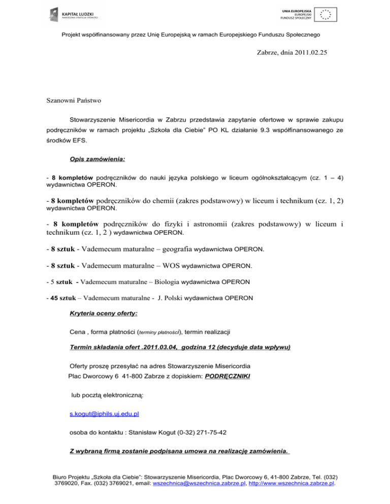 Projekt współfinansowany przez Unię Europejską w ramach Europejskiego Funduszu Społecznego Zabrze, dnia 2011.02.25 Szanowni Państwo Stowarzyszenie Misericordia w Zabrzu przedstawia zapytanie ofertowe w sprawie zakupu podręczników w ramach projektu „Szkoła dla Ciebie” PO KL działanie 9.3 współfinansowanego ze środków EFS. Opis zamówienia: - 8 kompletów podręczników do nauki języka polskiego w liceum ogólnokształcącym (cz. 1 – 4) wydawnictwa OPERON. - 8 kompletów podręczników do chemii (zakres podstawowy) w liceum i technikum (cz. 1, 2) wydawnictwa OPERON. - 8 kompletów podręczników do fizyki i astronomii (zakres podstawowy) w liceum i technikum (cz. 1, 2 ) wydawnictwa OPERON. - 8 sztuk - Vademecum maturalne – geografia wydawnictwa OPERON. - 8 sztuk - Vademecum maturalne – WOS wydawnictwa OPERON. - 5 sztuk - Vademecum maturalne – Biologia wydawnictwa OPERON - 45 sztuk – Vademecum maturalne - J. Polski wydawnictwa OPERON Kryteria oceny oferty: Cena , forma płatności (terminy płatności), termin realizacji Termin składania ofert .2011.03.04, godzina 12 (decyduje data wpływu) Oferty proszę przesyłać na adres Stowarzyszenie Misericordia Plac Dworcowy 6 41-800 Zabrze z dopiskiem: PODRĘCZNIKI lub pocztą elektroniczną: [email protected] osoba do kontaktu : Stanisław Kogut (0-32) 271-75-42 Z wybraną firmą zostanie podpisana umowa na realizację zamówienia. Biuro Projektu „Szkoła dla Ciebie”: Stowarzyszenie Misericordia, Plac Dworcowy 6, 41-800 Zabrze, Tel. (032) 3769020, Fax. (032) 3769021, email: [email protected], http://www.wszechnica.zabrze.pl. Projekt współfinansowany przez Unię Europejską w ramach Europejskiego Funduszu Społecznego Biuro Projektu „Szkoła dla Ciebie”: Stowarzyszenie Misericordia, Plac Dworcowy 6, 41-800 Zabrze, Tel. (032) 3769020, Fax. (032) 3769021, email: [email protected], http://www.wszechnica.zabrze.pl.