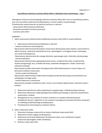 Załącznik nr 1 Specyfikacja techniczna wymiany Wieży WAII na Wydziale Kwasu Siarkowego – ciąg 7 Wymagania techniczne Zamawiającego odnośnie wymiany Wieży WA II wraz ze specyfikacją zakresu prac oraz warunków wykonania przedsięwzięcia w ramach zadania inwestycyjnego. Przedmiotowe zadanie planuje się wykonać pod klucz w zakresie: - opracowanie dokumentacji projektowej; - pozyskanie pozwoleń formalno-prawnych; - wymiana wieży WA II WARIANT I I. Zakres opracowania dokumentacji projektowej wymiany wieży WAII w nowej lokalizacji 1. Opracowanie dokumentacji projektowej w zakresie: - branża mechaniczno-technologiczna Opracowanie dokumentacji dla budowy nowej wieży absorpcyjnej (część stalowa, wymurówka ko, układ zraszania, zamkniecie hydrauliczne) wraz z gazociągami i rurociągami kwasu siarkowego oraz wody technologicznej. Opracowanie dokumentacji dla nowego zbiornika naporowego wieży i zbiornika cyrkulacyjnego. - branża budowlana Opracowanie dokumentacji zagospodarowania terenu, fundamentów wieży, fundamentów słupów pod gazociągi, tacy, schodów dla wieży, podestów obsługowych i drabin, konstrukcji stalowych estakady. Opracowanie projektu demontażu istniejącej wieży WAII zlokalizowanej w innym miejscu niż planowana budowa nowej wieży. - branża wodno-kanalizacyjna Opracowanie dokumentacji modernizacji istniejącej kanalizacji deszczowej, przemysłowej oraz istniejącego rurociągu wody. - branża elektryczna i pomiarowa Opracowanie projektu oświetlenia wieży i terenu oraz instalacji odgromowej i uziemienia wieży i estakad. 2. Wykonanie wtórnika do celów projektowych uzgodnionego z Zakładową Mapą Cyfrową. 3. Wykonanie odwiertów i badań geologicznych podłoża gruntowego w obszarze posadowienia nowej wieży i estakad. 4. Występowanie oraz uzyskanie w imieniu Inwestora w urzędach administracyjnych niezbędnych decyzji i uzgodnień w celu uzyskania wymaganych pozwoleń formalno–prawnych na realizację przedmiotowego przedsięwzięcia. 5. Przedstawienie harmonogramu realizacji zadania. II. Zakres wykonania robót: 1. Demontaż istniejącej nawierzchni w miejscu lokalizacji nowej wieży WAII. 2. Wykonanie nowych ciągów kanalizacyjnych. 3. Wykonanie konstrukcji żelbetowych (fundamenty wieży, taca, fundamenty słupów wsporczych gazociągów i klatki schodowej). 4. Budowa nowej wieży WAII. 5. Przebudowa gazociągu do nowej wieży oraz gazociągu wylotowego do komina z uwzględnieniem drenażu 6. Budowa nowego zbiornika (tzw. zamknięcia hydraulicznego) zasilającego zbiornik cyrkulacyjny. 7. Budowa nowego zbiornika cyrkulacyjnego lub modernizacja istniejącego. 8. Połączenie zamknięcia ze zbiornikiem cyrkulacyjnym rurociągiem kwasu 9. Wykonanie nowego rurociągu między nową wieżą WAII, a zamknięciem przed zbiornikiem cyrkulacyjnym. 10. Wykonanie konstrukcji pod przeniesiony istniejący zbiornik naporowy kwasu. 11. Przebudowa rurociągów: - pomiędzy chłodnicami istniejącymi, a zbiornikiem naporowym, - pomiędzy pompami kwasu, a nowym zbiornikiem naporowym - pomiędzy nowym zbiornikiem naporowym, a zbiornikiem cyrkulacyjnym - odpływu kwasu na przerzuty i magazyn. 12. Doprowadzenie wody procesowej do zbiornika cyrkulacyjnego. 13. Modernizacja istniejącej tacy pod wieżą WAII (obecnie istniejącą). 14. Wykonanie oświetlenia wieży i terenu oraz instalacji odgromowej i uziemienia wieży i estakad. 15. Utylizacja materiałów wyburzeniowych i zdemontowanych. III. IV. W celu doprecyzowania szczegółów wykonawczych Zamawiający wymaga przeprowadzenia wizji lokalnej przed złożeniem oferty. Podczas przeprowadzania wizji lokalnej Zamawiający udostępni posiadane dokumenty przedmiotowych obiektów i infrastruktury oraz wstępne założenia dla zadania. Wykonawca we własnym zakresie dokona weryfikacji ilości oraz powierzchni przewidzianych do przebudowy. WARIANT II I. Zakres opracowania dokumentacji projektowej wymiany wieży WAII w obecnej lokalizacji 1. Opracowanie dokumentacji projektowej w zakresie: - branża mechaniczno-technologiczna Opracowanie dokumentacji dla budowy nowej wieży absorpcyjnej (część stalowa, wymurówka ko, układ zraszania, zamkniecie hydrauliczne) wraz z gazociągami i rurociągami kwasu siarkowego oraz wody technologicznej. Opracowanie dokumentacji dla zbiornika nowego naporowego wieży i zbiornika cyrkulacyjnego. - branża budowlana Opracowanie dokumentacji zagospodarowania terenu, fundamentów wieży, fundamentów słupów pod gazociągi, tacy, schodów dla wieży, podestów obsługowych i drabin, konstrukcji stalowych estakady. Opracowanie projektu demontażu istniejącej wieży WAII. - branża wodno-kanalizacyjna Opracowanie dokumentacji modernizacji istniejącej kanalizacji deszczowej, przemysłowej oraz istniejącego rurociągu wody. - branża elektryczna i pomiarowa Opracowanie projektu oświetlenia wieży i terenu oraz instalacji odgromowej i uziemienia wieży i estakad. 2. Wykonanie wtórnika do celów projektowych uzgodnionego z Zakładową Mapą Cyfrową. 3. Wykonanie odwiertów i badań geologicznych podłoża gruntowego w obszarze posadowienia nowej wieży i estakad. 4. Występowanie oraz uzyskanie w imieniu Inwestora w urzędach administracyjnych niezbędnych decyzji i uzgodnień w celu uzyskania wymaganych pozwoleń formalno–prawnych na realizację przedmiotowego przedsięwzięcia. 5. Przedstawienie harmonogramu realizacji zadania. II. Zakres wykonania robót: 1. Demontaż istniejącej wieży WAII. 2. Wyburzenie istniejącego fundamentu wieży i tacy oraz. 3. Demontaż istniejących schodów, podestów i gazociągów. 4. Utylizacja materiałów wyburzeniowych i zdemontowanych. 5. Wykonanie nowych ciągów kanalizacyjnych. 6. Wykonanie konstrukcji żelbetowych (fundamenty wieży, taca, fundamenty słupów wsporczych gazociągów, podesty, schody)). 7. Budowa nowej wieży WAII. 8. Przebudowa gazociągów wieży oraz gazociągu wylotowego do komina z uwzględnieniem drenażu 9. Budowa 