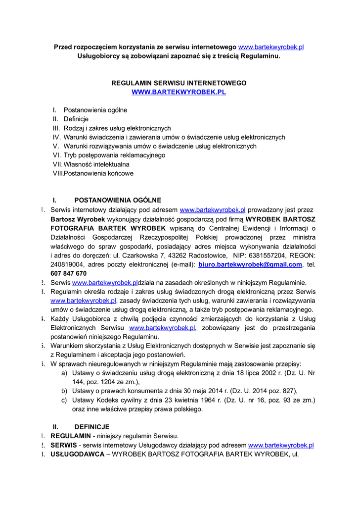Przed rozpoczęciem korzystania ze serwisu internetowego www.bartekwyrobek.pl Usługobiorcy są zobowiązani zapoznać się z treścią Regulaminu. REGULAMIN SERWISU INTERNETOWEGO WWW.BARTEKWYROBEK.PL I. Postanowienia ogólne II. Definicje III. Rodzaj i zakres usług elektronicznych IV. Warunki świadczenia i zawierania umów o świadczenie usług elektronicznych V. Warunki rozwiązywania umów o świadczenie usług elektronicznych VI. Tryb postępowania reklamacyjnego VII. Własność intelektualna VIII.Postanowienia końcowe I. POSTANOWIENIA OGÓLNE 1. Serwis internetowy działający pod adresem www.bartekwyrobek.pl prowadzony jest przez Bartosz Wyrobek wykonujący działalność gospodarczą pod firmą WYROBEK BARTOSZ FOTOGRAFIA BARTEK WYROBEK wpisaną do Centralnej Ewidencji i Informacji o Działalności Gospodarczej Rzeczypospolitej Polskiej prowadzonej przez ministra właściwego do spraw gospodarki, posiadający adres miejsca wykonywania działalności i adres do doręczeń: ul. Czarkowska 7, 43262 Radostowice, NIP: 6381557204, REGON: 240819004, adres poczty elektronicznej (email): [email protected], tel. 607 847 670 2. Serwis www.bartekwyrobek.pldziała na zasadach określonych w niniejszym Regulaminie. 3. Regulamin określa rodzaje i zakres usług świadczonych drogą elektroniczną przez Serwis www.bartekwyrobek.pl, zasady świadczenia tych usług, warunki zawierania i rozwiązywania umów o świadczenie usług drogą elektroniczną, a także tryb postępowania reklamacyjnego. 4. Każdy Usługobiorca z chwilą podjęcia czynności zmierzających do korzystania z Usług Elektronicznych Serwisu www.bartekwyrobek.pl, zobowiązany jest do przestrzegania postanowień niniejszego Regulaminu. 5. Warunkiem skorzystania z Usług Elektronicznych dostępnych w Serwisie jest zapoznanie się z Regulaminem i akceptacja jego postanowień. 6. W sprawach nieuregulowanych w niniejszym Regulaminie mają zastosowanie przepisy: a) Ustawy o świadczeniu usług drogą elektroniczną z dnia 18 lipca 2002 r. (Dz. U. Nr 144, poz. 1204 ze zm.), b) Ustawy o prawach konsumenta z dnia 30 maja 2014 r. (Dz. U. 2014 poz. 827), c) Ustawy Kodeks cywilny z dnia 23 kwietnia 1964 r. (Dz. U. nr 16, poz. 93 ze zm.) oraz inne właściwe przepisy prawa polskiego. II. DEFINICJE 1. REGULAMIN niniejszy regulamin Serwisu. 2. SERWIS serwis internetowy Usługodawcy działający pod adresem www.bartekwyrobek.pl 3. USŁUGODAWCA – WYROBEK BARTOSZ FOTOGRAFIA BARTEK WYROBEK, ul. Czarkowska 7, 43262 Radostowice, NIP: 6381557204, REGON: 240819004 4. USŁUGOBIORCA – osoba fizyczna, osoba prawna albo jednostka organizacyjna nieposiadająca osobowości prawnej, której ustawa przyznaje zdolność prawną korzystająca z Usługi Elektronicznej. 5. USŁUGA ELEKTRONICZNA – usługa świadczona drogą elektroniczną przez Usługodawcę na rzecz Usługobiorcy za pośrednictwem Serwisu. 6. NEWSLETTER – Usługa Elektroniczna pozwalająca Usługobiorcy na subskrybowanie i otrzymywanie na podany przez Usługobiorcę adres email bezpłatnych informacji pochodzących od Usługodawcy, dotyczących nowości w dostępnych w Serwisie. III. RODZAJ I ZAKRES USŁUG ELEKTRONICZNYCH 1. Usługodawca umożliwia za pośrednictwem Serwisu: a) korzystanie z formularza kontaktowego. b) korzystanie z Newslettera. 2. Świadczenie Usługi Elektronicznej na rzecz Usługobiorców w Serwisie odbywa się na warunkach określonych w Regulaminie. 3. Usługodawca ma prawo do zamieszczania na stronie Serwisu treści reklamowych. Treści te, stanowią integralną część Serwisu i prezentowanych w nim materiałów. IV. 1. 2. 3. 4. 5. 6. WARUNKI ŚWIADCZENIIA I ZAWIERANIA UMÓW O ŚWIADCZENIE USŁUG ELEKTRONICZNYCH Świadczenie Usługi Elektronicznej określonych w rozdziale III pkt. 1 Regulaminu przez Usługodawcę jest nieodpłatne Umowa o świadczenie Usługi Elektronicznej polegającej na korzystaniu z Newslettera zawierana jest na czas nieoznaczony. Wymagania techniczne niezbędne do współpracy z systemem teleinformatycznym, którym posługuje się Usługodawca: a) komputer z dostępem do Internetu, b) dostęp do poczty elektronicznej, c) przeglądarka internetowa, d) włączenie w przeglądarce internetowej Cookies oraz Javascript. Usługobiorca zobowiązany jest do korzystania z Serwisu w sposób zgodny z prawem i dobrymi obyczajami mając na uwadze poszanowanie dóbr osobistych i praw własności intelektualnej osób trzecich. Usługobiorca zobowiązany jest do wprowadzania danych zgodnych ze stanem faktycznym. Usługobiorcę obowiązuje zakaz dostarczania treści o charakterze bezprawnym. V. WARUNKI ROZWIĄZYWANIA UMÓW O ŚWIADCZENIE USŁUG ELEKTRONICZNYCH 1. Wypowiedzenie umowy o świadczenie Usługi Elektronicznej: a) Wypowiedzeniu może ulec umowa o świadczenie Usługi Elektronicznej o charakterze ciągłym i bezterminowym (np. korzystanie z Newslettera). b) Usługobiorca może wypowiedzieć umowę ze skutkiem natychmiastowym i bez wskazywania przyczyn poprzez przesłanie stosownego oświadczenia za pośrednictwem poczty elektronicznej na adres: [email protected], c) Usługodawca może wypowiedzieć umowę o świadczenie usługi drogą elektroniczną o charakterze ciągłym i bezterminowym w przypadku, gdy Usługobiorca narusza Regulamin, w szczególności, gdy dostarcza treści o charakterze bezprawnym po bezskutecznym wcześniejszym wezwaniu do zaprzestania naruszeń z wyznaczeniem odpowiedniego terminu. Umowa w takim wypadku wygasa po upływie 7 dni od dnia złożenia oświadczenia woli o jej wypowiedzeniu (okres wypowiedzenia). d) Wypowiedzenie prowadzi do ustania stosunku prawnego ze skutkiem na przyszłość. 2. Usługodawca i Usługobiorca mogą rozwiązać umowę o świadczenie Usługi Elektronicznej w każdym czasie w drodze porozumienia stron. VI. TRYB POSTĘPOWANIA REKLAMACYJNEGO 1. Reklamacje związane ze świadczeniem Usług Elektronicznych przez Usługodawcę: a) Reklamacje związane ze świadczeniem Usług Elektronicznych za pośredni