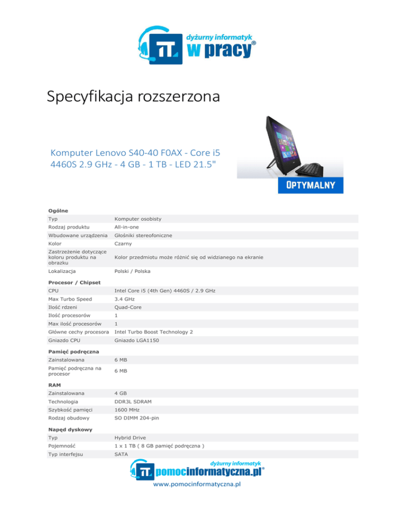 Specyfikacja rozszerzona Komputer Lenovo S40-40 F0AX - Core i5 4460S 2.9 GHz - 4 GB - 1 TB - LED 21.5" Ogólne Typ Komputer osobisty Rodzaj produktu All-in-one Wbudowane urządzenia Głośniki stereofoniczne Kolor Czarny Zastrzeżenie dotyczące koloru produktu na obrazku Kolor przedmiotu może różnić się od widzianego na ekranie Lokalizacja Polski / Polska Procesor / Chipset CPU Intel Core i5 (4th Gen) 4460S / 2.9 GHz Max Turbo Speed 3.4 GHz Ilość rdzeni Quad-Core Ilość procesorów 1 Max ilość procesorów 1 Główne cechy procesora Intel Turbo Boost Technology 2 Gniazdo CPU Gniazdo LGA1150 Pamięć podręczna Zainstalowana 6 MB Pamięć podręczna na procesor 6 MB RAM Zainstalowana 4 GB Technologia DDR3L SDRAM Szybkość pamięci 1600 MHz Rodzaj obudowy SO DIMM 204-pin Napęd dyskowy Typ Hybrid Drive Pojemność 1 x 1 TB ( 8 GB pamięć podręczna ) Typ interfejsu SATA www.pomocinformatyczna.pl Prędkość obrotowa 7200 obr/min Kontroler pamięci masowej Typ 1 x SATA - zintegrowany Napęd optyczny Typ DVD-ROM - SATA Czytnik kart Typ Czytnik kart 6 w 1 Monitor Typ monitora LED Wielkość przekątnej 21.5" Rozdzielczość natywna 1920 x 1080 ( Full HD ) Wyświetlacz szerokoekranowy Tak Współczynnik kształtu obrazu 16:9 Cechy monitora Podstawa pod monitor Sterownik grafiki - typ Zintegrowany Procesor graficzny Intel HD Graphics 4600 Interfejsy wideo HDMI Wyjście sygnału audio - typ Zintegrowany Dołączone głośniki 2 x kanał prawy / lewy Aparat fotograficzny Obudowa Zintegrowany Urządzenie wejściowe Typ Mysz,klawiatura Klawiatura Interfejs USB Mysz Interfejs USB Praca w sieci Obsługa sieci bezprzewodowej LAN Tak Protokół komunkacyjny danych Ethernet,Fast Ethernet,Gigabit Ethernet,Bluetooth,IEEE 802.11b,IEEE 802.11a,IEEE 802.11g,IEEE 802.11n,IEEE 802.11ac Rozszerzenie / połączenie Sloty 2 (całkowity) / 1 (wolna) x SO DIMM 204-pin 1 (całkowity) / 0 (wolna) x CPU Interfejsy 2 1 1 1 1 3 x x x x x x USB 3.0 ( 2 z przodu ) mikrofon ( 1 z przodu ) słuchawki ( 1 z przodu ) wyjście HDMI LAN (Gigabit Ethernet) USB 2.0 Zasilanie Rodzaj urządzenia Zasilacz Napięcie nominalne AC 120/230 V ( 50/60 Hz ) Moc wyjściowa 120 wat System operacyjny / Oprogramowanie www.pomocinformatyczna.pl Dołączony system operacyjny Windows 8.1 Pro Gwarancja producenta Obsługa i wsparcie 1 rok gwarancji Szczegóły obsługi i wsparcia Gwarancja ograniczona - 1 rok - dostawa Wymiary i waga Waga 9 kg Parametry środowiska Minimalna temperatura pracy 10 °C Maksymalna temperatura pracy 35 °C Dopuszczalna wilgotność 35 - 80% www.pomocinformatyczna.pl
