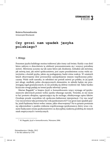 Bożena Rozwadowska Uniwersytet Wrocławski Czy grozi nam upadek języka polskiego? 1. Wstęp Fenomen języka ludzkiego można traktować jako ósmy cud świata. Każdy z nas dość łatwo nabywa w dzieciństwie tę zdolność porozumiewania się i wszyscy potrafimy mówić. Mówienia uczymy się tak samo łatwo jak chodzenia. Jednakże jak mówimy, jak mówią inni, jak mówi społeczeństwo, jest często przedmiotem oceny wielu autorytetów, a kształt języka, jakim się posługujemy, budzi różne reakcje. W ostatnich latach obserwujemy dość powszechne zaniepokojenie stanem współczesnej polszczyzny. Wiele osób narzeka, że młodzież nie potrafi mówić po polsku, że jej język jest ubogi, niedbały, pełen obcojęzycznych elementów, że młodzi ludzie nie przestrzegają reguł gramatycznych, że nie potrafią się dobrze wysłowić itd. Także bardzo krytyczne uwagi padają na temat języka telewizji i prasy. Marian Bugajski1 w książce Język w komunikowaniu wręcz wymaga od językoznawców aktywnych postaw wobec języka własnego narodu. Twierdzi, że nie może to być postawa obojętna, ograniczająca się do suchego, obiektywnego opisu faktów. Oczekuje przede wszystkim ich społeczno-kulturowej interpretacji. Czy ma rację? Czy rzeczywiście taka powinna być rola językoznawców? Czy grozi nam upadek języka, jeżeli będziemy bierni wobec zmian, jakie obserwujemy? Na to pytanie postaram się odpowiedzieć z punktu widzenia współczesnego językoznawcy, który wraz z innymi badaczami uważa językoznawstwo za dyscyplinę naukową podobną do innych nauk empirycznych i teoretycznych. 1 M. Bugajski, Język w komunikowaniu, Warszawa 2006. Dziennikarstwo i Media, 2012 © for this edition by CNS DiM.indd 205 2013-02-05 12:33:06 206 Bożena Rozwadowska 2. Przejawy niepokoju o stan polszczyzny Wyrazem rosnącego niepokoju o stan współczesnej polszczyzny jest między innymi ustawa o języku polskim oraz powołanie do życia instytucji zwanej Radą Języka Polskiego przy Prezydium PAN. Ustawa o języku polskim2 została wprowadzona uchwałą parlamentu i uzasadniona jest troską o nasz język ojczysty. W ustawie tej czytamy między innymi, że zachowanie polskiej kultury i jej rozwój jest możliwy tylko poprzez ochronę języka polskiego. Już samo stwierdzenie, że język polski wymaga ochrony, implikuje, że uznano go za zagrożony. W czym tkwi zagrożenie? Na czym ma polegać ochrona? Jak czytamy w owej ustawie, ochrona ma polegać między innymi na „dbaniu o poprawne używanie języka i doskonaleniu sprawności językowej jego użytkowników oraz na stwarzaniu warunków do właściwego rozwoju języka jako narzędzia międzyludzkiej komunikacji”. Do ochrony języka polskiego ustawa zobowiązuje wszystkie organy władzy publicznej oraz instytucje i organizacje uczestniczące w życiu publicznym. Rada Języka Polskiego, powołana również na podstawie owej ustawy, ma stać na straży ochrony polszczyzny. W sprawozdaniu Rady o stanie ochrony języka za lata 2003–2004 oraz w stenogramie posiedzenia Senatu z 11 kwietnia 2008 roku można znaleźć między innymi następujące uwagi: Uczniowie gimnazjum i szkół ponadgimnazjalnych uznają lekcje języków obcych, informatykę i zajęcia komputerowe za bardziej przydatne w praktyce i życiu niż lekcje języka ojczystego. Obniża się również poziom poprawności językowej — wykroczenia przeciw normie są w przekonaniu młodzieży mało istotne. Wynika to z uwarunkowań cywilizacyjnych. Ekspansywny rozwój mediów i technologii informatycznych ukształtował nową rzeczywistość kulturową i komunikacyjną, której przejawem są inne formy i sposoby porozumiewania się. Poziom kultury języka w szkole stale się obniża. [W mediach obserwuje się] wszechobecność elementów stylu potocznego i zapożyczeń angielskich, dalsze istnienie składników żargonu urzędowo-kancelaryjnego, ekspansję wulgaryzmów. Te zmiany powodują upowszechnianie się normy potocznej w języku programów telewizyjnych, co wpływa na obniżenie ich poziomu językowego. Współczesna polska reklama coraz częściej jest przesycona elementami angielskimi. Próby wyeliminowania uchybień językowych z tekstów reklam nie są łatwe. Autorzy bronią uparcie swoich oryginalnych pomysłów, nie biorąc pod uwagę tego, że wiele osób (nie tylko językoznawcy) dostrzega napuszone konstrukcje stylistyczne i błędy językowe. Drażnią one odbiorców bardziej niż w sytuacji, gdy podobne uchybienia pojawiają się w wypowiedziach dziennikarzy. 2 Ustawa o języku polskim z dnia 7 października 1999 r. Dz.U. z dnia 8 listopada 1999 r., Nr 90, poz. 999. Dziennikarstwo i Media, 2012 © for this edition by CNS DiM.indd 206 2013-02-05 12:33:06 Czy grozi nam upadek języka polskiego? 207 Na posiedzeniu Senatu, komentując podręczniki szkolne, prof. Markowski, przewodniczący Komisji, cytuje takie nieprawidłowości, jak brak odmiany nazwiska Kolbe, tzn. ojca Kolbe zamiast ojca Kolbego czy też sformułowania jak lasy są w stanie spełniać rolę czyściciela powietrza zamiast lasy mogą być środowiskiem oczyszczającym powietrze. W kolejnej swej wypowiedzi, dotyczącej powstania nowego typu polszczyzny rozwijanego w internecie, prof. Markowski stwierdza, że „z chwilą pojawienia się blogów, czatów, wywiadów internetowych, zrodził się trzeci typ polszczyzny, który się nazywa polszczyzną zapisaną (oprócz mówionej i pisanej)”. Mówi dalej, że „jesteśmy świadkami czegoś zupełnie niebywałego, a mianowicie coraz większa liczba, chyba już ponad 50%, Polaków pisze. Dotąd szacowało się, że pisali tylko ci, co musieli, i to było z 10% Polaków, inni tylko mówili, a nie pisali”. Prof. Markowski krytykuje też zjawisko, które nazywa snobizmem i które utożsamia z bezmyślnym uleganiem modzie na anglicyzmy. Członkom Rady nie podobają się też nazwy firm. Obok nazw ładnych, takich jak Ciżemka, Same Pyszności, Kopcius