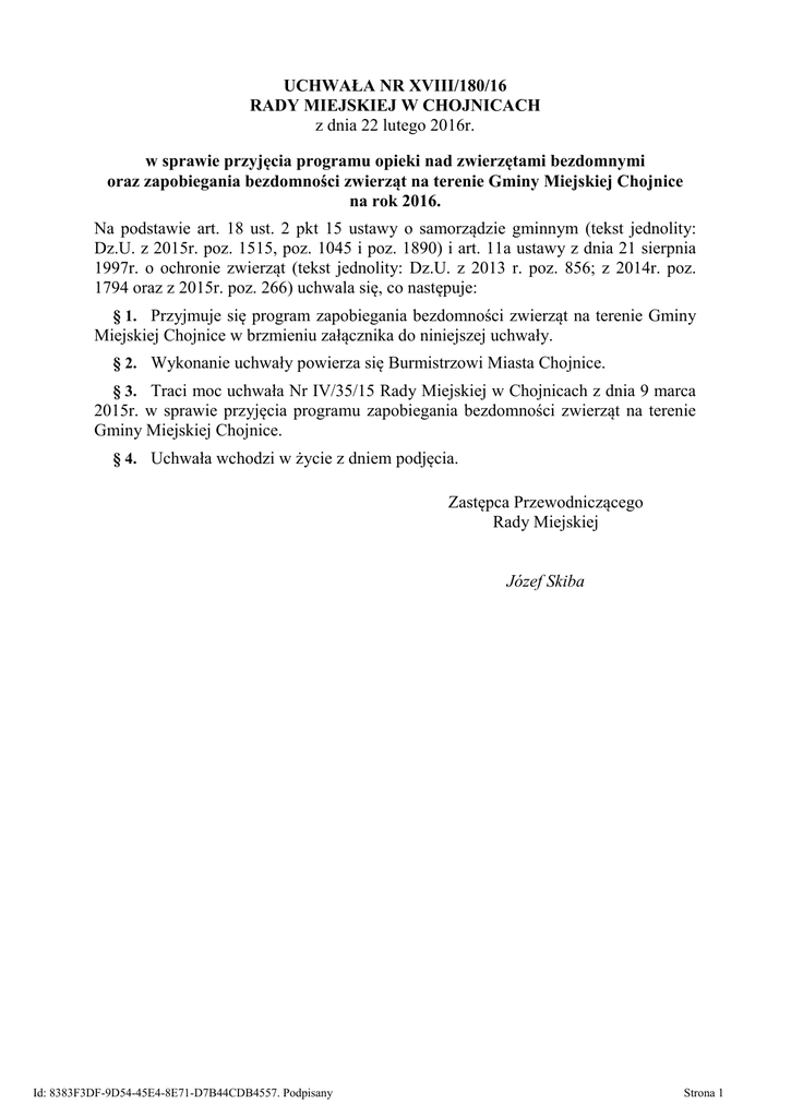 UCHWAŁA NR XVIII/180/16 RADY MIEJSKIEJ W CHOJNICACH z dnia 22 lutego 2016r. w sprawie przyjęcia programu opieki nad zwierzętami bezdomnymi oraz zapobiegania bezdomności zwierząt na terenie Gminy Miejskiej Chojnice na rok 2016. Na podstawie art. 18 ust. 2 pkt 15 ustawy o samorządzie gminnym (tekst jednolity: Dz.U. z 2015r. poz. 1515, poz. 1045 i poz. 1890) i art. 11a ustawy z dnia 21 sierpnia 1997r. o ochronie zwierząt (tekst jednolity: Dz.U. z 2013 r. poz. 856; z 2014r. poz. 1794 oraz z 2015r. poz. 266) uchwala się, co następuje: § 1. Przyjmuje się program zapobiegania bezdomności zwierząt na terenie Gminy Miejskiej Chojnice w brzmieniu załącznika do niniejszej uchwały. § 2. Wykonanie uchwały powierza się Burmistrzowi Miasta Chojnice. § 3. Traci moc uchwała Nr IV/35/15 Rady Miejskiej w Chojnicach z dnia 9 marca 2015r. w sprawie przyjęcia programu zapobiegania bezdomności zwierząt na terenie Gminy Miejskiej Chojnice. § 4. Uchwała wchodzi w życie z dniem podjęcia. Zastępca Przewodniczącego Rady Miejskiej Józef Skiba Id: 8383F3DF-9D54-45E4-8E71-D7B44CDB4557. Podpisany Strona 1 Załącznik do Uchwały Nr XVIII/180/16 Rady Miejskiej w Chojnicach z dnia 22 lutego 2016r. Program opieki nad zwierzętami bezdomnymi oraz zapobiegania bezdomności zwierząt na terenie Gminy Miejskiej Chojnice na 2016r. Rozdział 1. Cele oraz wykonawcy programu § 1. Rada Miejska Chojnice określa następujące cele gminnego programu opieki na zwierzętami bezdomnymi oraz zapobiegania bezdomności zwierząt domowych: 1) zapewnienie opieki zwierzętom bezdomnym z terenu Gminy Miejskiej Chojnice; 2) zmniejszenie populacji zwierząt bezdomnych; 3) zapewnienie właściwej opieki nad zwierzętami domowymi przez mieszkańców Gminy Miejskiej Chojnice; 4) edukacja mieszkańców Gminy Miejskiej Chojnice w zakresie humanitarnego traktowania zwierząt. § 2. Realizację działań dotyczących opieki nad zwierzętami bezdomnymi oraz zapobiegania bezdomności zwierząt prowadzi Burmistrz Miasta Chojnice przy wzajemnej współpracy: 1) Wydziału Gospodarki Komunalnej i Ochrony Środowiska Urzędu Miejskiego w Chojnicach; 2) Chojnickiego Stowarzyszenia Miłośników Zwierząt w Chojnicach ul. Igielska 24 jako podmiot prowadzący Schronisko dla Bezdomnych Zwierząt „Przytulisko” w Chojnicach przy ul. Igielskiej 24 poprzez zapewnienie opieki zwierzętom bezdomnym; 3) Straż Miejska; 4) organizacje społeczne – Chojnickie Stowarzyszenie Miłośników Zwierząt, których statutowym celem działania jest ochrona zwierząt. 5) placówki oświatowe poprzez aktywne uczestniczenie w działaniach informacyjnych i edukacyjnych mieszkańców. Rozdział 2. Realizacja założonych celów § 3. Zapewnienie opieki bezdomnym zwierzętom realizowane jest poprzez podmioty wskazane w § 2: 1) zapewnienie bezdomnym zwierzętom domowym miejsca w schronisku dla zwierząt; 2) zapewnienie w Gospodarstwie Rolnym p. Bernadeta Rymon Lipińska, 89-600 Chojnice, ul. Morozowa 3, miejsca dla bezdomnych zwierząt gospodarskich odebranych właścicielowi; 3) zbieranie z terenu Gminy Miejskiej Chojnice psów bezdomnych, zagubionych, wałęsających się, pozostających bez opieki właściciela. Czynności te wykonuje Schronisko w ramach umowy o powierzeniu jego prowadzenia; 4) umożliwienie przekazania pod tymczasową opiekę Gminy Miejskiej Chojnice zwierząt, które w wyniku wypadków losowych (zgon właściciela, długotrwały pobyt w szpitalu, itp.) utraciły właściciela. Powyższe obowiązki realizuje podmiot określony w § 2 pkt 3. 5) zapewnienie opieki weterynaryjnej, schronienia i wyżywienia bezdomnym psom zebranym z terenu Gminy Miejskiej Chojnice oraz zwierzętom, które utraciły właściciela. Czynności te wykonuje Schronisko w ramach umowy o powierzeniu jego prowadzenia; 6) poszukiwanie nowych właścicieli dla zwierząt bezdomnych przebywających w schronisku dla zwierząt. Realizacje tego zadania prowadzi bezpośrednio Schronisko z wykorzystaniem lokalnej prasy, internetu, rozmów z bezpośrednio zainteresowanymi, itp.; 7) uruchomienie punktu informacyjnego ds. interwencji w sprawach: zapewnienia opieki bezdomnym zwierzętom, uwalniania zwierząt z pułapek, udzielania pomocy weterynaryj- Id: 8383F3DF-9D54-45E4-8E71-D7B44CDB4557. Podpisany Strona 2 nej zwierzętom poszkodowanym w wypadkach komunikacyjnych, których właścicieli nie ustalono, przyjmowaniu zgłoszeń o błąkających się zwierzętach, itp. Zadanie to realizowane jest przez Schronisko dla Bezdomnych Zwierząt przy ul. Igielskiej 24 w Chojnicach w ramach umowy o powierzeniu jego prowadzenia. § 4. Zmniejszenie populacji zwierząt bezdomnych realizowane poprzez: 1) prowadzenie działań edukacyjnych w zakresie opieki nad zwierzętami i humanitarnego traktowania zwierząt; 2) wykonywanie na koszt Gminy Miejskiej Chojnice sterylizacji i kastracji zwierząt bezdomnych przebywających w schronisku dla zwierząt na zasadach ustalonych z jednostką prowadzącą Schronisko; 3) zabiegi sterylizacji i kastracji przeprowadzane przez lekarza weterynarii, nie wcześniej niż po upływie 14 dni od umieszczenia zwierzęcia w schronisku z uwagi na możliwość zgłoszenia się właściciela lub opiekuna; 4) współpracę ze społecznymi opiekunami kotów wolno żyjących w zakresie ograniczania ich rozrodczości oraz ich dokarmiania. Obowiązki te realizuje Schronisko dla bezdomnych zwierząt, które w ramach współpracy z opiekunami przekazuje karmę, środki antykoncepcyjne oraz koordynuje i finansuje zabiegi sterylizacji i kastracji kotów, 5) usypiania „ślepych miotów”, w Schronisku dla bezdomnych zwierząt przez lekarza weterynarii tam zatrudnionego. § 5. Edukacja mieszkańców Gminy Miejskiej Chojnice w zakresie humanitarnego traktowania zwierząt realizowana poprzez: 1) współpracę w szkołach i przedszkolach z terenu Gminy Miejskiej Chojnice do włączenia treści programowych w dziedzinie ochrony środowiska, zagadnień związanych z humani