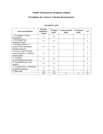 Studia Stacjonarne drugiego stopnia Przedmiot do wyboru: Chemia Kosmetyków Szczegółowy plan Nazwa przedmiotu 1. Receptura i forma kosmetyku 2. Reologia form kosmetycznych 3. Bezpieczeństwo i skuteczność produktów kosmetycznych 4. Nowoczesne metody instrumentalne w analizie kosmetyków 5. Związki powierzchniowoczynne 6. Antyutleniacze i ich analiza 7. Fotostarzenie i substancje promieniochronne 8. Barwniki Wymiar godzinowy razem Wykład godz. 15 15 2 15 15 2 15 15 2 15 15 2 15 15 2 15 15 2 15 15 2 15 120 15 120 2 16 Laboratorium godz. 0 Ćwiczenia godz. 0 CP