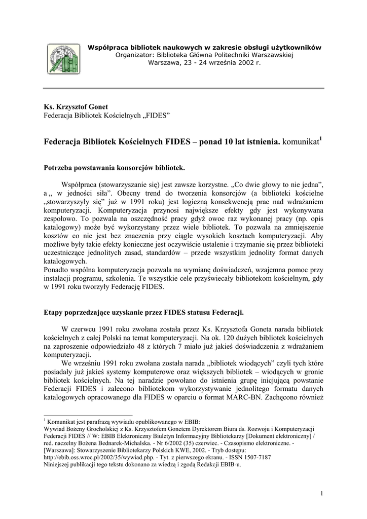 Współpraca bibliotek naukowych w zakresie obsługi użytkowników Organizator: Biblioteka Główna Politechniki Warszawskiej Warszawa, 23 - 24 września 2002 r. Ks. Krzysztof Gonet Federacja Bibliotek Kościelnych „FIDES” Federacja Bibliotek Kościelnych FIDES – ponad 10 lat istnienia. komunikat1 Potrzeba powstawania konsorcjów bibliotek. Współpraca (stowarzyszanie się) jest zawsze korzystne. „Co dwie głowy to nie jedna”, a „ w jedności siła”. Obecny trend do tworzenia konsorcjów (a biblioteki kościelne „stowarzyszyły się” już w 1991 roku) jest logiczną konsekwencją prac nad wdrażaniem komputeryzacji. Komputeryzacja przynosi największe efekty gdy jest wykonywana zespołowo. To pozwala na oszczędność pracy gdyż owoc raz wykonanej pracy (np. opis katalogowy) może być wykorzystany przez wiele bibliotek. To pozwala na zmniejszenie kosztów co nie jest bez znaczenia przy ciągle wysokich kosztach komputeryzacji. Aby możliwe były takie efekty konieczne jest oczywiście ustalenie i trzymanie się przez biblioteki uczestniczące jednolitych zasad, standardów – przede wszystkim jednolity format danych katalogowych. Ponadto wspólna komputeryzacja pozwala na wymianę doświadczeń, wzajemna pomoc przy instalacji programu, szkolenia. Te wszystkie cele przyświecały bibliotekom kościelnym, gdy w 1991 roku tworzyły Federację FIDES. Etapy poprzedzające uzyskanie przez FIDES statusu Federacji. W czerwcu 1991 roku zwołana została przez Ks. Krzysztofa Goneta narada bibliotek kościelnych z całej Polski na temat komputeryzacji. Na ok. 120 dużych bibliotek kościelnych na zaproszenie odpowiedziało 48 z których 7 miało już jakieś doświadczenia z wdrażaniem komputeryzacji. We wrześniu 1991 roku zwołana została narada „bibliotek wiodących” czyli tych które posiadały już jakieś systemy komputerowe oraz większych bibliotek – wiodących w gronie bibliotek kościelnych. Na tej naradzie powołano do istnienia grupę inicjującą powstanie Federacji FIDES i zalecono bibliotekom wykorzystywanie jednolitego formatu danych katalogowych opracowanego dla FIDES w oparciu o format MARC-BN. Zachęcono również 1 Komunikat jest parafrazą wywiadu opublikowanego w EBIB: Wywiad Bożeny Grocholskiej z Ks. Krzysztofem Gonetem Dyrektorem Biura ds. Rozwoju i Komputeryzacji Federacji FIDES // W: EBIB Elektroniczny Biuletyn Informacyjny Bibliotekarzy [Dokument elektroniczny] / red. naczelny Bożena Bednarek-Michalska. - Nr 6/2002 (35) czerwiec. - Czasopismo elektroniczne. [Warszawa]: Stowarzyszenie Bibliotekarzy Polskich KWE, 2002. - Tryb dostępu: http://ebib.oss.wroc.pl/2002/35/wywiad.php. - Tyt. z pierwszego ekranu. - ISSN 1507-7187 Niniejszej publikacji tego tekstu dokonano za wiedzą i zgodą Redakcji EBIB-u. 1 (ale nie obligatoryjnie) do stosowania programu bibliotecznego MAK z Biblioteki Narodowej. W latach 1991-1995 zainstalowano program MAK w wielu bibliotekach i przeprowadzono wiele szkoleń podstawowych i dla administratorów. Rozpoczęto przejmowanie danych z Przewodnika Bibliograficznego (FIDES jako pierwsza skumulowała dane z PB w bazę wieloletnią oraz zaczęła pobierać bieżące dane z PB przez INTERNET). W tym czasie rozpoczęto też tworzyć katalog centralny bibliotek FIDES, który rozprowadzany był na CD oraz widoczny w sieci INTERNET (w pierwszej fazie przez program STAIRS z komputera PLEARN na Uniwersytecie Warszawskim). Do roku 1995 trwały starania o oficjalną rejestrację Federacji. Ostatecznie Federacja FIDES została oficjalnie zarejestrowana w marcu 1995 roku. (Zatwierdzony Statut można znaleźć na stronach WWW (www.fides.org.pl). Federacja FIDES jest stowarzyszeniem kościelnym erygowanym przez Konferencję Episkopatu Polski. Na mocy ustawy Kościół – Państwo z 1989 roku otrzymała również państwową osobowość prawną postanowieniem Szefa Urzędu Rady Ministrów (Dz. U. 1995 nr 120 poz. 583). Federacja jako instytucja kościelna nie jest (i nie może być – takie jest orzeczenie Sądu Rejestrowego z listopada 2001 r.) zarejestrowana w Rejestrze Stowarzyszeń. W 2002 r. Federacja FIDES, korzystając z uprawnień statutowych, rozpoczęła prowadzenie działalności gospodarczej. Struktura Federacji FIDES. W związku z tym, że w prawie Polskim nie było i chyba nie ma podstawy prawnej do rejestracji stowarzyszeń Federacja FIDES powstała jako stowarzyszenie osób fizycznych będących oficjalnymi przedstawicielami bibliotek. Taki status prawny jest uciążliwy w sytuacji zmian personalnych w bibliotekach, które powodują prawne wyłączenie biblioteki z Federacji na okres do ustanowienia nowego oficjalnego przedstawiciela. Federacja jak każde stowarzyszenie ma Zarząd, Komisję Rewizyjną a władzę naczelną sprawuje Walne Zgromadzenie. W pracach biurowych pomaga Sekretariat (czyli ktoś z pracowników biblioteki, z której pochodzi aktualny przewodniczący Zarządu). W pierwszych latach Federacja usiłowała tworzyć komisje tematyczne dla rozwiązywania problemów związanych z jednolitym formatem danych i opracowaniem rzeczowym oraz opracowywaniem katalogu centralnego. Komisje te niestety (wszyscy są zapracowani w swoich bibliotekach) nie rozwinęły swojej działalności. W następnych latach próbowano też ożywić współpracę w regionach (biblioteki mające siedziby w pobliżu siebie), ale ten pomysł również nie został w pełni wykorzystany z powodu słabości wielu ośrodków. Od 1995 roku powstała Redakcja Biuletynu FIDES, która do roku 2000 wydała 11 numerów (w 8 zeszytach) tego półrocznika. W roku 1999 powołano do istnienia Biuro ds. Rozwoju i Komputeryzacji Federacji FIDES. Ta jednoosobowa (jak na razie) komórka, organizuje szkolenia i pomaga w instalacji i usprawnianiu zainstalowanego programu MAK. Biuro opracowuje tez Katalog Centralny i udostępnia bazy danych FIDES w INTERNECIE: (www.fides.org.pl). Biuro koordynuje również prace przygotowawcze do konwersji baz danych FIDE