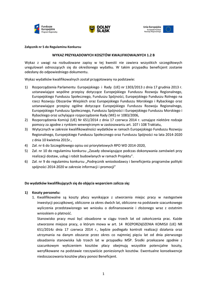 Załącznik nr 5 do Regulaminu Konkursu WYKAZ PRZYKŁADOWYCH KOSZTÓW KWALIFIKOWALNYCH 1.2 B Wykaz z uwagi na rozbudowane zapisy w tej kwestii nie zawiera wszystkich szczegółowych uregulowań odnoszących się do określonego wydatku. W takim przypadku beneficjent zostanie odesłany do odpowiedniego dokumentu. Wykaz wydatków kwalifikowalnych został przygotowany na podstawie: 1) 2) 3) 4) 5) 6) Rozporządzenia Parlamentu Europejskiego i Rady (UE) nr 1303/2013 z dnia 17 grudnia 2013 r. ustanawiające wspólne przepisy dotyczące Europejskiego Funduszu Rozwoju Regionalnego, Europejskiego Funduszu Społecznego, Funduszu Spójności, Europejskiego Funduszu Rolnego na rzecz Rozwoju Obszarów Wiejskich oraz Europejskiego Funduszu Morskiego i Rybackiego oraz ustanawiające przepisy ogólne dotyczące Europejskiego Funduszu Rozwoju Regionalnego, Europejskiego Funduszu Społecznego, Funduszu Spójności i Europejskiego Funduszu Morskiego i Rybackiego oraz uchylające rozporządzenie Rady (WE) nr 1083/2006, Rozporządzenia Komisji (UE) Nr 651/2014 z dnia 17 czerwca 2014 r. uznające niektóre rodzaje pomocy za zgodne z rynkiem wewnętrznym w zastosowaniu art. 107 i 108 Traktatu, Wytycznych w zakresie kwalifikowalności wydatków w ramach Europejskiego Funduszu Rozwoju Regionalnego, Europejskiego Funduszu Społecznego oraz Funduszu Spójności na lata 2014-2020 z dnia 10 kwietnia 2015r., Zał. nr 6 do Szczegółowego opisu osi priorytetowych RPO WD 2014-2020, Zał. nr 10 do regulaminu konkursu „Zasady obowiązujące podczas dokonywania zamówień przy realizacji dostaw, usług i robót budowlanych w ramach Projektu”. Zał. nr 9 do regulaminu konkursu „Podręcznik wnioskodawcy i beneficjenta programów polityki spójności 2014-2020 w zakresie informacji i promocji” Do wydatków kwalifikujących się do objęcia wsparciem zalicza się: 1) Koszty personelu: 1. Kwalifikowalne są koszty płacy wynikające z utworzenia miejsc pracy w następstwie inwestycji początkowej, obliczone za okres dwóch lat, obliczone na podstawie szacunkowego wyliczenia przedstawionego we wniosku o dofinansowanie i złożonego wraz z ostatnim wnioskiem o płatność. Stanowisko pracy musi być obsadzone w ciągu trzech lat od zakończenia prac. Każde utworzone miejsce pracy, o którym mowa w art. 14 ROZPORZĄDZENIA KOMISJI (UE) NR 651/2014z dnia 17 czerwca 2014 r., będzie podlegało kontroli realizacji działania oraz utrzymania na danym obszarze przez okres co najmniej pięciu lat od dnia pierwszego obsadzenia stanowiska lub trzech lat w przypadku MŚP. Środki przekazane zgodnie z szacunkowym wyliczeniem kosztów płacy obejmują wszystkie potencjalne koszty, weryfikowane na podstawie rzeczywiście poniesionych kosztów. Ewentualne konsekwencje niedoszacowania kosztów płacy ponosi Beneficjent. 1 2. Koszty osobowe związane z zarządzaniem projektu nie przekraczające 1% całkowitych wydatków kwalifikowalnych w ramach projektu (2% dla projektów o wartości poniżej 500 000 PLN wydatków kwalifikowalnych) i/lub nie przekraczające 5000 PLN brutto1miesięcznie bez względu na liczbę osób. W przypadku gdy zarządzanie projektem jest wykonywane przez podmiot wybrany zgodnie z zasadą konkurencyjności/ ustawą Prawo zamówień publicznych, wydatki dotyczące jego wynagrodzenia są kwalifikowalne w takiej wysokości, jaka wynika z podpisanej umowy. Dodatkowe wynagrodzenie roczne personelu projektu jest kwalifikowalne wyłącznie, jeżeli wynika z przepisów prawa pracy i odpowiada proporcji, w której wynagrodzenie zasadnicze będące podstawą jego naliczenia jest rozliczane w ramach projektu. Wydatki na wynagrodzenie personelu są kwalifikowalne pod warunkiem, że ich wysokość odpowiada stawkom faktycznie stosowanym u beneficjenta poza projektami współfinansowanymi z funduszy strukturalnych i FS na analogicznych stanowiskach lub na stanowiskach wymagających analogicznych kwalifikacji. Dotyczy to również pozostałych składników wynagrodzenia personelu, w tym nagród i premii. Przy pracownikach nowo zatrudnianych obowiązują stawki rynkowe. Dodatkowe wymogi związane z wynagrodzeniem osób związanych z zarządzaniem projektem Kwalifikowalne mogą być wydatki osobowe związane z wynagrodzeniem osób związanych z zarządzeniem projektem przy wykonywaniu ww. czynności w projekcie jeżeli łącznie spełnione zostaną m.in. następujące warunki: ww. osoba jest bezpośrednio zaangażowana w wykonywanie ww. czynności w ramach projektu; mogą być uwzględniane tylko te ww. osoby, które w co najmniej 25% czasu w danym okresie rozliczeniowym wykonują zadania kwalifikowalne w ramach projektu; wówczas, za kwalifikowalną może być uznana ta część wynagrodzenia, która odpowiada procentowemu bezpośredniemu zaangażowaniu ww. osoby w wykonywanie czynności w ramach projektu; wydatki ponoszone są wyłącznie w okresie realizacji projektu oraz za okres, w którym ww. osoba wykonywała faktycznie czynności związane w ramach projektu. 2) Koszty zakupu/ wynajmu aktywów trwałych oraz WNiP. 1. Kwalifikowalne są jedynie nowe środki trwałe, z wyjątkiem aktywów nabywanych przez MŚP i z wyjątkiem przejęcia zakładu2 2. Za kwalifikowalne uznaje się wydatki pod warunkiem ich bezpośredniego wskazania we wniosku o dofinansowanie wraz z uzasadnieniem dla konieczności ich zakupu. 3. Wydatki poniesione na zakup środków trwałych, a także koszty ich dostawy, montażu i uruchomienia, mogą być kwalifikowalne w całości lub części swojej wartości zgodnie ze wskazaniem beneficjenta opartym o faktyczne wykorzystanie środka trwałego na potrzeby projektu. 4. Wydatki związane z zakupem środków trwałych i wartości niematerialnych i prawnych kwalifikują się do współfinansowania pod warunkiem, że wartości te będą ujęte w ewidencji księgowej. 1 Kwalifikowalnymi składnikami wynagrodzenia personelu są w szczególności wynagrodzenie brutto, składki pracodawcy na ubezpieczenia społeczne,