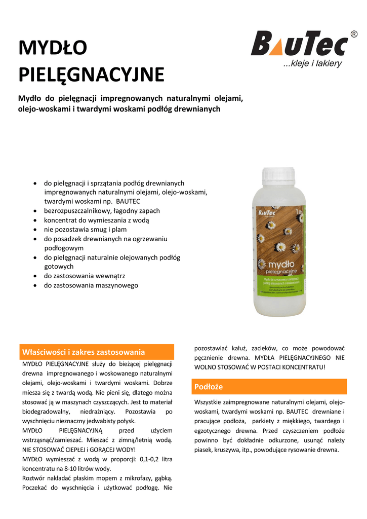 MYDŁO PIELĘGNACYJNE Mydło do pielęgnacji impregnowanych naturalnymi olejami, olejo-woskami i twardymi woskami podłóg drewnianych do pielęgnacji i sprzątania podłóg drewnianych impregnowanych naturalnymi olejami, olejo-woskami, twardymi woskami np. BAUTEC bezrozpuszczalnikowy, łagodny zapach koncentrat do wymieszania z wodą nie pozostawia smug i plam do posadzek drewnianych na ogrzewaniu podłogowym do pielęgnacji naturalnie olejowanych podłóg gotowych do zastosowania wewnątrz do zastosowania maszynowego Właściwości i zakres zastosowania MYDŁO PIELĘGNACYJNE służy do bieżącej pielęgnacji drewna impregnowanego i woskowanego naturalnymi olejami, olejo-woskami i twardymi woskami. Dobrze miesza się z twardą wodą. Nie pieni się, dlatego można stosować ją w maszynach czyszczących. Jest to materiał biodegradowalny, niedrażniący. Pozostawia po wyschnięciu nieznaczny jedwabisty połysk. MYDŁO PIELĘGNACYJNĄ przed użyciem wstrząsnąć/zamieszać. Mieszać z zimną/letnią wodą. NIE STOSOWAĆ CIEPŁEJ i GORĄCEJ WODY! MYDŁO wymieszać z wodą w proporcji: 0,1-0,2 litra koncentratu na 8-10 litrów wody. Roztwór nakładać płaskim mopem z mikrofazy, gąbką. Poczekać do wyschnięcia i użytkować podłogę. Nie pozostawiać kałuż, zacieków, co może powodować pęcznienie drewna. MYDŁA PIELĘGNACYJNEGO NIE WOLNO STOSOWAĆ W POSTACI KONCENTRATU! Podłoże Wszystkie zaimpregnowane naturalnymi olejami, olejowoskami, twardymi woskami np. BAUTEC drewniane i pracujące podłoża, parkiety z miękkiego, twardego i egzotycznego drewna. Przed czyszczeniem podłoże powinno być dokładnie odkurzone, usunąć należy piasek, kruszywa, itp., powodujące rysowanie drewna. Narzędzia Gąbka, nakładka z mikrofazy do SPRAY-MOPA i płaskiego mopa, moherowa łasica. Czyszczenie narzędzi Czysta woda. Czas schnięcia Chodzi o wartości przybliżone, zależne od temperatury pomieszczenia, temperatury podłoża, wilgotności podłoża i od wilgotności względnej powietrza. Niska temperatura, podwyższona wilgotność względna powietrza, złe wietrzenie wydłużają lub skracają czas schnięcia. Dane techniczne Skład: Woda, mydło potasowe z olejem rzepakowym ( poniżej 20 % ) etanol , gliceryna Kolor: miodowy Konsystencja: płynna Usuwanie: Nie wylewać do kanalizacji, płynne resztki zabezpieczyć i utylizować. Temperatura stosowania: od +10°C do +27°C Bezpieczeństwo i ochrona Podczas pracy używać gumowych rękawic. Po zakończeniu prac przewietrzyć pomieszczenie. Resztek produktu w opakowaniu nie wyrzucać tylko odpowiednio i bezpiecznie utylizować. P101 – W razie konieczności zasięgnięcia porady lekarza należy pokazać pojemnik lub etykietę. P102 – Chronić przed dziećmi. P103 – Przed użyciem przeczytać etykietę. P301 + P310 – W PRZYPADKU POŁKNIĘCIA: Natychmiast skontaktować się z OŚRODKIEM ZATRUĆ lub z lekarzem. Ważne wskazówki Powyższe dane, przygotowanie i zastosowanie produktu oparto na naszej wiedzy i doświadczeniu. Niższe temperatury wydłużają czasy zastosowań, a wyższe skracają. Z powodu różnych niezależnych od nas czynników np. nietypowe podłoża, warunki zewnętrzne, jakość pracy, zalecamy przeprowadzenie własnych prób, aby stwierdzić, czy nasz produkt nadaje się do danego postępowania. Firma Bautec Polska nie ponosi odpowiedzialności z tego powodu. Przed użyciem należy zapoznać się z instrukcją techniczną i kartą charakterystyki produktu. Prace należy wykonywać zgodnie z zasadami BHP. Aktualizacja 10.01.2016 Zużycie przy jednokrotnym ok. 1 - 4ml/m2 sprzątaniu, koncentrat Czas schnięcia roztworu: Nie dotyczy Stosowanie Zawsze mieszać z wodą, 0,1-0,2 litra z 8-10 litra wody Składowanie temp. powyżej +5°C Magazynowanie 12 miesiące w suchych i chłodnych pomieszczeniach, w szczelnym opakowaniu. Chronić przed mrozem! BAUTEC POLSKA SP. Z O.O. UL. TURNIEJOWA 8, 53-014 WROCŁAW TEL./FAX 71 796 26 02, +48 722-142-403 www.bautec.pl * [email protected]