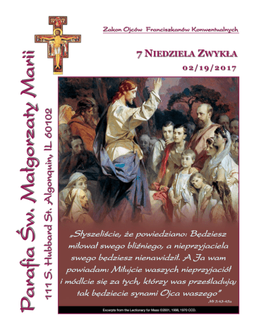 7 NIEDZIELA ZWYKŁA 02/19/2017 111 S. Hubbard St. Algonquin, lL 60102 Parafia Św. Małgorzaty Marii Zakon Ojców Franciszkanów Konwentualnych „Słyszeliście, że powiedziano: Będziesz miłował swego bliźniego, a nieprzyjaciela swego będziesz nienawidził. A Ja wam powiadam: Miłujcie waszych nieprzyjaciół i módlcie się za tych, którzy was prześladują; tak będziecie synami Ojca waszego” Mt 5:43-45a O D P ROBOSZCZA „A JA WAM POWIADAM: MIŁUJCIE WASZYCH NIEPRZYJACIÓŁ I MÓDLCIE SIĘ ZA TYCH, KTÓRZY WAS PRZEŚLADUJĄ; TAK BĘDZIECIE SYNAMI OJCA WASZEGO, KTÓRY JEST W NIEBIE.” Drodzy Przyjaciele! W książce zatytułowanej: „Dar dawania” Stephen Olford opowiada historię protestanckiego pastora podczas Amerykańskiej Rewolucji, Petera Millera, który mieszkał w Ephrata w Pensylwenii i był dobrym przyjacielem Georgea Washingtona. W tej samej miejscowości, żył także niejaki Michael Wittman, który był bardzo niedobrym i złośliwym człowiekiem oraz często upokarzał pastora i robił mu na złość. Pewnego dnia Michael Wittman został zaaresztowany za zdradę i skazany na karę śmierci. Pastor Peter Miller szedł 70 mil pieszo do Philadelphi, aby się za niego wstawić i prosił o ułaskawienie zdrajcy. „Nie, Peter,” Powiedział Generał Washington. „Nie mogę ułaskawić twojego przyjaciela.” „Przyjaciela!” wykrzyknął pastor. „On jest moim największym nieprzyjacielem ze wszystkich jakich mam.” „Co?” wykrzyknął Washington. „Przebyłeś pieszo 70 mil, aby uratować życie swojemu wrogowi? W takim razie twój czyn rzuca na tą sprawę zupełnie nowe światło. Ułaskawiam go.” I rzeczywiście Michael Wittman został zwolniony z więzienia, a jego życie było uratowane. Pastor Miller wziął go ze sobą w powrotną drogę do domu w Ephrata. Tym razem wracali już jako przyjaciele. Słowa Ewangelii wg św. Mateusza 5, 38-48 Jezus powiedział do swoich uczniów: «Słyszeliście, że powiedziano: „Oko za oko i ząb za ząb”. A Ja wam powiadam: Nie stawiajcie oporu złemu: lecz jeśli cię ktoś uderzy w prawy policzek, nadstaw mu i drugi. Temu, kto chce prawować się z tobą i wziąć twoją szatę, odstąp i płaszcz. Zmusza cię ktoś, żeby iść z nim tysiąc kroków, idź dwa tysiące. Daj temu, kto cię prosi, i nie odwracaj się od tego, kto chce pożyczyć od ciebie. Słyszeliście, że powiedziano: „Będziesz miłował swego bliźniego”, a nieprzyjaciela swego będziesz nienawidził. A Ja wam powiadam: Miłujcie waszych nieprzyjaciół i módlcie się za tych, którzy was prześladują, abyście się stali synami Ojca waszego, który jest w niebie; ponieważ On Myślę, że pastor Peter Miller modlił się każdego dnia za sprawia, że słońce Jego wschodzi nad złymi swojego nieprzyjaciela i ta modlitwa dała mu siłę, aby i nad dobrymi, i On zsyła deszcz na wstawić się za nim, gdy ten był o krok od wykonania na nim sprawiedliwych i niesprawiedliwych. kary śmierci. To jest właśnie prawdziwe powołanie chrześcijańskie, miłować naszych nieprzyjaciół. Chrystus dał Jeśli bowiem miłujecie tych, którzy was miłują, nam tego przykład na krzyżu, kiedy modlił się za swoich cóż za nagrodę mieć będziecie? Czyż i celnicy tego nie czynią? I jeśli pozdrawiacie tylko prześladowców i morderców. swych braci, cóż szczególnego czynicie? Czyż Czy jesteśmy w stanie kochać taką miłością, tak sami i poganie tego nie czynią? z siebie? Oczywiście nie. Nie możemy tego osiągnąć bez pomocy Jezusa. Tylko On kocha bezwarunkowo każdego Bądźcie więc wy doskonali, jak doskonały jest człowieka. Modląc się za naszych nieprzyjaciół, pozwalamy Ojciec wasz niebieski». Chrystusowi kochać ich przez nas. Co jest więc naszą lekcją z dzisiejszej Ewangelii? Jeśli modlimy się za nasze dzieci, współmałżonka, przyjaciół, krewnych i tych, którym jesteśmy winni naszą wdzięczność - robimy słusznie i szlachetnie. Ale to nie wystarcza, aby być autentycznym naśladowcą Chrystusa. Dlatego zadbajmy o to, aby na liście osób, za które się modlimy, znaleźli się również nasi nieprzyjaciele. Prośmy Boga o łaski i błogosławieństwo dla nich. Jeśli trwają w złym, prośmy dla nich o łaskę opamiętania, nawrócenia i przejrzenia. Codzienna modlitwa za nieprzyjaciół zmienia również serca modlących się i sprawia, że wrogowie stają się przyjaciółmi. Pokój i Dobro Fr. Piotr Sarnicki, OFM, Conv. CZYTANIE Z KSIĘGI KAPŁAŃSKIEJ O G Ł O S Z E N I A KPŁ 19, 1-2. 17-18 W poniedziałek 20-go Pan powiedział do Mojżesza: «Przemów do całej społeczności Izraelitów i powiedz im: Bądźcie świętymi, bo Ja jestem święty, Pan, Bóg wasz! lutego zapraszamy na Mszę św. o 7 wieczorem I nabożeństwo eucharystyczne. Nie będziesz żywił w sercu nienawiści do brata. Będziesz upominał bliźniego, aby nie ponieść winy z jego powodu. Nie będziesz szukał pomsty, nie będziesz żywił urazy do synów twego ludu, ale będziesz miłował bliźniego jak siebie samego. Ja jestem Pan!» CZYTANIE Z PIERWSZEGO LISTU ŚWIĘTEGO PAWŁA APOSTOŁA DO KORYNTIAN 1 KOR 3, 16-23 Bracia: Czyż nie wiecie, że jesteście świątynią Boga i że Duch Boży mieszka w was? Jeżeli ktoś zniszczy świątynię Boga, tego zniszczy Bóg. Świątynia Boga jest święta, a wy nią jesteście. Niechaj się nikt nie łudzi. Jeśli ktoś spośród was mniema, że jest mądry na tym świecie, niech się stanie głupim, by posiadł mądrość. Mądrość bowiem tego świata jest głupstwem u Boga. Zresztą jest napisane: «On udaremnia zamysły przebiegłych» lub także: «Wie Pan, że próżne są zamysły mędrców». Niech się przeto nie chełpi nikt z powodu ludzi! Wszystko bowiem jest wasze: czy to Paweł, czy Apollos, czy Kefas; czy to świat, czy życie, czy śmierć, czy to rzeczy teraźniejsze, czy przyszłe, wszystko jest wasze, wy zaś Chrystusa, a Chrystus – Boga. Nasza Polska Szko