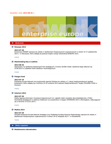 Newsletter z dnia: 2013-08-29 | Wydarzenia Renexpo 2013 2013-07-30 Konsorcjum BISNEP zaprasza do udziału w Spotkaniach Kooperacyjnych organizowanych w dniach 16-17 października 2013 r. w Warszawie, które odbędą się podczas targów energii odnawialnej RENEXPO 2013. więcej Matchmaking Day w Lublinie 2013-08-26 Zapraszamy na spotkania kooperacyjne firm działających w branży obróbki metali. Spotkania będą odbywać się 23.09.2013 w Lubelskim Parku Naukowo Technologicznym. więcej Polagra Food 2013-07-19 Enterprise Europe Network ma przyjemność zaprosić Państwa do udziału w 3. edycji międzynarodowych spotkań brokerskich, które odbędą się w terminie 24-25 września 2013 podczas Międzynarodowych Targów POLAGRA FOOD w Poznaniu więcej Interiors 2014 2013-07-30 Polska Agencja Informacji i Inwestycji Zagranicznych S.A. ogłosiła nabór wniosków dla przedsiębiorców z Polski Wschodniej działających w sektorze meblowym na uczestnictwo w targach INTERIORS 2014 w Birmingham, odbywających się w terminie 19-22.01.2014 r. więcej Medica 2013 2013-07-30 Ośrodek Enterprise Europe Network działający przy Podlaskiej Fundacji Rozwoju Regionalnego zaprasza do udziału w Spotkaniach Kooperacyjnych organizowanych w dniach 20-22 listopada 2013 r. w Dusseldorfie. więcej Oferty i zapytania Modelowanie mikrostruktur 06 LU TSLU 0FCV Firma inżynierska z Luksemburga opracowała oprogramowanie do modelwoania rozwiązań mikromechanicznych. Proponowane oprogramowanie skierowane jest do przedsiebiorstw z branży chemicznej, samochodowej i lotniczej.Firma chce zbudować relacje handlowe op więcej Platforma internetowa 08 LU 70DB 0IQM Innowacyjne MŚP z Luksemburga specjalizuje się w tworzeniu stron internetowych(projektowanie, aplikacje dla stron internetowych). Firma opracowała oprogramowanie dla organizacji do tworzenia i dystybuowania informacji. Oprogramowanie może być stotsowa więcej Nagrywanie 3D 07 LU TSLU 0HYZ Firma z siedzibą w Luksemburgu opracowała nowy aparat z czujnikiem, który jest w stanie dostarczyć informacje o odległości od każdego piksela obrazu. Aparat może służyć nie tylko do badania średniej odległości obiektów, ale również do abda więcej Obrazowanie techniką wysokiej rozdzielczości 08 LU 70DB 0IQL Centrum badawcze z siedzibą w Luksemburgu oferuje możliwość dostępu do techniki obrazowania do badań złożonych zjawisk w tkankach roślin i zwierząt. Technika posiada przewagę nad konwencjonalnymi technikami obrazowania poprzez możliwość nagry więcej Platforma in vitro 11 LU 70DB 3LZN Firma luksemburski jest pionierem w rozwoju nowej klasy związków o zdolności do indukowania różnicowania komórek nerwowych macierzystych w neurony posiadające przeciwzapalne neuroprotekcyjne działania. Te pro-regeneracyjne związki są rozwijane j więcej Drukowanie na powierzchni plastikowej 10 DK 20B7 3GGL Duży duński producent i projektant zabawek poszukuje nowych możliwości technologii drukowania obrazów na powierzchniach plastikowych. Firma jest zainteresowana wspłpracą i szuka pomocy technicznej. więcej Powlekanie powierzchni porowatych 10 DK 20B2 3GVS Duńska firma prowadzi badania w dziedzinie nanotechnologii, które mogą być używane do obróbki powierzchni porowatych produktów szuka partnerów, którzy przyłączą się do dalszego rozwoju tego wynalazku i jego zastosowania w innych materiałach n więcej Telemedycyna - badania 10 DK 202G 3J6J Duński MŚP prowadzący intensywną działalność badawczą w dziedzinie wyrobów medycznych w regionie Kopenhagi poszukuje partnerów z doświadczeniem w zakresie telemedycyny dla rozwoju i dostaw części sprzętu medycznego dla projektu europejskiego więcej E-mobility 20110616021 Duńska firma specjalizująca się w rozwoju i testowaniu nowych możliwości technologicznych w obrębie e-mobility oferuje do testowania EV (Electric Vehicles) i produktów z tym związanych ułatwiających pracę w laboratorium. Firma poszukuje partner więcej Produkcja elementów mechanicznych 20110615042 Firma w Luksemburgu, specjalizuje się w produkcji elementów mechanicznych o dużej dokładności, przebudowie silników gazowych i diesla, obróbce cieplnej, azotowaniu jonowym, frezowanie kół zębatych - metodą elektroiskrową, silników spalinowych, więcej Integracja aplikacji biznesowych 20110615037 Firma w Luksemburgu, specjalizuje się w obszarze integracji aplikacji biznesowych, poszukuje dystrybutorów dla swoich produktów. więcej Dystrybucja aparatury medycznej 20110601036 Firmy w Luksemburgu, specjalizuje się w dystrybucji aparatury do modelowania ciała, poszukuje dystrybutorów i agentów pośredniczących działających w sektorze medycznym. więcej