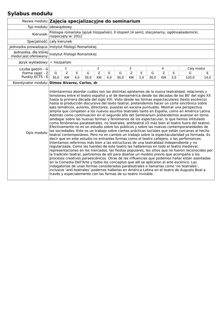 Sylabus modułu Nazwa modułu: Zajęcia specjalizacyjne do seminarium Typ modułu: obowiązkowy Kierunek: Filologia romańska (język hiszpański), II stopień [4 sem], stacjonarny, ogólnoakademicki, rozpoczęty w: 2012 Specjalność: cały kierunek Jednostka prowadząca: Instytut Filologii Romańskiej Jednostka, dla której Instytut Filologii Romańskiej moduł jest oferowany: Język wykładowy: • hiszpański Liczba godzin - G Forma zajęć - Z Punkty ECTS - E G 30,0 1 Z KW E 4,0 G 30,0 2 Z KW E 4,0 G 30,0 3 Z KW E 3,0 G 30,0 4 Z KW E 3,0 Cały moduł G E 120,0 14,0 Koordynator modułu: Dimeo Alvarez, Carlos, dr Intentaremos abordar cuáles son las distintas epistemes de la nueva teatralidad, relaciones y tensiones entre el teatro español y el de iberoamérica desde las décadas de los 80’ del siglo XX hasta la primera década del siglo XXI. Visto desde las formas espectaculares (texto escénico) hasta la producción discursiva del texto teatral, pretendemos hacer un corte sincrónico sobre ejes temáticos, autores, directores, puestas en escena puntuales. Mostrar una perspectiva amplia que competen a los nuevos asuntos teatrales tanto en España, como en América Latina. Además como continuación en el segundo año del Seminarium pretendemos avanzar en torno aindagar sobre las nuevas formas y fenómenos de los espectacular, lo que hemos intitulado como fenómenos parateatrales, no teatrales, antiteatral (O más bien el teatro fuera del teatro). Efectivamente no es un estudio sobre los públicos y sobre las nuevas contemporaneidades de las sociedades. Este es un trabajo sobre ciertas prácticas sociales que están cercanas al hecho Opis modułu: teatral contemporáneo. Pero no en cambio un trabajo sobre la espectacularidad ya formada. Es decir que en este estudio no entranlas formas como el teatro callejero, o las perfomances. Intentamos referirnos más bien a las estructuras de una teatralidad independiente y no regularizada. Como las fuentes de este teatro las hallaremos en todo el teatro medieval, representaciones en los mercados, las fiestas populares, los sitios que no fueron reconocidos por la tradición teatral, partiremos de allí para diseñar un modelo previo que acompañe a los procesos creativos paraescénicos. Otras de las influencias que podemos hallar están asentadas en la Comedia Dell'Arte y todos los conceptos que allí se aplicaron al arte escénico. Las indagatorias de unas formas consideradas parateatrales o llamarlas como ‘no teatrales’, inclusive ‘anti-teatrales’ podemos hallarlas en América Latina en el teatro de Augusto Boal a través y especialemente con las formas de su teatro invisible. Breve literatura que se trabajará en Zajęcia Specjalizacyjne do Seminarium Arrabal, F.,Taylor, D. (1984).El cementerio de automóviles; El arquitecto y el emperador de Asiria . Madrid: Cátedra. Arrabal, F.,Taylor, D. (2007).El cementerio de automóviles. El Arquitecto y el Emperador de Asiria (6 ed.). Madrid;: Cátedra. Bartis, R.,Dubatti, J. A. (2003).Cancha con niebla: teatro perdido, fragmentos(1* ed ed.). Buenos Aires: Atuel. Cañizares Bundorf, N., Abellan, J., Pascual Bonis, M. T., Fernández Torres, A., Cracio, J.,Pavis, P. (1995).Análisis de la puesta en escena. Madrid: Asociación de Directores de Escena. Carlson, M. (1993).Deathtraps the portmodern comedy thriller. Bloomington: Indiana University Press. Carlson, M.,Bettendorf, P. (2009).El teatro como máquina de la memoria: los fantasmas de la escena. [Buenos Aires]: Ediciones Artes del Sur. Cura, M., Dubatti, J., Daulte, J.,Ramos, M. (1994). Así se mira el teatro hoy: selección de obras. Buenos Aires: Beas Ediciones. Dodatkowe informacje: Dubatti, J.,Alifano, R. (1999).Acerca de Borges: ensayos de poética, política y literatura comparada. Capital Federal [i.e. Buenos Aires]: Editorial de Belgrano. Dubatti, J. A. (1995).Batato Barea y el nuevo teatro argentino. Buenos Aires: Temas de Hoy. Pavis, P. (2003).Analyzing performance: theater, dance, and film. Ann Arbor: University of Michigan Press. Pavis, P.,Pascual, M. (2003).¿De dónde viene la puesta en escena y hacia dónde va? Pamplona: Escuela Navarra de Teatro. Pavis, P., Shantz, C.,Carlson, M. (1998).Dictionary of the theatre: terms, concepts and analysis . Toronto; Buffalo: University of Toronto Press. Sanchís Sinisterra, J., Pavis, P., Amo Sánchez, A.,Instituto Cervantes De Toulouse. (2003). Conspiración carmín = Conspiración vermeille; Sangre lunar = Sang de lune . Toulouse: Instituto Cervantes. Taylor, D. (1997).Disappearing acts : spectacles of gender and nationalism in Argentina's Dirty War. Durham ; London: Duke University Press. Ubersfeld, A.,Pavis, P. (1900).Confluences: le dialogue des cultures dans les spectacles contemporains: essais en l'honneur d'Anne Ubersfeld . Saint Cyr: Bois Robert. 01 ma pogłębioną i rozszerzoną wiedzę o specyfice przedmiotowej i metodologicznej w zakresie literatury hiszpańskiej i hispanoamerykańskiej oraz jest przygotowany do zastosowania tej wiedzy w przyszłej działalności profesjonalnej 02 zna na poziomie rozszerzonym pojęcia z dziedziny literaturoznawstwa 03 ma uporządkowaną i pogłębioną wiedzę z zakresu terminologii i metodologii badań literaturoznawczych 04 ma uporządkowaną, pogłębioną i rozszerzoną wiedzę z zakresu literatury hiszpańskiej i hispanoamerykańskiej 05 ma pogłębioną wiedzę o powiązaniach literaturoznawstwa z innymi dziedzinami nauk humanistycznych 06 zna współczesne szkoły badawcze i dokonania naukowe z zakresu literaturoznawstwa 07 zna i rozumie zaawansowane metody analizy i interpretacji różnych wytworów kultury właściwe dla tradycji, teorii i szkół badawczych w literaturoznawstwa 08 zna i rozumie podstawowe pojęcia i zasady z zakresu ochrony własności intelektualnej i prawa autorskiego 09 potrafi dokonać właściwej selekcji i analizy informacji pochodzących z różnych źródeł, oraz ocenić ich przydatność dla studiowanych j