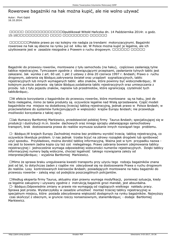 Polskie Towarzystwo Inżynierów Motoryzacji SIMP Rowerowe bagażniki na hak można kupić, ale nie wolno używać Autor: Piort Gębiś 16.10.2014. Opublikował Witold Hańczka dn. 14 Października 2014r. o godz. 15:10 Polskie prawo po raz kolejny nie nadąża za trendami motoryzacyjnymi. Bagażniki rowerowe na hak są obecne na rynku już od kilku lat. W Polsce można kupić je legalnie, ale ich użytkowanie jest w zasadzie niezgodne z Prawem o ruchu drogowym. Bagażniki do przewozu rowerów, montowane z tyłu samochodu (na haku), częściowo zasłaniają tylne tablice rejestracyjne. Tymczasem zgodnie z obowiązującymi przepisami, zasłanianie tylnych tablic jest zakazane. Jak wynika z art. 60 ust. 1 pkt 2 ustawy z dnia 20 czerwca 1997 r. – Prawo o ruchu drogowym, zabrania się „zakrywania świateł oraz urządzeń sygnalizacyjnych, tablic rejestracyjnych lub innych wymaganych tablic albo znaków, które powinny być widoczne”. W kolejnym punkcie zabrania się także „ozdabiania tablic rejestracyjnych oraz umieszczania z przodu lub z tyłu pojazdu znaków, napisów lub przedmiotów, które ograniczają czytelność tych tablic”. W efekcie korzystanie z bagażników do przewozu rowerów, które montowane są na haku, jest de facto nielegalne, mimo że takie produkty są oczywiście legalnie nad Wisłą sprzedawane. Część modeli bagażników ma miejsce na dodatkową (trzecią) tablicę rejestracyjną, jednak prawo w Polsce – w przeciwieństwie do systemów funkcjonujących w większości krajów Europy – nie przewiduje możliwości korzystania z takiej opcji. Jak tłumaczy Bartłomiej Markiewicz, przedstawiciel polskiej firmy Taurus – specjalizującej się w produkcji i dystrybucji m.in. boxów dachowych oraz innego sprzętu ułatwiającego samochodowy transport, brak dostosowania prawa do realiów wymusza szukanie innych rozwiązań tego problemu. - „W krajach Europy Zachodniej można bez problemu wyrobić trzecią tablicę rejestracyjną, co oczywiście likwiduje problem. U nas jednak trzeba liczyć na zdrowy rozsądek drogówki lub spróbować użyć sposobu. Przykładowo, można dorobić tablicę informacyjną. Ważna jest w tym przypadku nazwa nie jest to bowiem żadna kopia czy też coś nielegalnego. Prawo zabrania bowiem zdejmowania tablicy rejestracyjnej i jednocześnie wymaga odpowiedniej widoczności numerów rejestracyjnych. Dzięki tablicy informacyjnej numery będą widoczne, chociaż legalność takiego rozwiązania zależy od interpretacji” - wyjaśnia Bartłomiej Markiewicz. Mimo że sprawa braku uregulowania kwestii transportu przy użyciu tego rodzaju bagażników znana jest od lat, to dotychczas żaden z rządów nie zdecydował się na dostosowanie Prawa o ruchu drogowym do realiów. Losy kontrolowanych kierowców – posiadających montowane na haku bagażniki do przewozu rowerów - zależą więc od podejścia poszczególnych policjantów. Według eksperta firmy Taurus, aktualny stan prawny wymaga modyfikacji, ponieważ sytuacja, kiedy za legalnie zakupiony i używany zgodnie z instrukcją bagażnik grozi mandat, jest absurdalna. - „Odpowiednie zmiany w prawie nie wymagają od rządzących wielkiego nakładu pracy. Sprawa jest prosta. Wystarczyłoby w zasadzie umożliwić montaż trzeciej tablicy rejestracyjnej w specjalnym miejscu, które posiada zdecydowana większość dostępnych na rynku bagażników. Najwyższy czas skończyć z obecnym, w gruncie rzeczy nonsensownym, stanem” - dodaje Bartłomiej Markiewicz. http://ptim.simp.pl/ptim Kreator PDF Utworzono 3-03-2017, 19:36