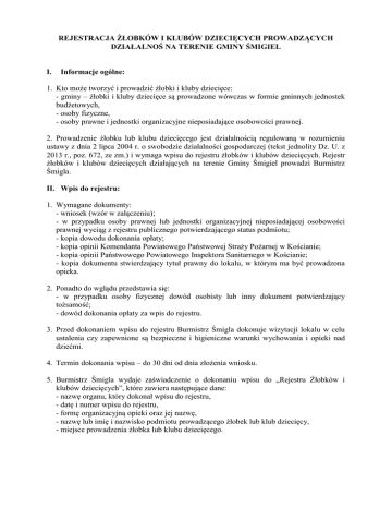 REJESTRACJA ŻŁOBKÓW I KLUBÓW DZIECIĘCYCH PROWADZĄCYCH DZIAŁALNOŚ NA TERENIE GMINY ŚMIGIEL I. Informacje ogólne: 1. Kto może tworzyć i prowadzić żłobki i kluby dziecięce: - gminy – żłobki i kluby dziecięce są prowadzone wówczas w formie gminnych jednostek budżetowych, - osoby fizyczne, - osoby prawne i jednostki organizacyjne nieposiadające osobowości prawnej. 2. Prowadzenie żłobku lub klubu dziecięcego jest działalnością regulowaną w rozumieniu ustawy z dnia 2 lipca 2004 r. o swobodzie działalności gospodarczej (tekst jednolity Dz. U. z 2013 r., poz. 672, ze zm.) i wymaga wpisu do rejestru żłobków i klubów dziecięcych. Rejestr żłobków i klubów dziecięcych działających na terenie Gminy Śmigiel prowadzi Burmistrz Śmigla. II. Wpis do rejestru: 1. Wymagane dokumenty: - wniosek (wzór w załączeniu); - w przypadku osoby prawnej lub jednostki organizacyjnej nieposiadającej osobowości prawnej wyciąg z rejestru publicznego potwierdzającego status podmiotu; - kopia dowodu dokonania opłaty; - kopia opinii Komendanta Powiatowego Państwowej Straży Pożarnej w Kościanie; - kopia opinii Państwowego Powiatowego Inspektora Sanitarnego w Kościanie; - kopia dokumentu stwierdzający tytuł prawny do lokalu, w którym ma być prowadzona opieka. 2. Ponadto do wglądu przedstawia się: - w przypadku osoby fizycznej dowód osobisty lub inny dokument potwierdzający tożsamość; - dowód dokonania opłaty za wpis do rejestru. 3. Przed dokonaniem wpisu do rejestru Burmistrz Śmigla dokonuje wizytacji lokalu w celu ustalenia czy zapewnione są bezpieczne i higieniczne warunki wychowania i opieki nad dziećmi. 4. Termin dokonania wpisu – do 30 dni od dnia złożenia wniosku. 5. Burmistrz Śmigla wydaje zaświadczenie o dokonaniu wpisu do „Rejestru Żłobków i klubów dziecięcych”, które zawiera następujące dane: - nazwę organu, który dokonał wpisu do rejestru, - datę i numer wpisu do rejestru, - formę organizacyjną opieki oraz jej nazwę, - nazwę lub imię i nazwisko podmiotu prowadzącego żłobek lub klub dziecięcy, - miejsce prowadzenia żłobka lub klubu dziecięcego. III. Odmowa wpisu do rejestru: Burmistrz Śmigla odmawia wpisu do „Rejestru żłobków i klubów dziecięcych” w przypadku, gdy: - podmiot nie spełnia warunków wymaganych do utworzenia i prowadzenia żłobka lub klubu dziecięcego; - wydano prawomocne orzeczenie zakazujące przedsiębiorcy wykonywania działalności gospodarczej objętej wpisem. IV. Wykreślenie z rejestru: Wykreślenie z „Rejestru żłobków i klubów dziecięcych” następuje w przypadku: - złożenia przez podmiot wpisany do rejestru wniosku o wykreślenie (wniosek w załączeniu); - nieusunięcia przez podmiot, w wyznaczonym terminie , nieprawidłowości w zakresie prowadzenia żłobka lub klubu dziecięcego; - przekazanie we wniosku oraz dołączonym do niego dokumentach informacji niezgodnych ze stanem faktycznym. V. Zmiana danych wskazanych we wniosku: Podmiot wpisany do rejestru jest zobowiązany do informowania organu prowadzącego rejestr o wszelkich zmianach danych wskazanych we wniosku lub dołączonych do wniosku dokumentach w terminie 14 dni od zaistnienia zmian. Po otrzymaniu informacji o zmianach Burmistrz Śmigla dokonuje zmian w rejestrze oraz wydaje podmiotowi wpisanemu do rejestru stosowne zaświadczenie, uwzględniające te zmiany. VI. Opłaty: Wpis do rejestru podlega opłacie, która stanowi dochód własny Gminy Śmigiel. Wysokość opłaty wynosi 50% minimalnego wynagrodzenia za pracę ustalonego zgodnie z przepisami o minimalnym wynagrodzeniu za pracę. Zmiana w rejestrze oraz wykreślenie z rejestru są zwolnione z opłaty.