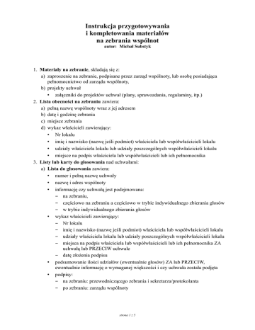 Instrukcja przygotowywania i kompletowania materiałów na zebrania wspólnot autor: Michał Substyk 1. Materiały na zebranie, składają się z: a) zaproszenie na zebranie, podpisane przez zarząd wspólnoty, lub osobę posiadająca pełnomocnictwo od zarządu wspólnoty, b) projekty uchwał • załączniki do projektów uchwał (plany, sprawozdania, regulaminy, itp.) 2. Lista obecności na zebraniu zawiera: a) pełną nazwę wspólnoty wraz z jej adresem b) datę i godzinę zebrania c) miejsce zebrania d) wykaz właścicieli zawierający: • Nr lokalu • imię i nazwisko (nazwę jeśli podmiot) właściciela lub współwłaścicieli lokalu • udziały właściciela lokalu lub udziały poszczególnych współwłaścicieli lokalu • miejsce na podpis właściciela lub współwłaścicieli lub ich pełnomocnika 3. Listy lub karty do głosowania nad uchwałami: a) Lista do głosowania zawiera: • numer i pełną nazwę uchwały • nazwę i adres wspólnoty • informację czy uchwałą jest podejmowana: − na zebraniu, − częściowo na zebraniu a częściowo w trybie indywidualnego zbierania głosów − w trybie indywidualnego zbierania głosów • wykaz właścicieli zawierający: − Nr lokalu − imię i nazwisko (nazwę jeśli podmiot) właściciela lub współwłaścicieli lokalu − udziały właściciela lokalu lub udziały poszczególnych współwłaścicieli lokalu − miejsca na podpis właściciela lub współwłaścicieli lub ich pełnomocnika ZA uchwałą lub PRZECIW uchwale − datę złożenia podpisu • podsumowanie ilości udziałów (ewentualnie głosów) ZA lub PRZECIW, ewentualnie informację o wymaganej większości i czy uchwała została podjęta • podpisy: − na zebraniu: przewodniczącego zebrania i sekretarza/protokolanta − po zebraniu: zarządu wspólnoty strona 1 z 5 Przykład listy do głosowania: UCHWAŁA Nr …........................ właścicieli lokali w nieruchomości …............................... w …......................... z dnia …..............................r. w sprawie …................................................ Treść uchwały: …............................................................................................................................................................ ................................................................................................................................................................ Głosowanie nad uchwałą: Nr lokalu Właściciel Udział Za uchwałą Przeciw uchwale Data Razem: Wynik głosowania: Za udziały Przeciw 1 właściciel=1 głos udziały 1 właściciel=1 głos RAZEM Wymagana większość Przewodniczący zebrania Sekretarz/protokolant zebrania ….................................. .............................................. Zarząd wspólnoty (opcjonalnie) …................................... b) Karta do głosowania zawiera: • nazwę i adres wspólnoty • informację czy uchwałą jest podejmowana: − na zebraniu, − częściowo na zebraniu a częściowo w trybie indywidualnego zbierania głosów − w trybie indywidualnego zbierania głosów • informacje o właścicielu lokalu: − Nr lokalu − imię i nazwisko (nazwę jeśli podmiot) właściciela lub współwłaściciela lokalu − udziały właściciela lokalu lub udziały poszczególnych współwłaścicieli lokalu • wykaz uchwał nad którymi jest głosowanie, zawierający numery i pełne nazwy uchwały • miejsca na podpis właściciela lub współwłaścicieli lub ich pełnomocnika ZA uchwałą lub PRZECIW uchwale • datę złożenia podpisu strona 2 z 5 Przykład karty do głosownia Karta do głosowania Na zebraniu wspólnoty mieszkaniowej ….................................... w ….............................. przy ul. …............................................... głosowanie nad uchwałami podejmowanymi na zebraniu w dniu ............... KARTA DO GŁOSOWANIA – głosuj przez złożenie podpisów w tabelce. nr lokalu nazwisko i imię głosującego ................................................................ liczba udziałów …..................................... l temat uchwały p 1 w sprawie przyjęcia sprawozdania zarządu i udzielenia mu absolutorium głos za głos przeciw data 2 w sprawie przyjęcia planu gospodarczego 3 w sprawie .................................... ....................................................... 4. Protokół komisji skrutacyjnej, zawierający: a) pełną nazwę wspólnoty wraz z jej adresem b) datę i godzinę zebrania c) miejsce zebrania d) imiona i nazwiska członków komisji skrutacyjnej e) informacje o głosowaniu nad uchwałami, zawierającą: • treści uchwał • podsumowanie dla każdej uchwały ilości udziałów (ewentualnie głosów) ZA lub PRZECIW, ewentualnie informację o wymaganej większości i czy uchwała została podjęta b) podpisy członków komisji skrutacyjnej 5. Protokół komisji wnioskowej, zawierający: a) pełną nazwę wspólnoty wraz z jej adresem b) datę i godzinę zebrania c) miejsce zebrania d) imiona i nazwiska członków komisji wnioskowej e) wykaz zgłaszanych wniosków f) podpisy członków komisji wnioskowej 6. Protokół z zebrania, zawierający informacje o: a) wspólnocie, a w tym pełną nazwę wspólnoty wraz z jej adresem b) dacie i godzinie zebrania c) miejscu zebrania d) otwarciu zebrania, a w tym: • kto je otworzył (powinien zarząd lub zarządca), strona 3 z 5 prawidłowości jego zwołania, liczbie obecnych, łącznej ilości udziałów posiadanych przez obecnych, czy zebranie jest władne podejmować wiążące uchwały, czy głosy pod uchwałami będą zbierane w mieszanym trybie, e) wyborze przewodniczącego zebrania (kogo wybrano, w jakim trybie – głosowanie przez obecnych, mandatami, udziałami, przez aklamację), f) wyborze sekretarza/protokolanta (kogo wybrano, w jakim trybie – głosowanie przez obecnych, mandatami, udziałami, przez aklamację), g) w