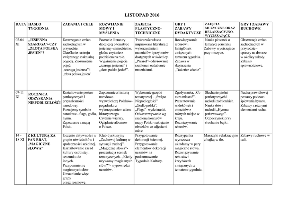 LISTOPAD 2016 DATA HASŁO TYGODNIA ZADANIA I CELE ROZWIJANIE MOWY I MYŚLENIA ZAJĘCIA PLASTYCZNOTECHNICZNE GRY I ZABAWY DYDAKTYCZE ZAJĘCIA MUZYCZNE ORAZ RELAKSACYJNOWYCISZAJĄCE GRY I ZABAWY RUCHOWE Dostrzeganie zmian zachodzących w przyrodzie. Określanie nastroju związanego z aktualną pogodą. Zrozumienie pojęć: „szaruga jesienna” i „złota polska jesień” Poznanie literatury dziecięcej o tematyce jesiennej- samodzielne, głośne czytanie z podziałem na role. Wyjaśnienie pojęcia „szaruga jesienna” i „złota polska jesień”. Twórczość własna inspirowana literaturą z wykorzystaniem materiałów i przyborów dostępnych w świetlicy. „Parasol”- odrysowanie szablonu i ozdabianie materiałami. Rozwiązywanie rebusów i łamigłówek związanych tematem tygodnia. Zabawa w skojarzenia „Dokończ zdanie”. Nauka piosenek o tematyce jesiennej. Zabawy wyciszające przy muzyce. Obserwacja zmian zachodzących w przyrodzie spacery na dworze w okolicy szkoły. Zabawy sprawnościowe. Wykonanie gazetki tematycznej - „Święto Niepodległości” „Godło polski”, „Flaga”- wydzieranki. Odwzorowywanie wg szablonu konturów mapy Polski- naklejanie obrazków ze zdjęciami miast. Uczenie aktywności w Klub dyskusyjny Przygotowanie grapie rówieśników i „Zachowaj kulturę w dekoracji ściennej. społeczności szkolnej. sytuacji trudnej”. Przygotowanie Kształtowanie zasad „Magiczne słowa”elementów dekoracji kultury osobistej i prezentacja scenek uczniów na szacunku do tematycznych. „Kiedy podsumowanie innych. używamy magicznych Tygodnia Kultury. Przypomnienie słów?”- wypowiedzi magicznych słów. uczniów. Umacnianie więzi grapy przez rozmowę. Zgadywanka, „Co to za miasto?”Prezentowanie widokówek i obrazków z różnych miejsc w kraju. Rozwiązywanie rebusów. Słuchanie pieśni patriotycznych i melodii żołnierskich. Nauka słów i melodii „Hymnu państwowego”. Odpoczynek przy słuchaniu bajki. Nauka prawidłowej postawy podczas śpiewania hymnu. Zabawy z różnymi elementami ruchu. 02-04 XI „JESIENNA SZARUGA”- CZY „ZŁOTA POLSKA JESIEŃ”? 07-11 XI Kształtowanie postaw ROCZNICA patriotycznych i ODZYSKANIA NIEPODLEGŁOŚĆI przynależności narodowej. Poznajemy symbole narodowe - flaga, godło, hymn. Zapoznanie z mapą Polski. 14 Z KULTURĄ ZA 18 XI PAN BRAT, „MAGICZNE SŁOWA” Zapoznanie z historią narodowowyzwoleńczą Polakówpogadanka z wykorzystaniem atlasu historycznego. Czytanie wierszy. Oglądanie albumów o Polsce. Rozsypanka Masażyki relaksacyjne Zabawy ruchowe w wyrazowa z bajką w tle. sali. układamy w pary magiczne słowa. Rozwiązywanie rebusów i krzyżówek związanych z tematem tygodnia. 21 CZY ZNASZ 25 XI SWOJE PRAWA I OBOWIĄZKI? Przypomnienie regulaminu świetlicy oraz Deklaracji Praw Człowieka. Poznajemy Dekalog ucznia. Klub dyskusyjny: „,Co mogę, czego nie?”, „Co wypada zrobić w różnych sytuacjach?” Wyszukiwanie odpowiednich tekstów w literaturze dziecięcej. 28 XI ANDRZEJKI - 02 XII Zapoznanie dzieci z Głośne czytanie i tradycjami wieczorów opowiadania andrzejkowych. „Wieczór wróżb i czarów”- czytanie fragmentów. Plakat z wykorzystaniem resztek różnych materiałów- frotaż „Ja i moje potrzeby”. Zabawy tematyczne w skojarzenia. Scenki tematyczne z elementami dramy, pantomimy lub teatrzyk. Wspólne pląsy i zabawy ze śpiewem. Zabawy wyciszające przy muzyce. Zabawy integracyjne z elementami ruchu. Lanie wosku, wróżby andrzejkowe. „Czarodziejka” wycinanka z kolorowego papieru. Gry i zabawy stolikowe. Zabawy ruchowe z wykorzystaniem muzyki. Odpoczynek przy słuchaniu bajki. Zabawy kształcące spostrzegawczość.