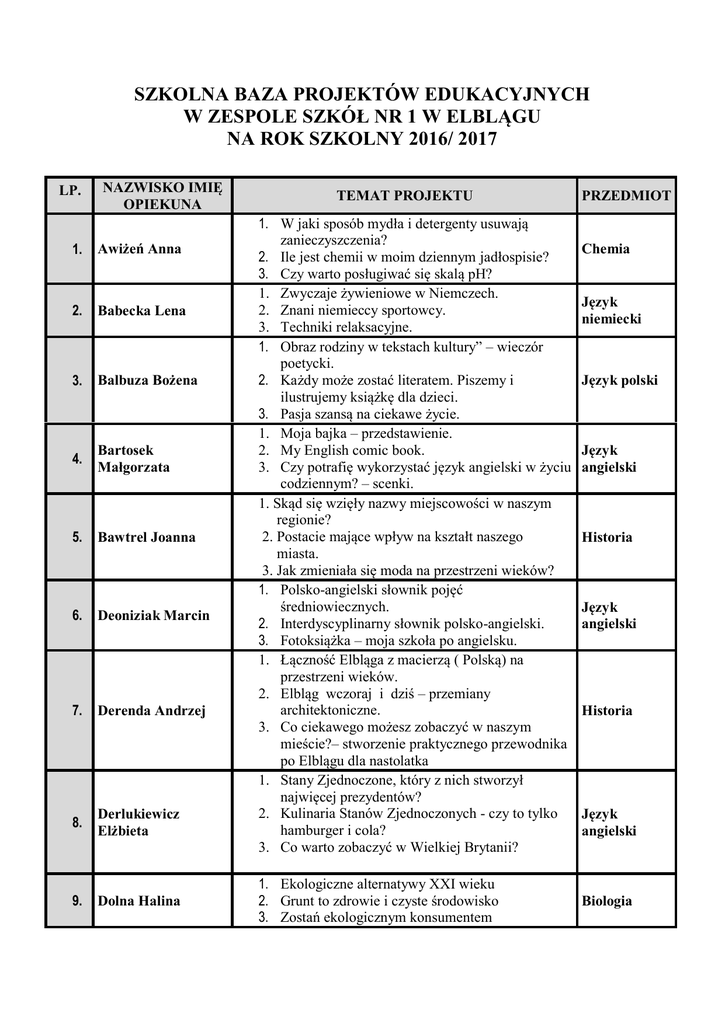 SZKOLNA BAZA PROJEKTÓW EDUKACYJNYCH W ZESPOLE SZKÓŁ NR 1 W ELBLĄGU NA ROK SZKOLNY 2016/ 2017 LP. NAZWISKO IMIĘ OPIEKUNA 1. Awiżeń Anna 2. Babecka Lena 3. Balbuza Bożena 4. Bartosek Małgorzata 5. Bawtrel Joanna 6. Deoniziak Marcin 7. Derenda Andrzej 8. Derlukiewicz Elżbieta 9. Dolna Halina TEMAT PROJEKTU 1. W jaki sposób mydła i detergenty usuwają zanieczyszczenia? 2. Ile jest chemii w moim dziennym jadłospisie? 3. Czy warto posługiwać się skalą pH? 1. Zwyczaje żywieniowe w Niemczech. 2. Znani niemieccy sportowcy. 3. Techniki relaksacyjne. 1. Obraz rodziny w tekstach kultury” – wieczór poetycki. 2. Każdy może zostać literatem. Piszemy i ilustrujemy książkę dla dzieci. 3. Pasja szansą na ciekawe życie. 1. Moja bajka – przedstawienie. 2. My English comic book. 3. Czy potrafię wykorzystać język angielski w życiu codziennym? – scenki. 1. Skąd się wzięły nazwy miejscowości w naszym regionie? 2. Postacie mające wpływ na kształt naszego miasta. 3. Jak zmieniała się moda na przestrzeni wieków? 1. Polsko-angielski słownik pojęć średniowiecznych. 2. Interdyscyplinarny słownik polsko-angielski. 3. Fotoksiążka – moja szkoła po angielsku. 1. Łączność Elbląga z macierzą ( Polską) na przestrzeni wieków. 2. Elbląg wczoraj i dziś – przemiany architektoniczne. 3. Co ciekawego możesz zobaczyć w naszym mieście?– stworzenie praktycznego przewodnika po Elblągu dla nastolatka 1. Stany Zjednoczone, który z nich stworzył najwięcej prezydentów? 2. Kulinaria Stanów Zjednoczonych - czy to tylko hamburger i cola? 3. Co warto zobaczyć w Wielkiej Brytanii? 1. Ekologiczne alternatywy XXI wieku 2. Grunt to zdrowie i czyste środowisko 3. Zostań ekologicznym konsumentem PRZEDMIOT Chemia Język niemiecki Język polski Język angielski Historia Język angielski Historia Język angielski Biologia 10. Fiodorowicz Edward 11. Gajewska Marta 12. Glaubert Justyna 13. Głowacka Marzena 14. Gniady Łucja 15. Gościńska Dorota 16. Jakubowska Wiesława 17. Jakubowski Adam 18. Kalka Jolanta 19. Kasprzak Kamila 20. Kaszuba Alicja 21. Kołacka Magdalena 1. W jaki sposób można wpłynąć na ograniczenie poziomu hałasu w szkole? 2. Jaki związek ma fizyka ze sportem? 3. Jak zorganizować turniej gier zespołowych? 1. Śpiewnik z piosenkami w języku niemieckim. 2. Święta i uroczystości obchodzone w Niemczech. 3. Wybitni Niemcy. 1. „Miłość niejedno ma imię”. 2. Pomysł na życie. 3. „Dom rodzinny widać, choć go nie ma…” 1. Złote proporcje. 2. Symetria w architekturze. 3. Znani polscy matematycy. 1. Geograficzne rekordy Guinessa. 2. Wycieczka po najbliższej okolicy. 3. Jakie pamiątki pozostawił nam lądolód skandynawski ? 1. Kibic i kibol- jacy jesteśmy? 2. Sklepik moich marzeń. 3. Jak styl życia wpływa na dobową aktywność ucznia? 1. Procenty w życiu codziennym - jak i gdzie warto ulokować swoje oszczędności? 2. Jak wygląda moje gimnazjum w liczbach i procentach? 3. Jakie bryły geometryczne są najczęściej wykorzystywane w architekturze Elbląga? 1. Jak się uczyć efektywnie? 2. Prezentacja mojej szkoły. 3. Budżet domowy rodziny – zastosowanie arkusza kalkulacyjnego w planowaniu. 1. Tworzymy gry edukacyjne z wykorzystanie platformy Learning Apps. 2. Matematyka da się lubić – pomoc w organizacji Dnia Matematyki. 3. Redagujemy kącik Rozrywek umysłowych w gazetce szkolnej. 1. „Język SMS-ów, Text message language” 2. „We are All Superhreoes” czyli jak zostać superbohaterem- tworzenie komiksów. 3. „Little Red Ridding Hood” – przedstawienie po angielsku. 1. BREXIT- czyli dlaczego Wielka Brytania wychodzi z Unii Europejskiej ? 2. The Royal Family”- kiedyś i teraz. 3. Największe kataklizmy w historii Stanów Zjednoczonych. 1. Profilaktyka i przeciwdziałanie patologiom i zagrożeniom społecznym dzieci i młodzieży przez sport i wychowanie w kulturze fizycznej. Wychowanie fizyczne Język niemiecki Język polski Matematyka Geografia Wychowanie fizyczne Matematyka Informatyka Matematyka Język angielski Język angielski Wychowanie fizyczne 22. Kowalska Małgorzata 23. Kurach Marzena 24. Kutowińska Mirosława 25. Kutra Sebastian 26. Lefelbajn Grażyna 27. Lipińska –Szadziul Katarzyna 28. Magoń Barbara 29. Majewski Arkadiusz 30. Malandy Małgorzata 31. Michalska-Pedersen Katarzyna 32. Nakonowski Roman 33. Namiotko Joanna 2. Promowanie zdrowego stylu życia. 3. Motywacja sportowca do ciężkiej pracy i lepszych efektów. 1. Jak mówić, aby nas słuchano? 2. Młodzieży pomysły na życie. 3. Dlaczego ludzie malują po ścianach? 1. Zagraj z nami w „książkę” 2. Na tropie błędów językowych. 3. Gadające głowy” Krzysztofa Kieślowskiego współcześnie. 1. Żyjemy wśród drzew. 2. Środowisko wokół nas - porosty jako wskaźniki czystości powietrza. 3. Całkiem nowa piramida pokarmowa! 1. Znani i zasłużeni Niemcy oraz ich osiągnięcia. 2. Trzy dni w Berlinie – przewodnik turystyczny. 3. Ile niemieckiego jest w polskim”, czyli germanizmy w naszym otoczeniu. 1. Literatura, poezja i liczby. 2. Rozwijanie zainteresowań matematycznych uczniów. 3. Jak wyznaczyć wartość najsłynniejszej liczby niewymiernej –pi? 1. „Naprawdę jaka jesteś…”- przemiany ideału piękna kobiety na przestrzeni wieków. 2. Moda, stroje i fryzury wybranych epok na podstawie dzieł sztuki. 3. Moje miasto- Elbląg dawniej i dziś. 1. Zwierzęta jako bohaterowie bajek. 2. Karnawały nie tylko średniowieczne. 3. Jak masz na imię? 1. Dlaczego warto ćwiczyć na W-FIE -dobre strony. 2. Różne sposoby i formy aktywności ruchowej. 3. Koszykówka jako styl życia. 1. Jak można spędzać czas wolny? - mało znane gry i zabawy rekreacyjne. 2. Dlaczego potrzebna jest rozgrzewka przed zawodami sportowymi? 3. Idea olimpizmu. 1. Oprowadzamy zagranicznych gości po Elblągu. 2. Moja rodzina przeprowadza się za granicę. 3. Miesiąc z życia słynnej postaci historycznej – blog. 1. Elbląg- 