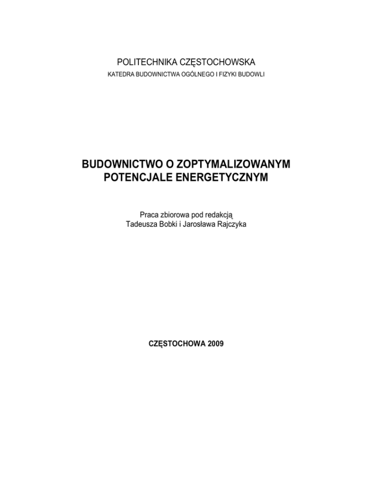 POLITECHNIKA CZĘSTOCHOWSKA KATEDRA BUDOWNICTWA OGÓLNEGO I FIZYKI BUDOWLI BUDOWNICTWO O ZOPTYMALIZOWANYM POTENCJALE ENERGETYCZNYM Praca zbiorowa pod redakcją Tadeusza Bobki i Jarosława Rajczyka CZĘSTOCHOWA 2009 1 Rada Naukowa Prof. dr hab. inż. Arnold Pabian Politechnika Częstochowska Prof. dr hab. inż. Jurij Pawluczuk Brzeski Uniwersytet Techniczny, Białoruś Dr hab. inż. Vladimir Pilipenko . Dyrektor Instytutu Naukowo-Badawczego i Projektowo-Technologicznego w Budownictwie, Białoruś Prof. dr hab. inż. Piotr Pojta Brzeski Uniwersytet Techniczny, Białoruś Prof. dr hab. inż. Jarosław Rajczyk Politechnika Częstochowska Prof. dr hab. inż. Marlena Rajczyk Politechnika Częstochowska Prof. dr. Richard Schilling Techniczny Uniwersytet w Reutlingen, Niemcy O.Univ. Prof. Dipl.-ing. Dr. Orlich Sznejder Uniwersytet Techniczny w Wiedniu, Austria Prof. dr hab. inż. Andrzej Służalec Politechnika Częstochowska Prof. Qi Chenzghi Uniwersytet Architektury i Budownictwa w Pekinie, Chiny Prof. dr hab. inż. Marian Abramowicz Szkoła Główna Służby Pożarniczej w Warszawie Prof. dr hab. inż. Tadeusz Bobko Politechnika Częstochowska Prof. dr hab. inż. Kazimierz Flaga Politechnika Krakowska Prof. dr hab. inż. Nina Kazhzr Politechnika Częstochowska Prof. dr hab. inż. Lucjan Kurzak Politechnika Częstochowska Dr inż. Michał Markowski Dyrektor Instytutu Naukowo-Badawczego w Budownictwie, Białoruś Prof. ing. Alois Materna Techniczny Uniwersytet w Ostrawie, Czechy Prof. dr hab. inż. Jurij Matrosow Centralny Instytut Naukowo-Badawczy Fizyki Budowli, Rosja Prof. inż. Vladimir Modrák Techniczny Uniwersytet w Koszycach, Słowacja Prof. dr inż. Christopf Motzko Techniczny Uniwersytet w Darmstadt, Niemcy Recenzenci Prof. dr hab. inż. Tadeusz Bobko Prof. dr hab. inż. Jarosław Rajczyk Prof. dr hab. inż. Marlena Rajczyk Dr inż. Adam Ujma Dr inż. Zbigniew Respondek Przygotowanie do druku Jarosław Jasiński ISBN 978-83-61118-33-6 © Copyright by Sekcja Wydawnictwa Wydziału Zarządzania Politechniki Częstochowskiej Częstochowa 2009 Sekcja Wydawnictwa Wydziału Zarządzania Politechniki Częstochowskiej, 42-200 Częstochowa, al. Armii Krajowej 36 B tel. (0 34) 32 50 480, 32 50 859 e-mail: [email protected] Wydanie I; B5; Nakład 120 egz. 2 SPIS TREŚCI Słowo wstępne Bobko Tadeusz Modelowanie prawidłowości zmian wpływu masywności elementu konstrukcyjnego na wartość potencjału energetycznego Bobko Tadeusz Modelowanie uwarunkowań procesu uzyskania przez beton odporności mrozowej w oparciu o wartość potencjału energetycznego Iveta Bullová, Miloslav Bagoňa Modelowanie prawidłowości zmian wpływu masywności elementu konstrukcyjnego na wartość potencjału energetycznego Piotr Całusiński Odpowiednia diagnostyka maszyn i jej wpływ na koszty produkcji elementów konstrukcji stalowych Четырбок Н. П. Концептуальные подходы к формированию и реализации региональной инновационной политики Данилевский С. Л. Oптический метод контроля уплотнения бетонной смеси Данилевский Л. Н. Oптимизация конструкции рекуперативных теплообменников воздух/воздух и схем их использования Danilevsky L.N., Lisimenko I.F. Active noise cancellation for ventilation systems in commertial buildings Данилевский Л. Н., Пилипенко В. М Oпыт строительства энергоэффективных зданий в республике Беларусь и экспериментальное исследование эксплуатационных характеристик энергоэффективного панельного жилого дома w г. Минске Данилевский Л.Н. Управление влажностью воздуха в помещениях с принудительной системой вентиляции и рекуперацией тепла уходящего воздуха Елена Ерошенко Ресурсосбережение в строительстве беларуси: оценка перспектив Евтюков С.А., Максимова М.Н., Райчык Ярослав Влияние дорожных условий на аварийность автомобильного транспорта Максимова М.Н., Райчык Ярослав Влияние различных факторов на коэффициент сцепления Евтюков С.А., Кузнецова А.А. Методика расчета основных параметров пневматических транспортных установок Евтюков С.А., Кузнецова А.А. Повышение эффективности работы пневматических транспортных установок за счет увеличения надежности основных узлов Евтюков С.А., Степина П. А. Методика анализа дорожно-транспортных происшествий Евтюков С.C., Михайлов Ю. Системы технической диагностики ДКМ 3 6 7 13 16 22 29 35 43 53 60 74 88 94 100 108 115 122 127 Евтюкова К.С., Медрес Е.Е. Особенности внедрения системы менеджмента качества в строительной компании Васильев Я.В., Евтюков С.А. Расчет скорости автомобиля в момент наезда на пешехода по расстоянию отброса тела Henryk Кatowicz - Кowalewski Semiotyczne bariery rozwoju technologii energoaktywnych w budownictwie mieszkaniowym Henryk Katowicz - Kowalewski Dekonstrukcja i energetyka budownictwa – formalne 