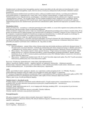Krew I Niedokrwistość to obniżenie ilości hemoglobiny poniżej wartości prawidłowych dla osób zdrowych określonej płci i wieku. Zmniejszeniu stężenia hemoglobiny często, choć nie zawsze, towarzyszy zmniejszenie liczby krwinek i obniżenie wartości hematokrytu. Przed rozpoznaniem niedokrwistości prawdziwej należy wykluczyć niedokrwistość rzekomą- wywołaną przewodnieniem (zatrzymanie płynów w organizmie np.w czasie ciąży; wlewy dożylne; retencja płynów w zespole nerczycowym). Niedokrwistości normo i hipochromiczne, przebiegające z niewielkimi zmianami odsetka retikulocytów Anglosasi nazywają „hypoprofliferative anemia”. Do tej grupy należą: wczesne stadium niedoboru żelaza, niedokrwistość w przebiegu chorób przewlekłych (stanów zapalnych)-ACD, chorób nerek, stanów hypometabolicznych (niedoborów żywieniowych i zaburzeń endokrynologicznych) oraz niedokrwistość spowodowana uszkodzeniem szpiku. Spośród nich najczęstsze są niedobór żelaza i ACD. Metabolizm żelaza: Żelazo jest toksyczne – uczestniczy w reakcjach generujących wolne rodniki, co za tym idzie organizm musi jednocześnie dbać o stałą obecnośc tego pierwiastka i bronić się przed jego nadmiarem. Żelazo uwolnione z magazynów do krwi wiąże się z transferryną- glikoproteiną posiadającą dwwa miejsca wiązania żelaza. W tej postaci jest dostarczane do szpiku kostnego (czas utrzymywania się transferyny związanej z żelazem we krwi wynosi ok. 90 min). Po związaniu z receptorem kompleks Fe-transferryna-receptor jest internalizowany i w niskim pH rozpada się uwalniając Fe. Transferryna powraca do krążenia, zaś receptor na powierzchnię błony komórkowej. Wewnątrz komórki żelazo wiąże się z apoferrytyną tworząc ferrytynę. Dorosła osoba posiadająca ok. 2 l krwinek czerwonych potrzebuje 16-20 mg Fe dziennie dla celów hemopoezy i dalszych 10-15 mg dla prawidłowego funkcjonowania pozostałych komórek Oczywiście nie jest konieczne wchłanianie takiej ilości żelaza – potrzebne jest jedynie wyrównanie strat: wchłoniecie ok. 1mg żelaza na dobę. Niedobór żelaza: 1. Okres przedutajony - ujemny bilans żelaza: dzienna utrata tego pierwiastka przekracza możliwości absorpcji (utrata 1020 ml krwinek czerwonych dziennie)– dochodzi do zmniejszenia puli żelaza zmagazynowanego w układzie siateczkowo - śródbłonkowym. Poziom żelaza w surowicy, TIBC oraz morfologia pozostają w granicach wartości prawidłowych. 2. Okres utajony - Wyczerpanie zapasów żelaza: poziom ferrytyny <15ug/l oznacza wyczerpanie zapasów żelaza. Jednak dopóki poziom Fe w surowicy pozostaje prawidłowy, synteza hemoglobiny przebiega prawidłowo. Spadek saturacji transferryny do ok. 15-20 % wyznacza granicę upośledzenia syntezy Hb. Dokładne badanie rozmazu krwi obwodowej ujawni obecność mikrocytow. 3. Okres jawny - Umiarkowana niedokrwistość: Hb 10-13 g/dl. Niewielka odpowiedź szpiku. Przy Hb 7-8 g/dl zauważamy mikrocytozę, poikilocytozę oraz wzrost aktywności szpiku. Przyczyny: Zwiększone zapotrzebowanie, utrata żelaza, hiposuplementacja Fe. Objawy: męczliwość, bladość, cheilitis – zapalenie kącików ust- pęknięcia. Koilonychia – wklęśnięcie paznokci. Różnicowanie: Talasemie (mikrocytoza, ale Fe prawidłowe), ACD- choroby przewlekłe-zwykle normo- chromiczna i –cytarna. Zespoły mielodysplastyczne – Fe prawidłowe mimo mikrocytozy i hipochromii. ACD Skutek przewlekłych stanów zapalnych, zakażeń, ran, wydzielania cytokin pozapalnych (IL1 i 6, TNFalfa). Wynika z nieprawidłowego transportu żelaza do szpiku, przy prawidłowym stanie jego zapasów w organizmie. IL1 zmniejsza bezpośrednio produkcję erytropoetyny (EPO), za pośrednictwem IFN-g zmniejsza odpowiedź szpiku na EPO. TNF za pośrednictwem IFN-b wydzielanego przez komórki zrębu szpiku również zmniejsza odpowiedź na EPO. Objawy: patrz wyżej. Zwykle przebieg jest łagodny. Niedokrwistość w chorobach nerek: Przebieg zależny od ciężkości uszkodzenia nerek (torbielowatość!). Zwykle normocytarna i normochromiczna. Jest skutkiem niedoboru EPO, ale także skrócenia czasu przeżycia erytrocytów (zespół hemolityczno – mocznicowy). Stany hipometaboliczne: Głodzenie: spada zapotrzebowanie na O2 , na co reagują nerki obniżając produkcję EPO – nie sam poziom O2 jest bowiem stymulatorem jej wydzielania. Niedobór androgenów, hormonów tarczycy, przysadki. Choroba Addisona. Choroby wątroby: skrócenie czasu przeżycia erytrocytów. Hemoglobinopatie: Hb oprócz transportu O2 wpływa także na kształt, elastyczność i lepkość krwi. Hemoglobinopatie to zaburzenia struktury Hb, których skutkiem mogą być: niedokrwistość, erytrocytoza, sinica lub powstawanie zatorów w naczyniach. Gen a globiny - chromosom 16 Gen b i d globiny - chromosom 11 1 Transport tlenu zależy od tetramerycznej struktury hemoglobiny, modyfikacje powinowactwa Hb do tlenu: o efekt Bohra (mniejsze powinowactwo w niższym pH); o 2,3DPG (Hb A ma największe powinowactwo do tego związku, Hb F nie wiąże się z 2,3DPG! ma więc wyższe powinowactwo do O2 .) Grupy hemoglobinopatii: Strukturalne – anemia sierpowata – HbS(a2b26Glu Va1) – łańcuchy polimeryzują (odwracalnie) – usztywniają błonę erytrocyta, zmieniają jej kształt; Objawy: anemia hemolityczna, mikrozatory – upośledzenie ukrwienia, uszkodzenia narządów (mikrozawały), priapizm – jako skutek zatorów w naczyniach odprowadzających krew z prącia, impotencja. Ostry zespół piersiowy:ból w klp.; tachypnoe, gorączka, kaszel, obniżenie saturacji – podobny do zapalenia płuc, zatorowości płuc. 1. o Talasemie – uszkodzenie mRNA globiny – niedobór poszczególnych łańcuchów globiny – skrócenie życia erytrocyta. Beta: hypochromia, mikrocytoza, mała ilość prawidłowych tetrametrów. Stymulacja wydzielania EPO prowadzi do nadmiernego rozrostu szpiku i w związku z tym upośledzenia rozwoju kości 