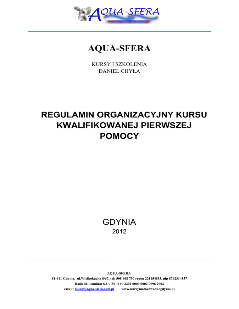 AQUA-SFERA KURSY I SZKOLENIA DANIEL CHYŁA REGULAMIN ORGANIZACYJNY KURSU KWALIFIKOWANEJ PIERWSZEJ POMOCY GDYNIA 2012 AQUA-SFERA 81-611 Gdynia, ul.Wielkokacka 8/67, tel: 505 608 730 regon 221154835, nip 8762314557 Bank Millennium SA : 36 1160 2202 0000 0002 0596 2002 email: [email protected] www.kursymotorowodnegdynia.pl Podstawa prawna: Regulamin organizacyjny kursu jest zgodny z: - Ustawą z dnia 8 września 2006 r. o Państwowym Ratownictwie Medycznym (Dz. U. z 2006 r., Nr 191, poz. 1410); - Rozporządzeniem Ministra Zdrowia z dnia 19 marca 2007 r. w sprawie kursu w zakresie kwalifikowanej pierwszej pomocy (Dz. U. z 2007 r., Nr 60, poz. 408) AQUA-SFERA 81-611 Gdynia, ul.Wielkokacka 8/67, tel: 505 608 730 regon 221154835, nip 8762314557 Bank Millennium SA : 36 1160 2202 0000 0002 0596 2002 email: [email protected] www.kursymotorowodnegdynia.pl 1. ORGANIZACJA SZKOLENIA 1.1 Szkolenie organizowane jest przez firmę AQUA-SFERA Daniel Chyła zwana dalej podmiotem prowadzącym kurs, 1.2 Podstawę organizacji procesu dydaktyczno-wychowawczego stanowi plan nauczania zamieszczony w programie kursu, 1.3 W ramach szkolenia realizowane są teoretyczne i praktyczne zajęcia dydaktyczne przewidziane w planie nauczania, 1.4 Każda grupa szkoleniowa organizowana jest w podgrupy nieprzekraczające 6 osób, 1.5 Zajęcia praktyczne należy prowadzić w grupach liczących do 6-ciu osób (jeden instruktor może prowadzić zajęcia praktyczne z grupą liczącą nie więcej niż 6 osób), 1.6 Podmiot prowadzący kurs prowadzi dla każdej grupy szkoleniowej kursu kwalifikowanej pierwszej pomocy „Dziennik lekcyjny", w którym prowadzi imienną listę uczestników kursu oraz dokumentuje przebieg nauczania, 1.7 „Dziennik lekcyjny" musi mieć formę trwałą uniemożliwiającą dokonywanie jakichkolwiek zmian na jego stronach, AQUA-SFERA 81-611 Gdynia, ul.Wielkokacka 8/67, tel: 505 608 730 regon 221154835, nip 8762314557 Bank Millennium SA : 36 1160 2202 0000 0002 0596 2002 email: [email protected] www.kursymotorowodnegdynia.pl 1.8 Podmiot prowadzący kurs prowadzi imienną listę osób prowadzących zajęcia w ramach poszczególnych modułów nauczania, 1.9 Podmiot prowadzący kurs jest odpowiedzialna za właściwe prowadzenie, przechowywanie i wydawanie dokumentacji z przebiegu nauczania. 2. ZASADY I TRYB NABORU OSÓB PRAEWIDZIANYCH DO SZKOLENIA Warunkiem przyjęcia kandydata na szkolenie z zakresu kwalifikowanej pierwszej pomocy jest: - wypełnienie formularza zgłoszeniowego, który do pobranie jest na stronie www.aqua-sfera.com.pl i przesłanie go na adres email: [email protected], - posiadanie pełnych zdolność do czynności prawnych. 3. OBOWIĄZKI KADRY DYDAKTYCZNEJ 3.1 Kierownik merytoryczny kursu: - przed rozpoczęciem szkolenia opracowuje w formie pisemnej harmonogram zajęć który zatwierdza kierownik podmiotu prowadzącego kurs. - na pierwszych zajęciach przedstawia słuchaczom: a) b) c) d) e) program nauczania, zasady realizacji zajęć dydaktycznych, sposób bieżącej kontroli wyników nauczania, sposób, tryb i terminarz egzaminu końcowego, zalecaną literaturę. AQUA-SFERA 81-611 Gdynia, ul.Wielkokacka 8/67, tel: 505 608 730 regon 221154835, nip 8762314557 Bank Millennium SA : 36 1160 2202 0000 0002 0596 2002 email: [email protected] www.kursymotorowodnegdynia.pl 3.2 Wykładowca-instruktor: a) b) c) d) e) f) g) h) i) j) k) zapoznaje słuchaczy z tematem i celem ćwiczeń, omawia kolejne etapy nabywania umiejętności, przedstawia organizację ćwiczeń, prezentuje budowę wyposażenia technicznego oraz wyjaśnia zasady jego eksploatacji i obsługi, zgodnie z zasadami bezpieczeństwa i higieny pracy, przekazuje słuchaczom na bieżąco informację zwrotną odnośnie ich postępów w nabywaniu umiejętności, koryguje nieprawidłowości zauważonych w trakcie wykonywania ćwiczeń. odpowiada za prowadzenie zaliczeń poszczególnych tematów przez uczestników kursu, systematycznie dokonuje bieżącej oceny osiągnięć edukacyjnych słuchaczy, ze szczególnym uwzględnieniem treści tematów nauczanych na poprzednich zajęciach . odpowiada za bezpieczne wykonywanie zadań, jest zobligowany do śledzenia nowości wydawniczych, w tym prasy fachowej i publikacji aktów prawnych; współpracuje z innymi instruktorami celem ujednolicenia przekazywanych treści merytorycznych objętych programem kursu. 4. EGZAMIN KOŃCOWY 4.1 Słuchacz uzyskuje kwalifikacje ratownika po spełnieniu następujących warunków: a) odbył i zaliczył wszystkie zajęcia teoretyczne i praktyczne objęte programem kursu; b) uzyskał zaliczenie z części teoretycznej i pozytywną ocenę z części praktycznej na egzaminie końcowym. 4.2 Egzamin końcowy składa się z: a) b) egzaminu teoretycznego, egzaminu praktycznego. 4.3 Egzamin przeprowadzany jest z zakresu wiedzy i umiejętności objętych ramowym programem kursu. AQUA-SFERA 81-611 Gdynia, ul.Wielkokacka 8/67, tel: 505 608 730 regon 221154835, nip 8762314557 Bank Millennium SA : 36 1160 2202 0000 0002 0596 2002 email: [email protected] www.kursymotorowodnegdynia.pl 4.4 Do egzaminu może przystąpić osoba, która posiada zaświadczenie, które utraciło ważność, oraz jest zatrudniona w jednostkach współpracujących z systemem, o których mowa w art. 15 ust. 1 i 2 ustawy z dnia 8 września 2006 r. o Państwowym Ratownictwie Medycznym, zwanej dalej "ustawą", lub pełni w nich służbę, lub jest ich członkiem. 4.5 Każda część egzaminu oceniana jest oddzielnie. 4.6 Terminy egzaminu teoretycznego i praktycznego ustala kierownik merytoryczny kursu w porozumieniu z przewodniczącym komisji egzaminacyjnej, zwanej dalej "komisją". 4.7 Egzamin teoretyczny przeprowadzany jest w formie testu, ujętego w kartę testową, składającego się z zestawu 30 zadań testowych wybranych przez komisję spośród zadań testowych opracowanych przez Centrum Egzaminów Medycznych, działające na podstawie odrębnych przepisów, i podanych do publicznej informacji na stronac