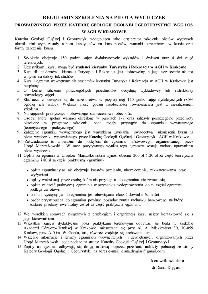 REGULAMIN SZKOLENIA NA PILOTA WYCIECZEK PROWADZONEGO PRZEZ KATEDRĘ GEOLOGII OGÓLNEJ I GEOTURYSTYKI WGG i OŚ W AGH W KRAKOWIE Katedra Geologii Ogólnej i Geoturystyki występująca jako organizator szkolenia pilotów wycieczek określa niniejszym zasady naboru kandydatów na kurs pilotów, warunki uczestnictwa w kursie oraz formy zaliczenia kursu. 1. Szkolenie obejmuje 150 godzin zajęć dydaktycznych: wykładów i ćwiczeń oraz 4 dni zajęć terenowych. 2. Uczestnikami kursu mogą być studenci kierunku Turystyka i Rekreacja w AGH w Krakowie. 3. Kurs dla studentów kierunku Turystyka i Rekreacja jest dobrowolny, a jego niezaliczenie nie ma wpływu na dalszy tok studiów. 4. Kurs i egzamin wewnętrzny dla studentów kierunku Turystyka i Rekreacja w AGH w Krakowie jest bezpłatny. 5. O formie zaliczenia poszczególnych przedmiotów decydują wykładowcy lub instruktorzy prowadzący zajęcia. 6. Słuchacze zobowiązani są do uczestnictwa w przynajmniej 120 godz. zajęć dydaktycznych (80% ogólnej ich liczby). Większa i1ość godzin nieobecności równoznaczna jest z niezaliczeniem szkolenia. 7. Na zajęciach praktycznych obowiązuje stuprocentowa obecność. 8. Osoby, które spełnią warunki określone w punktach 1-7 oraz zaliczyły poszczególne przedmioty określone w programie szkolenia, będą mogły przystąpić do egzaminu wewnętrznego (teoretycznego i praktycznego). 9. Zaliczenie egzaminu wewnętrznego jest warunkiem uzyskania świadectwa ukończenia kursu na pilota wycieczek, wystawianego przez Katedrę Geologii Ogólnej i Geoturystyki AGH w Krakowie. 10. Zaświadczenie to upoważnia do podejścia do egzaminu państwowego, organizowanego przez Urząd Marszałkowski. W razie pozytywnego wyniku tego egzaminu zostają nadane uprawnienia pilota wycieczek. 11. Opłata za egzamin w Urzędzie Marszałkowskim wynosi obecnie 200 zł (120 zł za część teoretyczną egzaminu i 80 zł za część praktyczną egzaminu). opłata egzaminacyjna nie obejmuje kosztów przejazdu, ubezpieczenia, zakwaterowania oraz wyżywienia, opłaty wniesionej przez osobę, która nie przystąpiła do egzaminu nie zwraca się, opłata za część praktyczną egzaminu w przypadku niedopuszczenia do tej części egzaminu podlega zwrotowi, osoba przystępująca do egzaminu jest obowiązana okazać dowód tożsamości, osoba przystępująca do egzaminu powinna posiadać numer rachunku bankowego, na który zostanie przelany ewentualny zwrot za część praktyczną egzaminu. 12. We wszelkich sprawach związanych z przebiegiem i organizacją kursu należy kontaktować się z jego kierownikiem. 13. Wszystkie zajęcia dydaktyczne poza praktykami terenowymi odbywać się będą w siedzibie Akademii Górniczo-Hutniczej w Krakowie, mieszczącej się przy Al. A. Mickiewicza 30, 30-059 Kraków, paw. A-0 im. W. Goetla, tutaj również znajduje się archiwum kursu. 14. Wszelkie informacje i terminy egzaminów wewnętrznych i zewnętrznych, organizowanych przez Urząd Marszałkowski będą podane na stronie Katedry Geologii Ogólnej i Geoturystyki. 15. Zapisy na egzamin odbywają się drogą mailową poprzez przesłanie ankiety pobranej ze strony Katedry Geologii Ogólnej i Geoturystyki na adres e-mail: [email protected] kierownik szkolenia dr Diana Dryglas