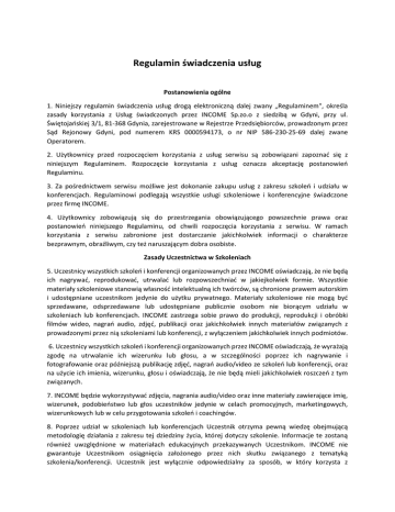 Regulamin świadczenia usług Postanowienia ogólne 1. Niniejszy regulamin świadczenia usług drogą elektroniczną dalej zwany „Regulaminem", określa zasady korzystania z Usług świadczonych przez INCOME Sp.zo.o z siedzibą w Gdyni, przy ul. Świętojańskiej 3/1, 81-368 Gdynia, zarejestrowane w Rejestrze Przedsiębiorców, prowadzonym przez Sąd Rejonowy Gdyni, pod numerem KRS 0000594173, o nr NIP 586-230-25-69 dalej zwane Operatorem. 2. Użytkownicy przed rozpoczęciem korzystania z usług serwisu są zobowiązani zapoznać się z niniejszym Regulaminem. Rozpoczęcie korzystania z usług oznacza akceptację postanowień Regulaminu. 3. Za pośrednictwem serwisu możliwe jest dokonanie zakupu usług z zakresu szkoleń i udziału w konferencjach. Regulaminowi podlegają wszystkie usługi szkoleniowe i konferencyjne świadczone przez firmę INCOME. 4. Użytkownicy zobowiązują się do przestrzegania obowiązującego powszechnie prawa oraz postanowień niniejszego Regulaminu, od chwili rozpoczęcia korzystania z serwisu. W ramach korzystania z serwisu zabronione jest dostarczanie jakichkolwiek informacji o charakterze bezprawnym, obraźliwym, czy też naruszającym dobra osobiste. Zasady Uczestnictwa w Szkoleniach 5. Uczestnicy wszystkich szkoleń i konferencji organizowanych przez INCOME oświadczają, że nie będą ich nagrywać, reprodukować, utrwalać lub rozpowszechniać w jakiejkolwiek formie. Wszystkie materiały szkoleniowe stanowią własność intelektualną ich twórców, są chronione prawem autorskim i udostępniane uczestnikom jedynie do użytku prywatnego. Materiały szkoleniowe nie mogą być sprzedawane, odsprzedawane lub udostępniane publicznie osobom nie biorącym udziału w szkoleniach lub konferencjach. INCOME zastrzega sobie prawo do produkcji, reprodukcji i obróbki filmów wideo, nagrań audio, zdjęć, publikacji oraz jakichkolwiek innych materiałów związanych z prowadzonymi przez nią szkoleniami lub konferencji, z wyłączeniem jakichkolwiek innych podmiotów. 6. Uczestnicy wszystkich szkoleń i konferencji organizowanych przez INCOME oświadczają, że wyrażają zgodę na utrwalanie ich wizerunku lub głosu, a w szczególności poprzez ich nagrywanie i fotografowanie oraz późniejszą publikację zdjęć, nagrań audio/video ze szkoleń lub konferencji, oraz na użycie ich imienia, wizerunku, głosu i oświadczają, że nie będą mieli jakichkolwiek roszczeń z tym związanych. 7. INCOME będzie wykorzystywać zdjęcia, nagrania audio/video oraz inne materiały zawierające imię, wizerunek, podobieństwo lub głos uczestników jedynie w celach promocyjnych, marketingowych, wizerunkowych lub w celu przygotowania szkoleń i coachingów. 8. Poprzez udział w szkoleniach lub konferencjach Uczestnik otrzyma pewną wiedzę obejmującą metodologię działania z zakresu tej dziedziny życia, której dotyczy szkolenie. Informacje te zostaną również uwzględnione w materiałach edukacyjnych przekazywanych Uczestnikom. INCOME nie gwarantuje Uczestnikom osiągnięcia założonego przez nich skutku związanego z tematyką szkolenia/konferencji. Uczestnik jest wyłącznie odpowiedzialny za sposób, w który korzysta z przedstawionych mu metodologii, w szczególności za wykorzystywanie ich niezgodnie z instrukcjami trenera. 9. Osoby biorące udział w szkoleniu lub konferencji oświadczają, że nie będą zgłaszać jakichkolwiek roszczeń w stosunku do szkoleń, konferencji, lub materiałów z nich pochodzących. 10. INCOME, nie jest w żaden sposób odpowiedzialna za nieupoważnione posługiwanie się lub wykorzystanie jej logotypu, firmy, treści publikacji, produktów edukacyjnych, danych pracowników i trenerów firmy przez osoby trzecie do ich własnych celów. Zawarcie i rozwiązanie umowy 11. Umowa o świadczenie usług INCOME może być zawarta poprzez zakup usługi bezpośrednio przez portal. Umowa zawierana jest pod warunkiem rozwiązującym zapłaty ceny, co oznacza, że w przypadku braku zapłaty umowa ulega rozwiązaniu. 12. Płatność za usługi INCOME może być dokonana poprzez formularz płatności po wpisaniu Imienia i Nazwiska, Emaila, Nr Telefonu, rodzaju biletu SILVER/GOLD/PLATINUM oraz ilości biletów. 13. Jeżeli szkolenie nie odbędzie się z winy INCOME, rozliczenie wpłaconej na rzecz INCOME należności nastąpi w trybie określonym w pkt 16 niniejszego regulaminu. 14. INCOME i jej upoważnieni przedstawiciele mogą poprosić uczestnika o opuszczenie szkolenia (za zwrotem pieniędzy potrąconych o wartość częściowego udziału w szkoleniu; kwota ta będzie obliczona proporcjonalnie do planowanej długości szkolenia i czasu, w którym Uczestnik brał w szkoleniu udział), w przypadku powtarzającego się regularnie nieodpowiedniego zachowania uczestnika, to jest w szczególności jeśli Uczestnik pozostaje pod wpływem alkoholu, narkotyków, używa wobec prowadzącego lub innych Uczestników słów powszechnie uznanych za obraźliwe, zakłóca przebieg wystąpień prowadzącego lub innych osób wypowiadających się podczas szkolenia i jeśli w konsekwencji zakłóca to przebieg szkolenia i oddziałuje negatywnie na proces szkolenia całej grupy. Jeżeli po zawarciu umowy i dokonaniu zapłaty okaże się, że Uczestnik nie może wziąć udziału w szkoleniu lub konferencji – wpłacone środki można wykorzystać w kolejnym terminie takiego samego szkolenia, a także przenieść na inne szkolenie lub konferencja organizowane przez INCOME. Zwrot wpłaconych pieniędzy nie jest możliwy poza sytuacjami przewidzianymi ustawowo. 15. INCOME zastrzega sobie prawo do odwołania szkolenia lub konferencji z przyczyn od niej niezależnych polegających na chorobie lub wypadku losowym osoby, która miała prowadzić szkolenie, rezygnacji osoby prowadzącej szkolenie w czasie uniemożliwiającym jej zastąpienie, utracie prawa do korzystania z lokalu, w którym miało się odbyć szkolenie, wystąpieniu wypadków losowych uniemożliw