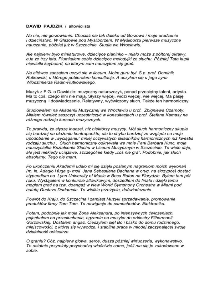 DAWID PAJDZIK / altowiolista No nie, nie gorzowianin. Chociaż nie tak daleko od Gorzowa i moje urodzenie i dzieciństwo. W Głazowie pod Myśliborzem. W Myśliborzu pierwsze muzyczne nauczanie, później już w Szczecinie. Studia we Wrocławiu. Ale najpierw było miniaturowe, dziecięce pianinko – miało może z półtorej oktawy, a ja ze trzy lata. Plumkałem sobie dziecięce melodyjki ze słuchu. Później Tata kupił niewielki keyboard, na którym sam nauczyłem się grać. Na altówce zacząłem uczyć się w liceum. Moim guru był Ś.p. prof. Dominik Rutkowski, u którego pobierałem konsultacje. A uczyłem się u jego syna Włodzimierza Radin-Rutkowskiego. Muzyk z F.G. o Dawidzie: muzyczny naturszczyk, ponad przeciętny talent, artysta. Ma to coś, czego inni nie mają. Słyszy więcej, widzi więcej, wie więcej. Ma pasję muzyczną i doświadczenie. Relatywny, wyćwiczony słuch. Także ten harmoniczny. Studiowałem na Akademii Muzycznej we Wrocławiu u prof. Zbigniewa Czarnoty. Miałem również zaszczyt uczestniczyć w konsultacjach u prof. Stefana Kamasy na różnego rodzaju kursach muzycznych. To prawda, że słyszę inaczej, niż niektórzy muzycy. Mój słuch harmoniczny skupia się bardziej na ułożeniu kontrapunktu, ale to chyba bardziej ze względu na moje upodobanie w „wyciąganiu” mniej oczywistych składników harmonicznych niż kwestia rodzaju słuchu . Słuch harmoniczny odkrywała we mnie Pani Barbara Kunc, moja nauczycielka Kształcenia Słuchu w Liceum Muzycznym w Szczecinie. To wiele daje, ale jest niekiedy uciążliwe, szczególnie kiedy „coś nie gra”. Podobnie, jak słuch absolutny. Tego nie mam. Po ukończeniu Akademii udało mi się dzięki posłanym nagraniom moich wykonań (m. in. Adagio i fuga g- moll Jana Sebastiana Bachana w oryg. na skrzypce) dostać stypendium na Lynn University of Music w Boca Raton na Florydzie. Byłem tam pół roku. Wystąpiłem w konkursie altówkowym, doszedłem do finału i dzięki temu mogłem grać na tzw. doangaż w New World Symphony Orchestra w Miami pod batutą Gustavo Dudamela. To wielkie przeżycie, doświadczenie. Powrót do Kraju, do Szczecina i zamiast Muzyki sprzedawanie, promowanie produktów firmy Tom Tom. To nawigacje do samochodów. Elektronika. Potem, podobnie jak moja Żona Aleksandra, po intensywnych ćwiczeniach, pojechałem na przesłuchanie, egzamin na muzyka do orkiestry Filharmonii Gorzowskiej. Dostałem angaż. Cieszyłem się! Bo i blisko do domu rodzinnego, miejscowości, z której się wywodzę, i stabilna praca w młodej zaczynającej swoją działalność orkiestrze. O graniu? Cóż, najpierw głowa, serce, dusza później wirtuozeria, wykonawstwo. Te ostatnie przymioty przychodzą właściwie same, jeśli ma się je zakodowane w sobie. Oczywiście, bez ćwiczenia, pracy nie ma nic. Emocji – ich pokazania nie można się nauczyć. Osobną sprawą są nieprawidłowości w nauczaniu – uczelnie nie uczą „na” muzyków orkiestrowych, uczą na solistów. A tych przecież w nadmiarze. Potem problem z pracą, przyzwyczajeniem się do wspólnego grania. Dlatego właśnie na te wartości edukacyjne próbuję zwrócić uwagę moich studentów, których uczę na Akademii Sztuki w Szczecinie. Moim przesłaniem jest przede wszystkim nauczyć ich słuchać siebie nawzajem, to jest podstawowa cecha dobrego muzyka orkiestrowego. Nie, nie mam żadnych problemów z łączeniem Muzyki, związanej z nią mojej emocjonalności, z rzeczywistością. Nie oddzielam, co oczywiste. Staram się łączyć. To tak jak z pracą fizyczną – trzeba wszystko dobrze wykonać, zmęczyć się, dać siebie. Starać się, żeby było jak najlepiej. Owszem, jak każdy, przeżywam ganienie, niedocenienie, pomijanie. Hobby? Wędkarstwo, gry komputerowe. Ale wszystko z umiarem. Jednak moją prawdziwą pozamuzyczną pasją zawsze było gotowanie, swego czasu zrobiłem nawet uprawnienia czeladnicze w zawodzie kucharza. Moją największą fanką w tej dziedzinie jest oczywiście moja żona.