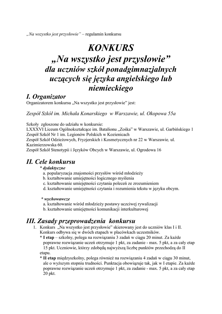 „Na wszystko jest przysłowie” – regulamin konkursu KONKURS „Na wszystko jest przysłowie” dla uczniów szkół ponadgimnazjalnych uczących się języka angielskiego lub niemieckiego I. Organizator Organizatorem konkursu „Na wszystko jest przysłowie” jest: Zespół Szkół im. Michała Konarskiego w Warszawie, ul. Okopowa 55a Szkoły zgłoszone do udziału w konkursie: LXXXVI Liceum Ogólnokształcące im. Batalionu „Zośka” w Warszawie, ul. Garbińskiego 1 Zespół Szkół Nr 1 im. Legionów Polskich w Kozienicach Zespół Szkół Odzieżowych, Fryzjerskich i Kosmetycznych nr 22 w Warszawie, ul. Kazimierzowska 60. Zespół Szkół Stenotypii i Języków Obcych w Warszawie, ul. Ogrodowa 16 II. Cele konkursu * dydaktyczne a. popularyzacja znajomości przysłów wśród młodzieży b. kształtowanie umiejętności logicznego myślenia c. kształtowanie umiejętności czytania poleceń ze zrozumieniem d. kształtowanie umiejętności czytania i rozumienia tekstu w języku obcym. * wychowawcze a. kształtowanie wśród młodzieży postawy uczciwej rywalizacji b. kształtowanie umiejętności komunikacji interkulturowej III. Zasady przeprowadzenia konkursu 1. Konkurs „Na wszystko jest przysłowie” skierowany jest do uczniów klas I i II. Konkurs odbywa się w dwóch etapach w placówkach uczestników. * I etap – szkolny, polega na rozwiązaniu 3 zadań w ciągu 20 minut. Za każde poprawne rozwiązanie uczeń otrzymuje 1 pkt, za zadanie - max. 5 pkt, a za cały etap 15 pkt. Uczniowie, którzy zdobędą najwyższą liczbę punktów przechodzą do II etapu. * II etap międzyszkolny, polega również na rozwiązaniu 4 zadań w ciągu 30 minut, ale o wyższym stopniu trudności. Punktacja obowiązuje tak, jak w I etapie. Za każde poprawne rozwiązanie uczeń otrzymuje 1 pkt, za zadanie - max. 5 pkt, a za cały etap 20 pkt. IV. Organizacja etapu szkolnego 1. Szkoły zapoznają się z otrzymanym regulaminem konkursu oraz z harmonogramem – terminarzem. 2. Skład Szkolnej Komisji Konkursowej (SKK) sekcji angielskiej i sekcji niemieckiej, na terenie szkoły, ustalają odpowiednio nauczyciele języka angielskiego i języka niemieckiego, powołani na przewodniczących przez dyrektora szkoły. 3. Przewodniczący SKK sporządza listę uczestników i otrzymane materiały przygotowujące do I i II etapu konkursu powiela w ilości odpowiadającej liczbie uczniów przystępujących do konkursu z języków angielskiego i języka niemieckiego. 4. Szkoły otrzymują zestaw zadań konkursowych do przeprowadzenia I etapu konkursu wraz z kluczem odpowiedzi drogą e-mailową. 5. Przewodniczący SKK powiela zestawy zadań konkursowych i przeprowadza konkurs na terenie szkoły. 6. I Etap musi odbyć się w terminie podanym przez organizatora (dzień, godzina, czas pracy uczniów). 7. Uczniowie muszą mieć przybory do pisania. 8. Osoba, która zakłóci spokój zostanie zdyskwalifikowana. 9. Szkolna Komisja Konkursowa sprawdza prace uczniów zgodnie z kluczem do zadań. 10. Do etapu międzyszkolnego kwalifikują się wyłącznie uczniowie z najwyższą liczbą punktów. 11. Przewodniczący SKK sporządza listę laureatów I Etapu konkursu i przekazuje wyniki do wiadomości organizatora. 1. Szkolna Komisja Konkursowa we własnym zakresie wyróżnia uczestników I Etapu konkursu Dyplomami za udział w szkolnym etapie konkursu „Na wszystko jest przysłowie”. Laureatami konkursu zostają uczniowie, którzy zdobyli co najmniej 14 punktów możliwych do zdobycia. V. Organizacja etapu międzyszkolnego 2. II Etap międzyszkolny odbywa się również w rodzimych placówkach szkół i przebiega wg schematu I etapu. 3. W przypadku choroby któregoś z finalistów I etapu (lub w innym przypadku losowym) Przewodniczący SKK, decyduje o udziale w konkursie osoby, która zdobyła najwięcej punktów w etapie szkolnym. 4. Laureatami konkursu zostają uczniowie, którzy zdobyli co najmniej 16 punktów możliwych do zdobycia. 5. Ogłoszenie wyników i rozdanie nagród odbędzie się w Zespole szkół im. Michała Konarskiego. 6. Dla zwycięzców przewidziane są nagrody rzeczowe, a dla finalistów dyplomy. 7. Dyplomami zostaną uhonorowani również nauczyciele – opiekunowie Laureatów. VI. Zadania Przewodniczącego Szkolnej Komisji Konkursowej 1. Udzielenie uczniom informacji o organizacji, terminach i zasadach udziału w konkursie. 2. Zorganizowanie szkolnego etapu konkursu, sprawdzenie i zabezpieczenie prac uczniów, wyłonienie laureatów. 3. Sporządzenie protokołu bezpośrednio po sprawdzeniu zadań konkursowych (nazwa szkoły, lokata, imiona i nazwiska uczestników, liczba zdobytych punktów) i przesłanie go drogą e-mailową na adres [email protected] z tematem wiadomości Konkurs Na wszystko jest przysłowie. VII. Zadania organizatora 1. 2. 3. 4. 5. 6. Opracowanie regulaminu konkursu. Przygotowanie zadań konkursowych i dostarczenie ich Przewodniczącym SKK. Opracowanie raportu na podstawie protokołów Przewodniczących SKK. Wyłonienie Laureatów. Zorganizowanie uroczystego ogłoszenia wyników i wręczenia nagród. Prowadzenie dokumentacji konkursu, zabezpieczenie protokołów. VIII. Terminy przeprowadzenia konkursu 1. Do dnia 25 lutego 2013 r. należy zapoznać uczniów z organizacją terminami i zasadami udziału w konkursie. 2. I Etap konkursu szkolny powinien odbyć się do dnia 20 marca 2013 r. Godzinę każda szkoła ustala zgodnie ze swoim planem zajęć. 3. Sprawdzenie prac, sporządzenie protokołu, wyłonienie laureatów i sporządzenie ich listy do dnia 23 marca 2013 r. 4. II Etap konkursu międzyszkolny powinien odbyć się dnia 26.03.2013 r. Godzinę każda szkoła ustala zgodnie ze swoim planem zajęć. 5. Sprawdzenie prac, sporządzenie protokołu, wyłonienie laureatów i sporządzenie ich listy do dnia 29 marca 2013 r. 6. Ogłoszenie wyników i rozdanie nagród odbędzie się w siedzibie Zespołu Szkół im. Michała Konarskiego w Warszawie po uprzednim powiadomieniu o t