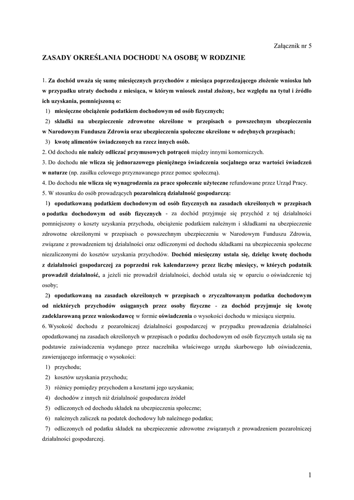 Załącznik nr 5 ZASADY OKREŚLANIA DOCHODU NA OSOBĘ W RODZINIE 1. Za dochód uważa się sumę miesięcznych przychodów z miesiąca poprzedzającego złożenie wniosku lub w przypadku utraty dochodu z miesiąca, w którym wniosek został złożony, bez względu na tytuł i źródło ich uzyskania, pomniejszoną o: 1) miesięczne obciążenie podatkiem dochodowym od osób fizycznych; 2) składki na ubezpieczenie zdrowotne określone w przepisach o powszechnym ubezpieczeniu w Narodowym Funduszu Zdrowia oraz ubezpieczenia społeczne określone w odrębnych przepisach; 3) kwotę alimentów świadczonych na rzecz innych osób. 2. Od dochodu nie należy odliczać przymusowych potrąceń między innymi komorniczych. 3. Do dochodu nie wlicza się jednorazowego pieniężnego świadczenia socjalnego oraz wartości świadczeń w naturze (np. zasiłku celowego przyznawanego przez pomoc społeczną). 4. Do dochodu nie wlicza się wynagrodzenia za prace społecznie użyteczne refundowane przez Urząd Pracy. 5. W stosunku do osób prowadzących pozarolniczą działalność gospodarczą: 1) opodatkowaną podatkiem dochodowym od osób fizycznych na zasadach określonych w przepisach o podatku dochodowym od osób fizycznych - za dochód przyjmuje się przychód z tej działalności pomniejszony o koszty uzyskania przychodu, obciążenie podatkiem należnym i składkami na ubezpieczenie zdrowotne określonymi w przepisach o powszechnym ubezpieczeniu w Narodowym Funduszu Zdrowia, związane z prowadzeniem tej działalności oraz odliczonymi od dochodu składkami na ubezpieczenia społeczne niezaliczonymi do kosztów uzyskania przychodów. Dochód miesięczny ustala się, dzieląc kwotę dochodu z działalności gospodarczej za poprzedni rok kalendarzowy przez liczbę miesięcy, w których podatnik prowadził działalność, a jeżeli nie prowadził działalności, dochód ustala się w oparciu o oświadczenie tej osoby; 2) opodatkowaną na zasadach określonych w przepisach o zryczałtowanym podatku dochodowym od niektórych przychodów osiąganych przez osoby fizyczne - za dochód przyjmuje się kwotę zadeklarowaną przez wnioskodawcę w formie oświadczenia o wysokości dochodu w miesiącu sierpniu. 6. Wysokość dochodu z pozarolniczej działalności gospodarczej w przypadku prowadzenia działalności opodatkowanej na zasadach określonych w przepisach o podatku dochodowym od osób fizycznych ustala się na podstawie zaświadczenia wydanego przez naczelnika właściwego urzędu skarbowego lub oświadczenia, zawierającego informację o wysokości: 1) przychodu; 2) kosztów uzyskania przychodu; 3) różnicy pomiędzy przychodem a kosztami jego uzyskania; 4) dochodów z innych niż działalność gospodarcza źródeł 5) odliczonych od dochodu składek na ubezpieczenia społeczne; 6) należnych zaliczek na podatek dochodowy lub należnego podatku; 7) odliczonych od podatku składek na ubezpieczenie zdrowotne związanych z prowadzeniem pozarolniczej działalności gospodarczej. 1 7. Wysokość dochodu z pozarolniczej działalności gospodarczej w przypadku prowadzenia działalności na zasadach określonych w przepisach o zryczałtowanym podatku dochodowym od niektórych przychodów osiąganych przez osoby fizyczne ustala się na podstawie oświadczenia osoby prowadzącej działalność gospodarczą. 8. Przyjmuje się, że z 1 ha przeliczeniowego uzyskuje się dochód miesięczny w wysokości 207 zł (od 1 października 2012- dochód z 1 ha to 250 zł). 9. Dochody z pozarolniczej działalności gospodarczej i z ha przeliczeniowych oraz z innych źródeł sumuje się. 10. W przypadku uzyskania w ciągu 12 miesięcy poprzedzających miesiąc złożenia wniosku lub w okresie pobierania świadczenia, dochodu należnego za dany okres, kwotę tego dochodu rozlicza się w równych częściach na kolejne miesiące przez okres odpowiadający okresowi, za który uzyskano dochód. 11. W przypadku uzyskiwania dochodu w walucie obcej, wysokość tego dochodu ustala się według średniego kursu Narodowego Banku Polskiego z dnia wydania decyzji administracyjnej. 2