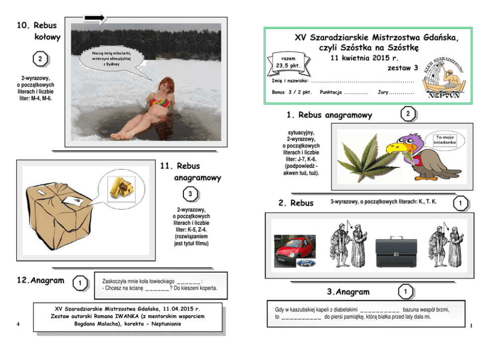 10. Rebus kołowy XV Szaradziarskie Mistrzostwa Gdańska, czyli Szóstka na Szóstkę 2 razem 23,5 pkt. 2-wyrazowy, o początkowych literach i liczbie liter: M-4, M-6. 11 kwietnia 2015 r. zestaw 3 Imię i nazwisko: ................................................... Bonus 3 / 2 pkt. Punktacja ............ 1. Rebus anagramowy 11. Rebus anagramowy Jury............. 2 sytuacyjny, 2-wyrazowy, o początkowych literach i liczbie liter: J-7, K-6. (podpowiedź akwen tuż, tuż). 3 2-wyrazowy, o początkowych literach i liczbie liter: K-5, Z-4. (rozwiązaniem jest tytuł filmu) 12.Anagram 4 1 Zaskoczyła mnie koła łowieckiego _ _ _ _ _ _ : - Chcesz na ścianę _ _ _ _ _ _ ? Do kieszeni koperta. XV Szaradziarskie Mistrzostwa Gdańska, 11.04.2015 r. Zestaw autorski Romana IWANKA (z mentorskim wsparciem Bogdana Malacha), korekta - Neptunianie 2. Rebus 3-wyrazowy, o początkowych literach: K., T. K. 3.Anagram 1 1 Gdy w kaszubskiej kapeli z diabelskimi _ _ _ _ _ _ _ _ _ _ bazuna wespół brzmi, to _ _ _ _ _ _ _ _ _ _ do piersi pamiątkę, którą białka przed laty dała mi. 1 4. Wirówka 3 2 6. Rebus metagramowy Początek wpisywania od pola z liczbą, druga litera w polu ze strzałką. Z liter w polach ponumerowanych od 1 do 8 można odczytać dodatkowe hasło. 1 2 2 8. Krzyżówka 2 1 1 W każdym odgadniętym wyrazie należy zmienić jedną literę, a rozwiązaniem jest tytuł opery. 3 4 2 5 3 8 4 7 6 5 1) noś go i przy pogodzie. 2) miasto w Czechach u ujścia Opawy. 3) państwo wyspiarskie na Oceanie Indyjskim, na północnywschód od Madagaskaru, ze stolicą w Victorii. 4) zdaje egzaminy w szkole, uczy się samodzielnie poza nią. 5) Mieczysław, poeta i eseista (skojarz z margerytką). 6) bywa z powyłamywanymi szczeblami. 7) prowizoryczny ścieg. 8) bez niego nie uda się romantyczna kolacja. 5. Rebus anagramowy 7.Kalamburki 0,5 pkt. za każdy kalambur (klasyczny) 9.Logogryf Będzie za nim, wtorek, środa i litera – pierwszy z członów implikacji wyjdzie teraz. 2 Ludolfina, gust estety – w tabloidzie pisze bzdety. Poziomo (kolejność przypadkowa): - 17:00 - 18:50 - 19:30 W szarych polach, czytając rzędami: - 18:00 Pionowo: 1) … Dunajca w Pieninach. 2) leżą samotnie przy talerzach na stole. 3) msza odprawiana w specjalnej intencji. 4) miasto w Teksasie z klubem hokejowym … Stars. 5) zawodowa specjalność aktora. Wędkarska Lolobrygida – Rzymianom wojnę wyda. (klasyczny) (klasyczny) jednowyrazowy, o początkowej literze i liczbie liter: R-11. W stoczni zwykle suchy, tudzież krótka moda – ma swój jarmark w Gdańsku – nic ująć, nic dodać. 2 1) buduje jachty. 2) gołowąsik, żółtodziobek (anagram: kłosikom). 3) członek grupy muzycznej stanowiący o jej wizerunku i rozpoznawalny przez fanów. 4) naczelny w gazecie. 5) wygrana w meczu bez grania meczu. 1 (szufladkowy) 2 3 Ma włoska wędlina dziwny wyraz twarzy – chętnie ją odwiedzę w czasie swych wojaży. 4 (wiązany) 5 3