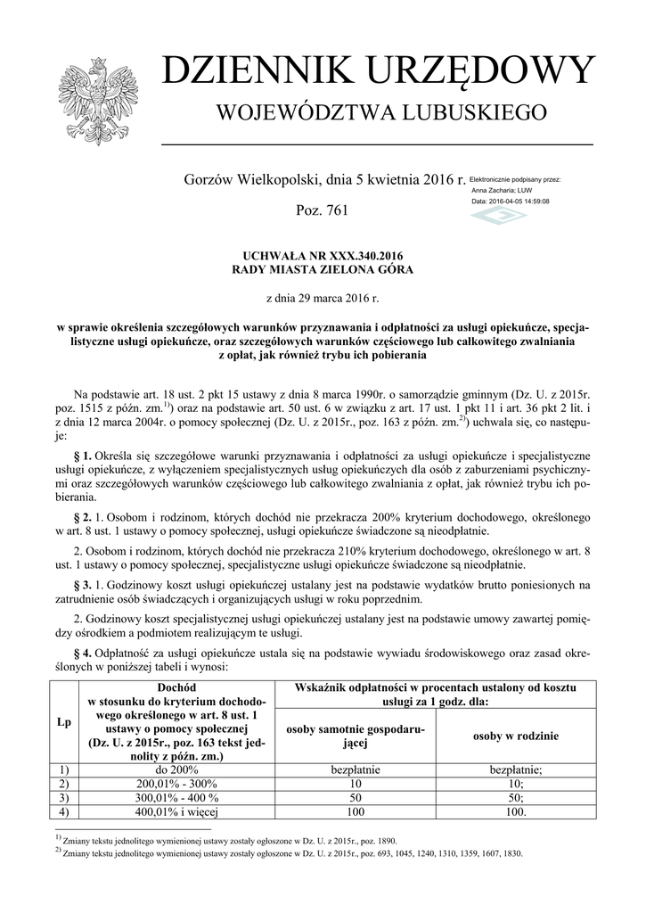 DZIENNIK URZĘDOWY WOJEWÓDZTWA LUBUSKIEGO Gorzów Wielkopolski, dnia 5 kwietnia 2016 r. Elektronicznie podpisany przez: Anna Zacharia; LUW Poz. 761 Data: 2016-04-05 14:59:08 UCHWAŁA NR XXX.340.2016 RADY MIASTA ZIELONA GÓRA z dnia 29 marca 2016 r. w sprawie określenia szczegółowych warunków przyznawania i odpłatności za usługi opiekuńcze, specjalistyczne usługi opiekuńcze, oraz szczegółowych warunków częściowego lub całkowitego zwalniania z opłat, jak również trybu ich pobierania Na podstawie art. 18 ust. 2 pkt 15 ustawy z dnia 8 marca 1990r. o samorządzie gminnym (Dz. U. z 2015r. poz. 1515 z późn. zm.1)) oraz na podstawie art. 50 ust. 6 w związku z art. 17 ust. 1 pkt 11 i art. 36 pkt 2 lit. i z dnia 12 marca 2004r. o pomocy społecznej (Dz. U. z 2015r., poz. 163 z późn. zm.2)) uchwala się, co następuje: § 1. Określa się szczegółowe warunki przyznawania i odpłatności za usługi opiekuńcze i specjalistyczne usługi opiekuńcze, z wyłączeniem specjalistycznych usług opiekuńczych dla osób z zaburzeniami psychicznymi oraz szczegółowych warunków częściowego lub całkowitego zwalniania z opłat, jak również trybu ich pobierania. § 2. 1. Osobom i rodzinom, których dochód nie przekracza 200% kryterium dochodowego, określonego w art. 8 ust. 1 ustawy o pomocy społecznej, usługi opiekuńcze świadczone są nieodpłatnie. 2. Osobom i rodzinom, których dochód nie przekracza 210% kryterium dochodowego, określonego w art. 8 ust. 1 ustawy o pomocy społecznej, specjalistyczne usługi opiekuńcze świadczone są nieodpłatnie. § 3. 1. Godzinowy koszt usługi opiekuńczej ustalany jest na podstawie wydatków brutto poniesionych na zatrudnienie osób świadczących i organizujących usługi w roku poprzednim. 2. Godzinowy koszt specjalistycznej usługi opiekuńczej ustalany jest na podstawie umowy zawartej pomiędzy ośrodkiem a podmiotem realizującym te usługi. § 4. Odpłatność za usługi opiekuńcze ustala się na podstawie wywiadu środowiskowego oraz zasad określonych w poniższej tabeli i wynosi: Lp 1) 2) 3) 4) 1) 2) Dochód w stosunku do kryterium dochodowego określonego w art. 8 ust. 1 ustawy o pomocy społecznej (Dz. U. z 2015r., poz. 163 tekst jednolity z późn. zm.) do 200% 200,01% - 300% 300,01% - 400 % 400,01% i więcej Wskaźnik odpłatności w procentach ustalony od kosztu usługi za 1 godz. dla: osoby samotnie gospodarującej osoby w rodzinie bezpłatnie 10 50 100 bezpłatnie; 10; 50; 100. Zmiany tekstu jednolitego wymienionej ustawy zostały ogłoszone w Dz. U. z 2015r., poz. 1890. Zmiany tekstu jednolitego wymienionej ustawy zostały ogłoszone w Dz. U. z 2015r., poz. 693, 1045, 1240, 1310, 1359, 1607, 1830. Dziennik Urzędowy Województwa Lubuskiego –2– Poz. 761 § 5. Odpłatność za specjalistyczne usługi opiekuńcze ustala się na podstawie wywiadu środowiskowego oraz zasad określonych w poniższej tabeli i wynosi: Lp. 1) 2) 3) 4) Dochód w stosunku do kryterium dochodowego określonego w art. 8 ust. 1 ustawy o pomocy społecznej (Dz. U. z 2015r., poz. 163 tekst jednolity z późn. zm.) do 210% 211% - 310% 311% - 410 % 411% i więcej Wskaźnik odpłatności w procentach ustalony od kosztu usługi za 1 godz. dla: Osoby samotnie gospodarujących Osoby w rodzinie bezpłatnie 10 50 100 bezpłatnie; 10; 50; 100. § 6. 1. Odpłatność za usługi opiekuńcze i specjalistyczne usługi opiekuńcze naliczana jest z dołu zgodnie z dokumentacją potwierdzającą liczbę godzin usług faktycznie zrealizowanych. 2. Odpłatność za świadczone usługi opiekuńcze, w ustalonych terminach, wnoszona jest co miesiąc do kasy lub na konto podmiotu realizującego usługi. 3. Odpłatność za świadczone specjalistyczne usługi opiekuńcze, w ustalonych terminach, wnoszona jest co miesiąc do kasy lub na konto Miejskiego Ośrodka Pomocy Społecznej w Zielonej Górze. § 7. 1. W szczególnie uzasadnionych przypadkach, zwłaszcza jeżeli żądanie zwrotu wydatków na udzielone świadczenie w całości lub części stanowiłoby dla osoby zobowiązanej nadmierne obciążenie finansowe, dyrektor ośrodka biorąc pod uwagę sytuację zdrowotną, rodzinną i mieszkaniową, na wniosek osoby zainteresowanej może częściowo lub całkowicie odstąpić od żądania zwrotu odpłatności. 2. Za szczególne przypadki uznaje się sytuacje, gdy: 1) świadczeniobiorca ponosi wydatki związane z leczeniem, rehabilitacją, opłatami mieszkaniowymi, zapewnieniem dodatkowej opieki, po uregulowaniu których na utrzymanie pozostaje kwota równa lub niższa od kryterium dochodowego osoby samotnie gospodarującej lub w przypadku osoby w rodzinie od kryterium dochodowego na osobę w rodzinie; 2) stan zdrowia świadczeniobiorcy wymaga przyznania dużej ilości godzin usług z powodu przewlekłej lub obłożnej choroby powodującej, iż odpłatność zagraża jego egzystencji; 3) usługi opiekuńcze w jednym gospodarstwie domowym sprawowane są na rzecz więcej niż jednej osoby, w tym co najmniej jednej przewlekle chorej; 4) nie ma możliwości wyegzekwowania odpłatności z uwagi na zmiany chorobowe wieku podeszłego; 5) świadczeniobiorca dotknięty zostaje zdarzeniem losowym. § 8. Do postępowań wszczętych w czasie obowiązywania dotychczasowej uchwały, o której mowa w § 9 i niezakończonych ostatecznie do dnia jej uchylenia, stosuje się przepisy niniejszej uchwały. § 9. Traci moc uchwała nr VII/27/2015 Pełniącego Funkcję Rady Miasta Zielona Góra z dnia 4 lutego 2015r. w sprawie określenia szczegółowych warunków przyznawania i odpłatności za usługi opiekuńcze, specjalistyczne usługi opiekuńcze, oraz szczegółowych warunków częściowego lub całkowitego zwalniania z opłat, jak również trybu ich pobierania (Dz. Urz. Woj. Lubus. z 2015r., poz. 256). § 10. Wykonanie uchwały powierza się Prezydentowi Miasta Zielona Góra. § 11. Uchwała wchodzi w życie po upływie 14 dni od dnia jej ogłoszenia w Dzienniku Urzędowym Wojewó