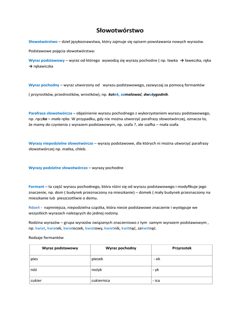 Słowotwórstwo Słowotwórstwo – dzieł językoznawstwa, który zajmuje się opisem powstawania nowych wyrazów. Podstawowe pojęcia słowotwórstwa: Wyraz podstawowy – wyraz od którego wywodzą się wyrazy pochodne ( np. ławka → ławeczka, ręka → rękawiczka Wyraz pochodny – wyraz utworzony od wyrazu podstawowego, zazwyczaj za pomocą formantów ( przyrostków, przedrostków, wrostków), np. kotek, zamalować, dwutygodnik. Parafraza słowotwórcza – objaśnienie wyrazu pochodnego z wykorzystaniem wyrazu podstawowego, np. rączka – mała ręka. W przypadku, gdy nie można utworzyć parafrazy słowotwórczej, oznacza to, że mamy do czynienia z wyrazem podstawowym, np. szafa ?, ale szafka – mała szafa. Wyrazy niepodzielne słowotwórczo – wyrazy podstawowe, dla których ni można utworzyć parafrazy słowotwórczej np. matka, chleb. Wyrazy podzielne słowotwórczo – wyrazy pochodne Formant – ta część wyrazu pochodnego, która różni się od wyrazu podstawowego i modyfikuje jego znaczenie, np. dom ( budynek przeznaczony na mieszkanie) – domek ( mały budynek przeznaczony na mieszkanie lub pieszczotliwie o domu. Rdzeń - najmniejsza, niepodzielna cząstka, która niesie podstawowe znaczenie i występuje we wszystkich wyrazach należących do jednej rodziny. Rodzina wyrazów – grupa wyrazów związanych znaczeniowo z tym samym wyrazem podstawowym , np. kwiat, kwiatek, kwiateczek, kwiatowy, kwietnik, kwitnąć, zakwitnąć. Rodzaje formantów Wyraz podstawowy Wyraz pochodny Przyrostek pies piesek - ek nóż nożyk - yk cukier cukiernica - ica Wyraz podstawowy Wyraz pochodny Przedrostek pisać napisać na - czytać przeczytać prze- kopać wykopać wy - Wyraz podstawowy Wyraz pochodny Przedrostek dwa tygodnie dwutygodnik -u- zlew + zmywak zlewozmywak -o- zawala drogę zawalidroga -i- Rodzina wyrazów Kot koc | isko kot | ek kot | eczek kot | ka kot | ić się o | kocić się