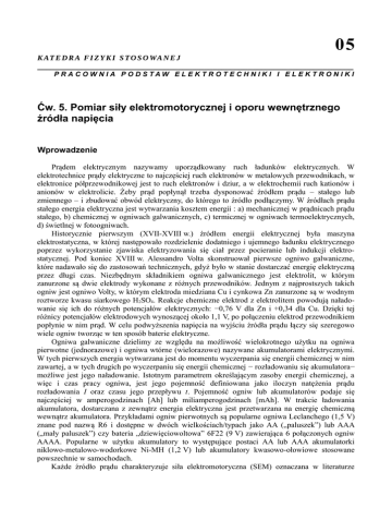 05 K AT E D R A F I Z Y K I S T O S O WA N E J ________________________________________________________________________ P R A C O W N I A P O D S TAW E L E K T R O T E C H N I K I I E L E K T R O N I K I Ćw. 5. Pomiar siły elektromotorycznej i oporu wewnętrznego źródła napięcia Wprowadzenie Prądem elektrycznym nazywamy uporządkowany ruch ładunków elektrycznych. W elektrotechnice prądy elektryczne to najczęściej ruch elektronów w metalowych przewodnikach, w elektronice półprzewodnikowej jest to ruch elektronów i dziur, a w elektrochemii ruch kationów i anionów w elektrolicie. Żeby prąd popłynął trzeba dysponować źródłem prądu ‒ stałego lub zmiennego ‒ i zbudować obwód elektryczny, do którego to źródło podłączymy. W źródłach prądu stałego energia elektryczna jest wytwarzania kosztem energii : a) mechanicznej w prądnicach prądu stałego, b) chemicznej w ogniwach galwanicznych, c) termicznej w ogniwach termoelektrycznych, d) świetlnej w fotoogniwach. Historycznie pierwszym (XVII-XVIII w.) źródłem energii elektrycznej była maszyna elektrostatyczna, w której następowało rozdzielenie dodatniego i ujemnego ładunku elektrycznego poprzez wykorzystanie zjawiska elektryzowania się ciał przez pocieranie lub indukcji elektrostatycznej. Pod koniec XVIII w. Alessandro Volta skonstruował pierwsze ogniwo galwaniczne, które nadawało się do zastosowań technicznych, gdyż było w stanie dostarczać energię elektryczną przez długi czas. Niezbędnym składnikiem ogniwa galwanicznego jest elektrolit, w którym zanurzone są dwie elektrody wykonane z różnych przewodników. Jednym z najprostszych takich ogniw jest ogniwo Volty, w którym elektroda miedziana Cu i cynkowa Zn zanurzone są w wodnym roztworze kwasu siarkowego H2SO4. Reakcje chemiczne elektrod z elektrolitem powodują naładowanie się ich do różnych potencjałów elektrycznych: −0,76 V dla Zn i +0,34 dla Cu. Dzięki tej różnicy potencjałów elektrodowych wynoszącej około 1,1 V, po połączeniu elektrod przewodnikiem popłynie w nim prąd. W celu podwyższenia napięcia na wyjściu źródła prądu łączy się szeregowo wiele ogniw tworząc w ten sposób baterie elektryczne. Ogniwa galwaniczne dzielimy ze względu na możliwość wielokrotnego użytku na ogniwa pierwotne (jednorazowe) i ogniwa wtórne (wielorazowe) nazywane akumulatorami elektrycznymi. W tych pierwszych energia wytwarzana jest do momentu wyczerpania się energii chemicznej w nim zawartej, a w tych drugich po wyczerpaniu się energii chemicznej − rozładowaniu się akumulatora− możliwe jest jego naładowanie. Istotnym parametrem określającym zasoby energii chemicznej, a więc i czas pracy ogniwa, jest jego pojemność definiowana jako iloczyn natężenia prądu rozładowania I oraz czasu jego przepływu t. Pojemność ogniw lub akumulatorów podaje się najczęściej w amperogodzinach [Ah] lub miliamperogodzinach [mAh]. W trakcie ładowania akumulatora, dostarczana z zewnątrz energia elektryczna jest przetwarzana na energię chemiczną wewnątrz akumulatora. Przykładami ogniw pierwotnych są popularne ogniwa Leclanchego (1,5 V) znane pod nazwą R6 i dostępne w dwóch wielkościach/typach jako AA („paluszek”) lub AAA („mały paluszek”) czy bateria „dziewięciowoltowa” 6F22 (9 V) zawierająca 6 połączonych ogniw AAAA. Popularne w użytku akumulatory to występujące postaci AA lub AAA akumulatorki niklowo-metalowo-wodorkowe Ni-MH (1,2 V) lub akumulatory kwasowo-ołowiowe stosowane powszechnie w samochodach. Każde źródło prądu charakteryzuje siła elektromotoryczna (SEM) oznaczana w literaturze symbolem E lub e. Odpowiada ona energii elektrycznej W przekazanej przez źródło ładunkowi jednostkowemu podczas jego pełnego obiegu po obwodzie zamkniętym w skład którego wchodzi to źródło. Dla dowolnego ładunku q, który wykonał taki obieg, SEM jest zdefiniowana następująco: W E= . (1) q Oznacza to, że SEM mierzymy w jednostkach J/C czyli w woltach. Siłę elektromotoryczną możemy określić w bardziej praktyczny sposób niż ten podany równaniem 1. Jest ona równa różnicy potencjałów, czyli napięciu U, między zaciskami ogniwa mierzonym woltomierzem o bardzo dużym oporze (teoretycznie nieskończenie dużym) tak, że podczas pomiaru przez ogniwo nie płynie prąd. Gdy przez ogniwo płynie prąd o natężeniu I, obserwujemy mniejsze napięcie między zaciskami ogniwa zgodnie z zależnością: U =E− IRw . (2) Powyższe równanie wynika z II prawem Kirchhoffa jak pokazane jest to poniżej w punkcie Metoda pomiaru. Jak pokazuje równanie 2, spadek napięcia na zaciskach źródła prądu wynika z występowania oporu wewnętrznego Rw źródła przez który płynie prąd I. Ilustruje to poniżej model/schemat ogniwa. Rys. 1. Schemat ogniwa. Linia przerywana oznacza fizyczne granice ogniwa, a znaki + i – polaryzację napięcia na jego zaciskach. Podczas gdy siła elektromotoryczna ogniwa galwanicznego zależy od rodzaju elektrod, stężenia elektrolitu i jego temperatury, opór zależy głównie od wielkości tego ogniwa, jego temperatury oraz stopnia jego rozładowania. Na początku eksploatacji jest on niewielki, np. rzędu kilku omów, by pod koniec wzrosnąć nawet do kilkudziesięciu omów. Zgodnie z równaniem 2, podczas przepływu takiego samego prądu rozładowania I obserwujemy duży spadek napięcia U na zaciskach wyczerpanych ogniw, gdyż na tak dużym oporze wewnętrznym spadek napięcia URw = IRw jest teraz wielokrotnie większy. Metoda pomiaru Pomiar siły elektromotorycznej E jest możliwy kilkoma sposobami. Ten zastosowany w ćwiczeniu umożliwia jednocześnie pomiar oporu wewnętrznego Rw. Zastosowana tu metoda polega na sporządzenia charakterystyki źródła w postaci zależności napięcia U na zaciskach ogniwa w funkcji natężenia prądu I płynącego przez to źródło. Zgodnie z II prawem Kirchhoffa dla obwodu pokazanego na Rys. 1 zachodzi równ